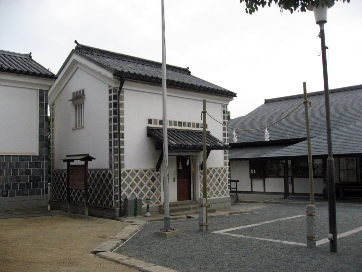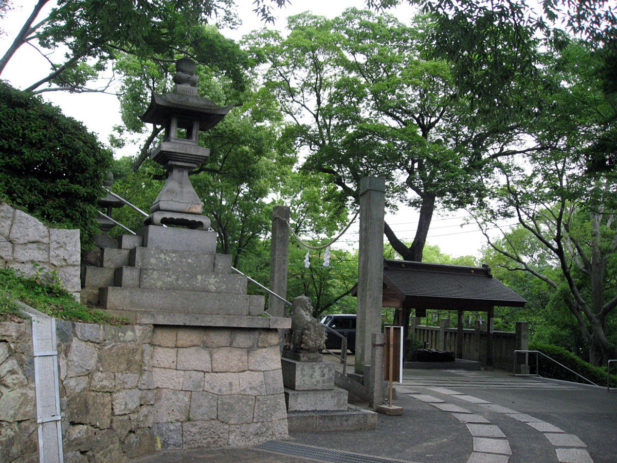 『応神朝に朝鮮半島より渡ってきた漢の霊帝の曾孫、阿知使主(あちのおみ)一族。彼等は「石」「鉄」「織」等の先進文化を担う技術集団として、吉備国の繁栄の礎を築き、当時、島(亀島)であったこの鶴形山に神々の天降られる斎場として、日本最古の蓬莱様式の古代庭園を造ったと伝えられている。白壁の蔵の町、倉敷美観地区の一角にある鶴形山の頂上に鎮座する当社は、この阿知使主一族の大いなる功績を称え、明治時代に現社名になったが、社伝によると神功皇后がこの付近を航行の折、嵐に遭い祈願されたところ、三振の剣が天空より明るく輝いてこの山に天下ったため、「明剣宮」として、宗像三女神をお祀りしたとされている。中世、仏説と混同し、明治までは「妙見宮」と称され、旧倉敷総鎮守の宮として近郷近在の人々の尊崇を集めてきた。祭神の宗像三女神は皇祖神、天照大御神と素盞鳴尊の娘神で、海の守護神であり、交通交易、財宝、芸術、美の神でもある。その他、応神天皇を始め、約三十柱の神々をお祀りしている。また山には神々をお斎りする磐坐(いわくら)が点在し、古代から神の島として崇められてきたと思われる。』