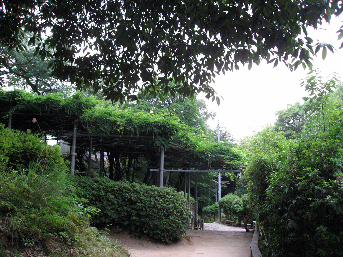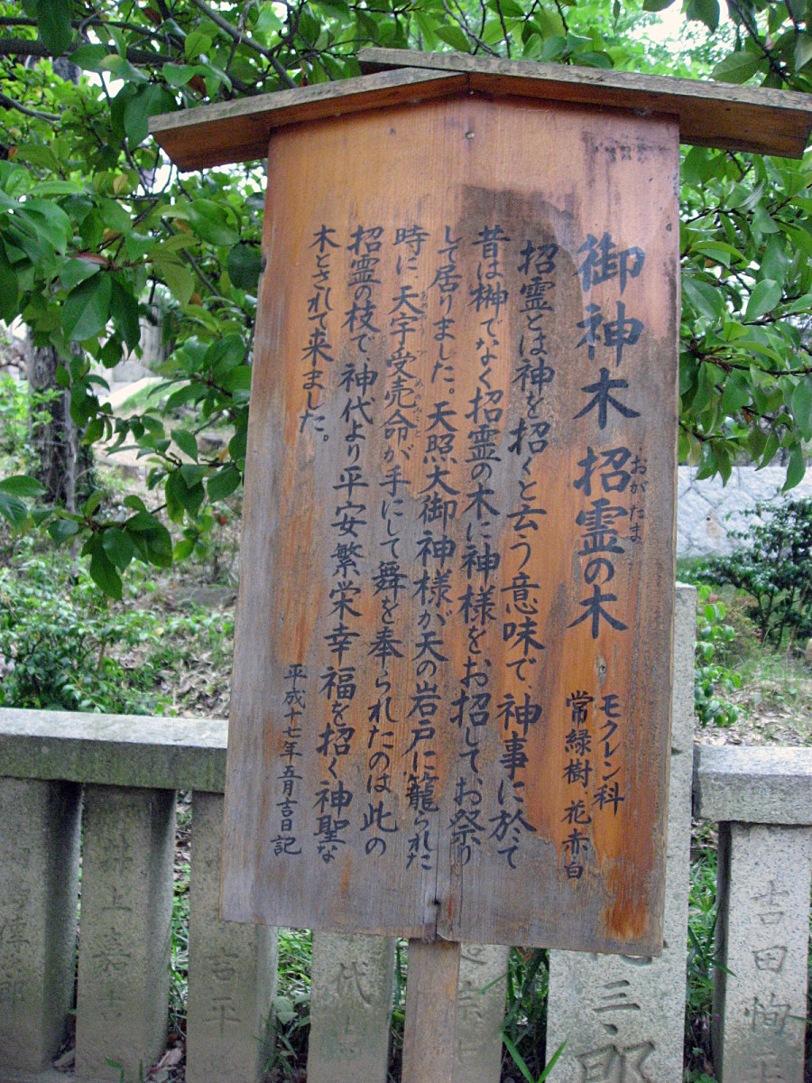 『岡山県天然記念物「阿知の藤」は、アケボノフジという珍種である。根回り約1.5m、根元周囲約2.2mで、同種の藤としては全国一の巨樹とされている。20m四方に枝を広げ、淡紅色の花が大藤棚一面に咲き誇る様は可憐でいて、見応えがある。この藤は、鶴形山の真北に位置する福山で、太平記にある「福山の戦」があった時、敵勢三万に対し、地元勢千五百人が三日間善戦し全滅したことから、慰霊の為に再生のシンボルとしてアケボノフジ(不死、不二につながる)を植えたのではないかという説もある。樹齢については、藤には年輪が無いため諸説がありますが、阿知の藤は県の天然記念物指定当時の調査によると、300から500年といわれています。(樹木医・山本利幸氏診断)老木のため寄る年波には勝てず、一時は枯死寸前に陥ったこともあったが、地元住民らの働きかけで治療を施したことにより樹勢が回復した。今では毎年4月下旬から5月5日の藤祭りに藤棚の下、和楽の演奏やお茶席が出て、多くの人で賑っている。』