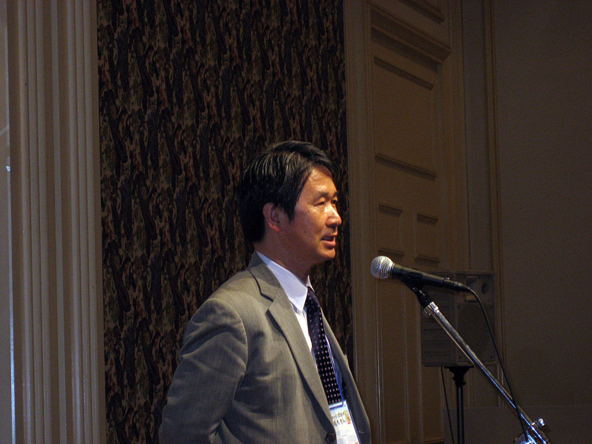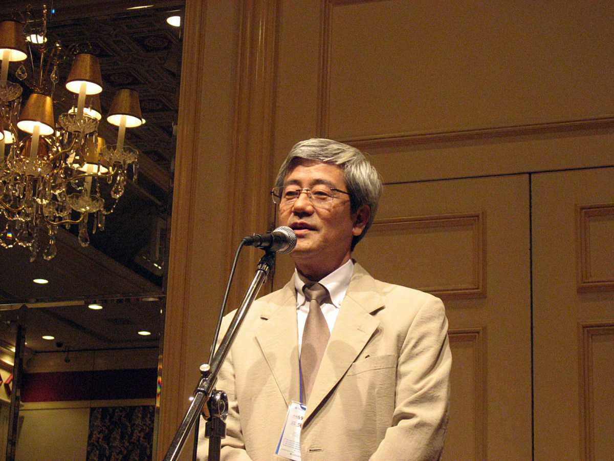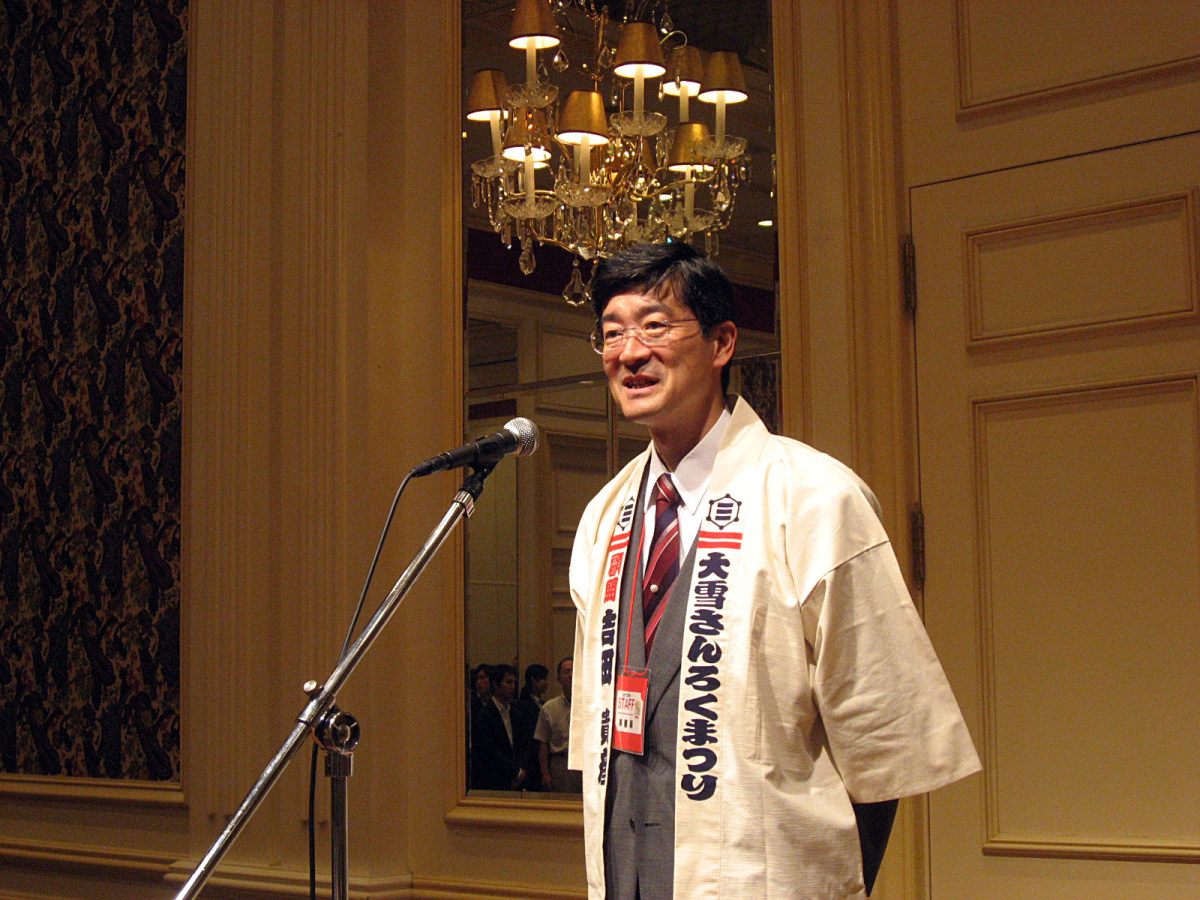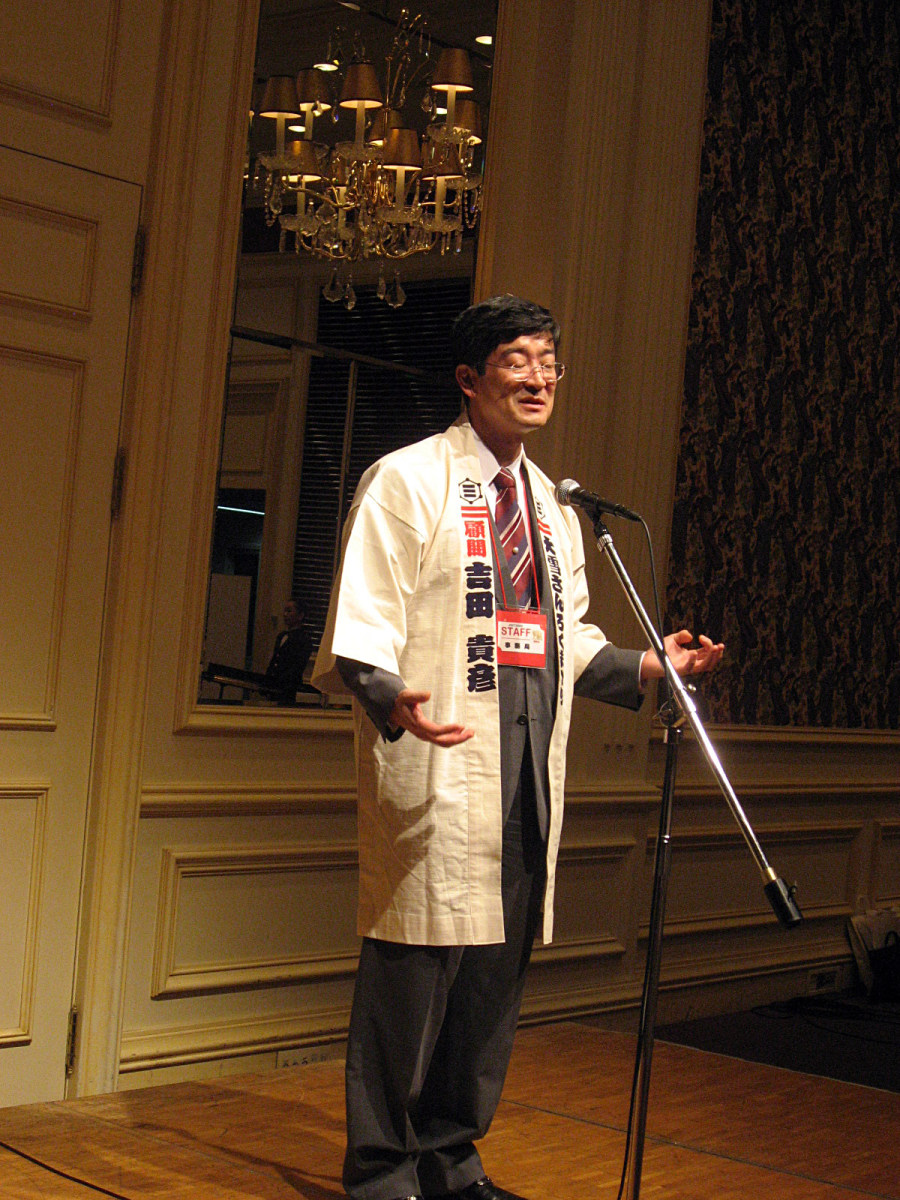 | 2009.8.27. 第16回日本免疫毒性学会学術大会の懇親会( 吉田先生の年会長としてのご挨拶 この衣装はなかなかすごいっすね!!大雪さんろくまつり・・・で,お名前入りの法被です。 で,さんろくは山麓にあらず,3条6丁目で,繁華街の名前だそうですが・・・。 夏祭りの様です。 澤田日本免疫毒性学会理事長 森本日本産業衛生学会・アレルギー免疫毒性研究会代表世話人のご挨拶の後, 大沢前日本免疫毒性学会理事長の乾杯の音頭です。 途中,国際化委員会の委員長の中村先生の紹介で,来賓っていうか,Dr. Germolec,Dr. Zelikoff のスピーチもありました。