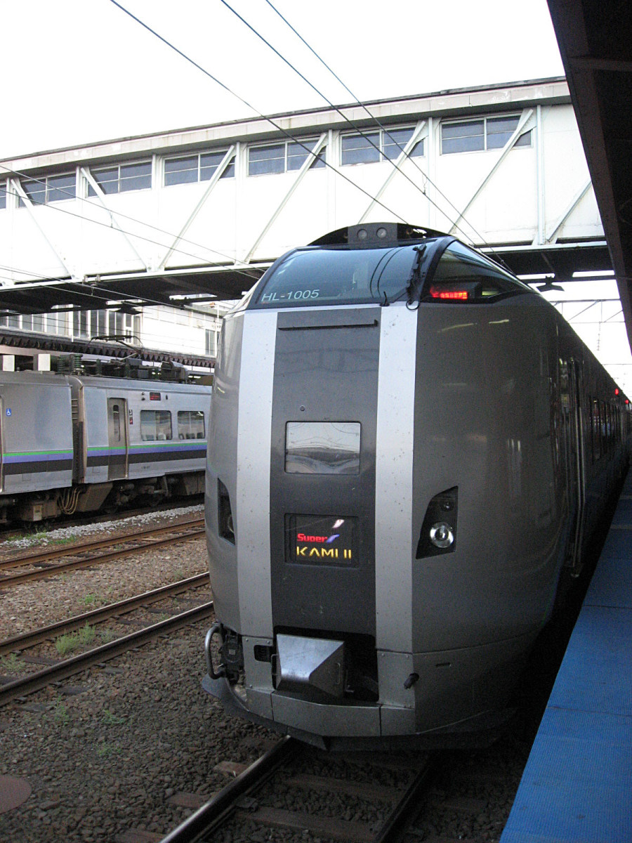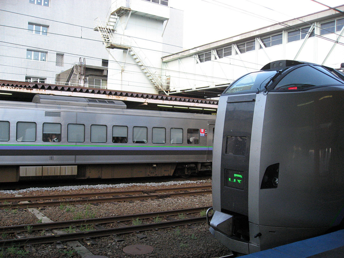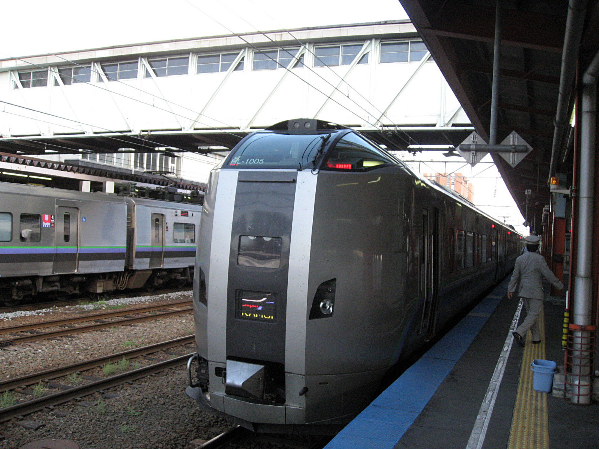 乗車したスーパーカムイです,格好いい!・・・線路向うは新千歳直行特急です。
