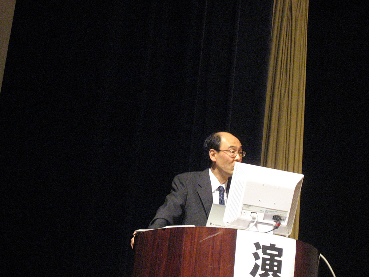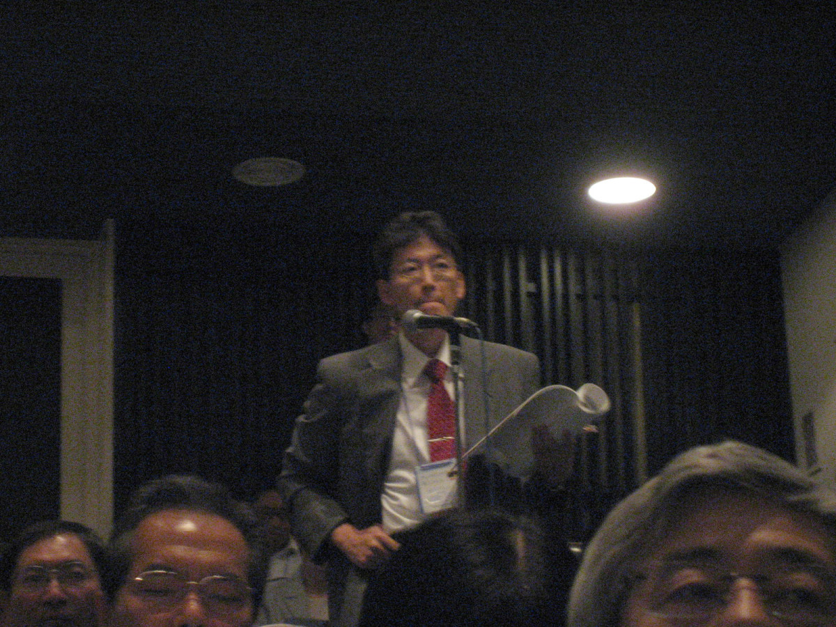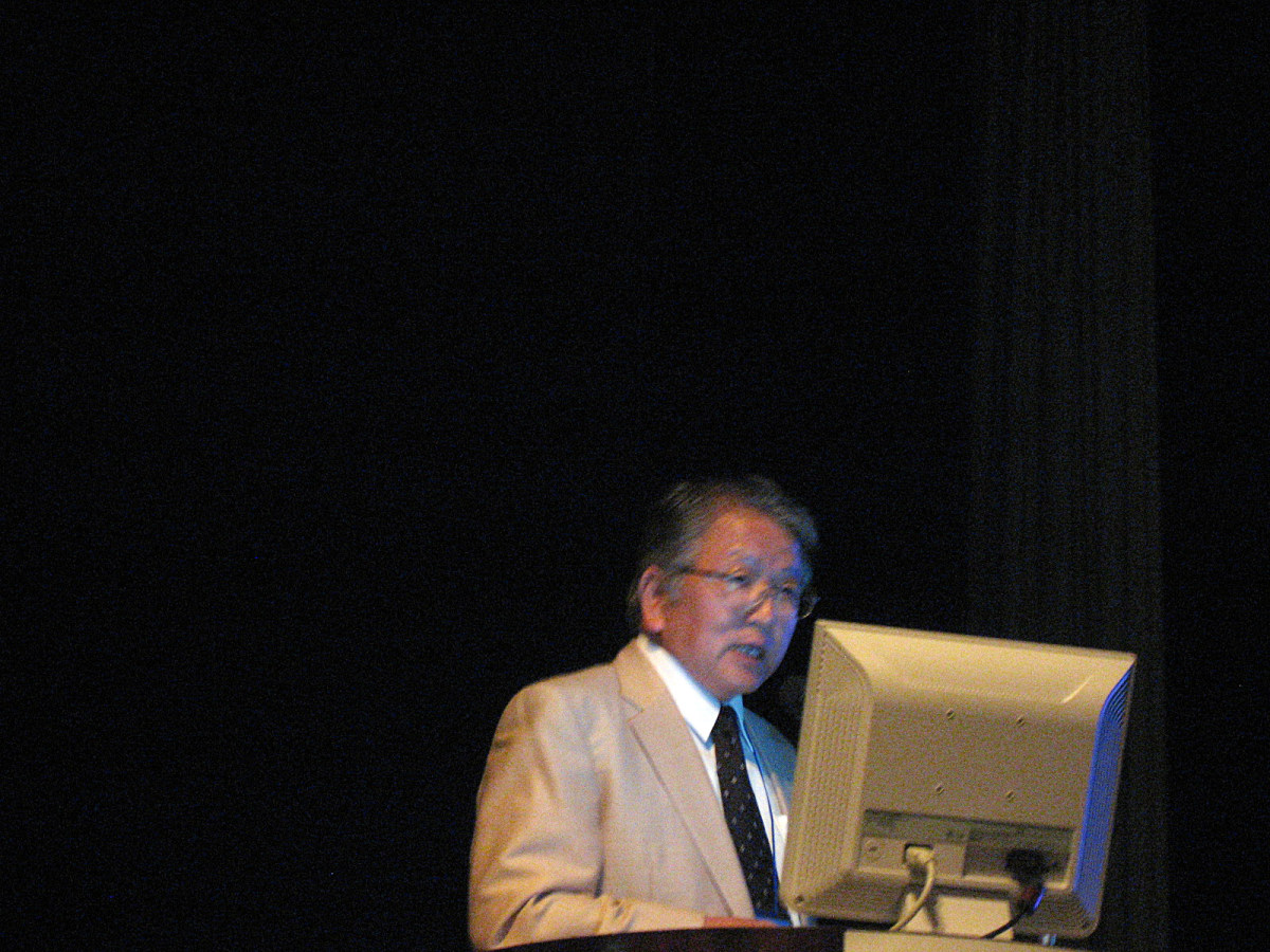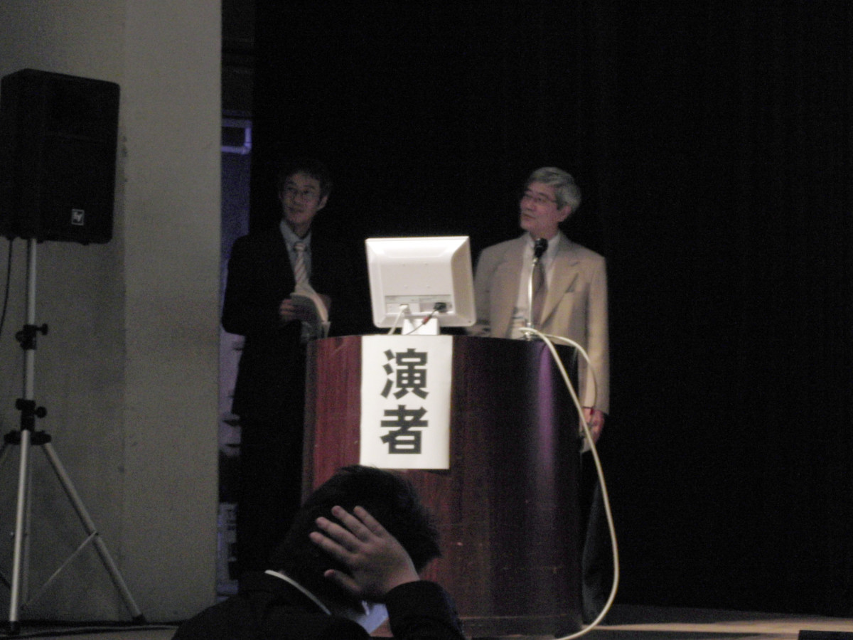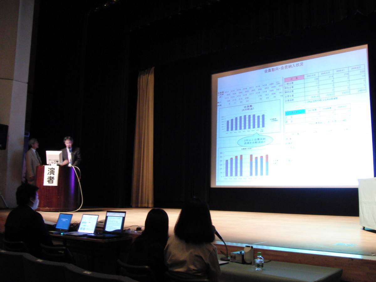 そうそう,1日目には総会が午後一番でありました。 これがまた,事務局としてみれば,滞りなく終了するかどうかってのが,大問題! 時間も限られていますし・・・,大変です。 座長は吉田先生,理事長の澤田先生と大槻は檀上で発言します。 次期会長の藤巻先生が最後を締めて下さいました。 |