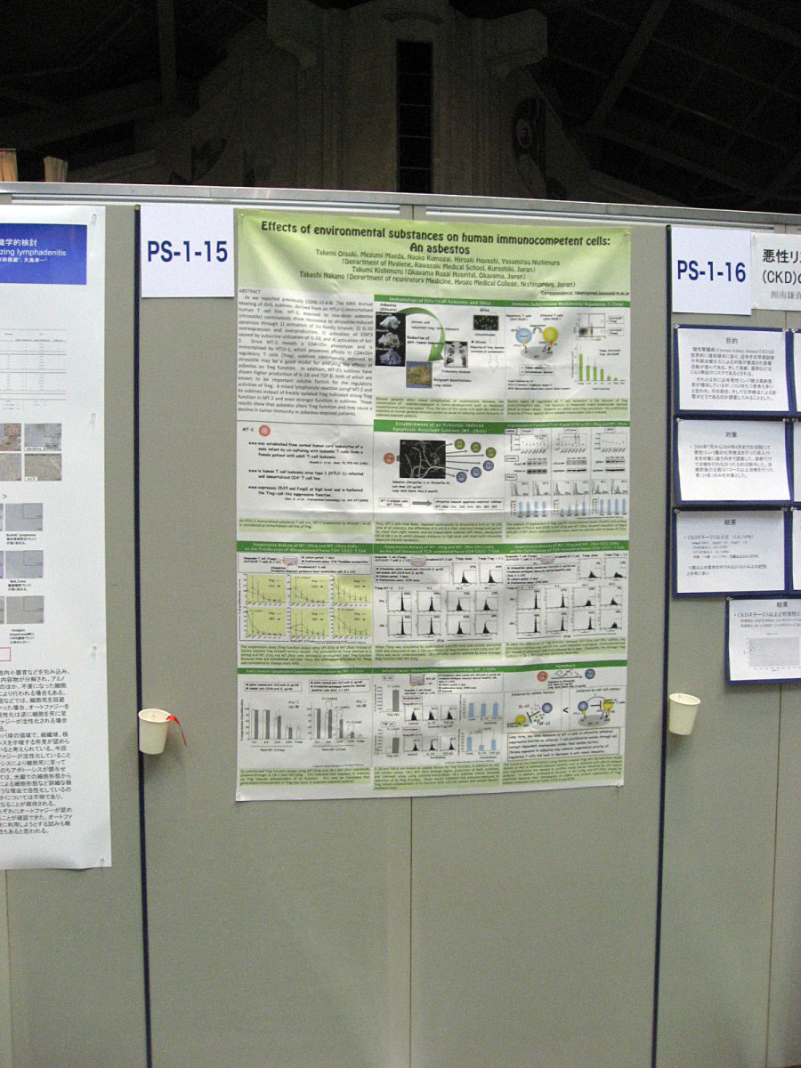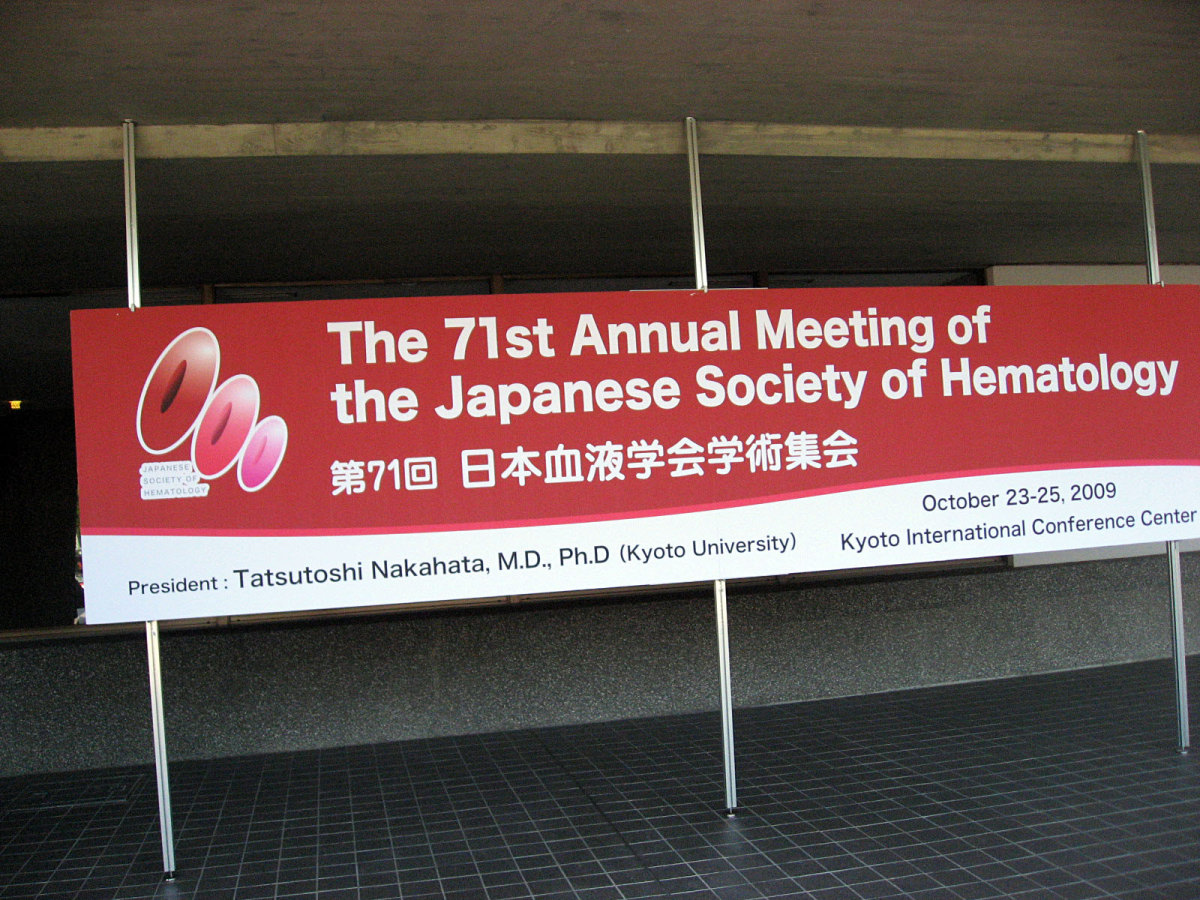 | 2009.10.23-24 日本血液学会・学術集会に参加してきました。 今年度は発表もしました。 今回は,旭川での日本免疫毒性学会で知り合った紫連隊さん にお願いしました。 布地のポスターにしました。 紙ベースでするより3倍くらい高いですが,持ち運びが楽! そして,貼るのも画鋲4つでOK! そして,見栄えもいいです。 感謝! 感謝! (ご興味の方は,上記リンクからご連絡ください) しかし,以前に比べて企業ブースはすごく豪勢! 外科系の学会みたい!!! コンパニオンのお姉さんもたくさんだし,コーヒーやアイスもあるし・・・すごいっす! ついでに,自動販売機の中を見る機会があったので,思わずパチリ!でした。 さて,宝が池,国際会館の周りの秋を散策しました。 秋晴れの好天,朝晩は寒くなってきましたが・・・昼間は歩いているとちょっと汗ばむくらいです。 白鳥もいつもd出会いますが,今日は・・なんか水中の何かを必死で食べている様子でした。 そして,周囲は,足早な秋が・・木々の葉の色付く様子に感じられます。 木漏れ日に映える黄色い葉が,少し切ない秋です。 宝が池・・会場から,そのまま出るだけで,これだけ季節を感じさせてくれるのもいいですね,いつもながら・・・。 ぐるりと回りました。 駐車場の方も,良い具体の紅葉です・・。 少し北で高いってことでしょうね・・・。 そういえば,こんな高い塔もありますよね・・・。 去年,日本免疫学会で12月初めに訪れた時は,もっと紅が素晴らしかったですが,今の,黄色が始まっているのも,なかなか,季節の足音を感じさせてくれます。 あっ,そうそう,写真を撮り忘れました・・・。 三浦由恵先生,井上信正先生,矢野尊啓先生とも出会いました。 矢野先生とは本当に久しぶりに話しました。 今回は,dr. Jaffe も来ていたそうです・・・あらぁ・・出会えればよかったのに・・ 勿論,血液内科,検査診断の面々ともお出会いしましたよ!! さて,土曜日は・・・。 まずは,午前中は,日本衛生学会和文誌編集委員長の仕事として,中西印刷さんにお出会いして,編集業務等々の打ち合わせをしました。 それまで・・鴨川沿い・・それから,京都御苑を散策しました。 三条より北の方・・鴨川の西に,みそ々ぎ川・・・って疏水かと思いますが,並行して流れています。 鳥たちも・・・ そして鴨川の流れです・・・。 河畔には・・花々・・これは桜??? ちょっと季節感が狂うような・・。 京都府立医科大学の周囲を歩きました。 ------------------------------------------------ 御所の方へ行く途中・・ 護浄院さんです。 【護浄院。常施無畏寺と号し、天台宗の寺。通称は清荒神(きよしこうじん)。本尊の清三宝大荒神は千二百余年前、光仁天皇の皇子、開成親王の作といわれ、摂津の国にあったのを後小松天皇の勅により僧乗厳が醒ヶ井高辻の地に 勧請し、初めて清荒神といわれた。 その後、慶長五年(1600年)現在の地に移され、後陽成天皇御自作の如来荒神尊七体をあわせ祀って長日の御祈願を行い、元禄十年護 浄院の院号を賜り今日に至る。また、一般の家庭では、かまどの上に祀られ火の守護神とされる。尊天堂内に安置される福徳恵美寿神はもと禁裏に奉安せられていたが、明治維新に際しここに移され、京都七福神の一に数えられ、世に尊信が高い。なお、荒神町の地名はここより起こったものという。】 とのことです。 ======================== 寺町御門から・・・入らせていただきました。 運動場ではソフトか野球か・・・歓声が響いていました。 大宮御所,仙洞御所の壁づたいに・・・中の方へ・・・。