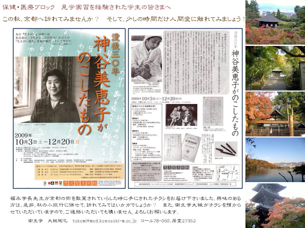 椋の木 修学旅行生?? 近づいて,警報がなってましたよ!! おいおい!! 白雲神社があります。 【御祭神は妙音弁財天と称え市杵島姫命を祀る。琵琶を家職とする西園寺家に楽神として伝えられ太政大臣西園寺公経卿北山第(京都衣笠大北山の西北、現在の金閣寺がその旧址である)の造営にあたり妙音堂を第一に建立、元仁元年(1224)12月 別当成就心院に回向せしめ皇后邦子内親王(安嘉門院)臨御せられたのを奉斎の始めとする。増鏡、中務内侍日記、太平記等に当時の風雅なたたずまいがうかがわれるがその後同家の盛衰に伴い変遷あり近古には赤八幡京極寺に鎮座されたと伝えられる。明和6年(1769)前内大臣西園寺公晃卿、前右大臣西園寺賞季卿勅許を賜り同家邸内(当地)に妙音堂を再興、天保11年(1840)安政4年(1857)の社殿修築に際しては禁中各御所より御寄付を賜り禁裏御祈祷所と定められた。 明治から昭和にかけて首相あるいは元老として近代日本の礎を築いた西園寺公望卿が家塾「立命館」を開設したのもこの地である。明治11年(1878)神仏混淆の作法を神式に改め社号を白雲神社とする。御神徳あらたかなる霊社として崇敬者は京都府下は元より近畿一円にあまねく。】 ということでした。 なかなか,広い敷地ですしね・・・。 秋を探しながら・・・ そして出水の小川沿いに歩きます。 【南西部の出水の小川は、母子で水にふれあう場として整備された100mほどの人工の小川です。 地下からくみ上げた井戸水が、深さ数センチメートルの浅い小川となって木陰を流れ、夏には水遊びをする子供達の人気スポットです。 水辺にはさまざまな動植物も見られて、また、周辺には桜が植えられて桜の見どころの一つにも なっています。】 でした,確かに! 〜〜〜〜〜〜〜〜〜〜〜〜〜〜 さて,下立売御門から京都府庁の方に(中西印刷さんは,府庁のすぐ西側です)向かいましょう! *-*-*-*-*-*-*-*-*-*-*-* 聖アグネス教会・・・が,目の前にありまして・・・秋が色付いていました。 しばらく後に前を歩くと・・中で結婚式・・・でも,新婦は和装だったような・・・ _/_/_/_/_/_/_/_/_/_/_/_/_/_/_/_/_/_/ すぐ横には・・・菅原院天満宮さんです・・。産湯の井戸だそうです! 【 菅原院天満宮神社は、地下鉄「丸太町駅」を出て烏丸通(西側)を北へ徒歩3分ほど。京都御苑の下立売御門の向かい側にある。この地は、菅原道真の曽祖父・菅原古人(ふるひと)の邸宅「菅原院」であったところ。祭神の菅原道真の父是善(これよし)ら曽祖父以来三代が住まったところとされ、石鳥居横に「菅家邸址」の石碑が建つ。菅原道真(みちざね)はこの邸宅で誕生したと言われ、境内社務所の北に「菅公御産湯の井」(菅大臣神社にもある)という石碑と共に井戸があるが、井戸は見る限り比較的新しい。菅原院は道真が亡くなったあと、歓喜光院となったが、後に六条道場(六条河原院)へ移している。その後、この地に菅原道真公を本座とし相殿に父是善卿を奉祀して菅原院天満宮を創建し今日に至る。本殿南には「天満宮御遺愛の灯籠」の石碑と共に、道真遺愛の石灯籠が残されている。境内にはガン封じにご利益があるという「梅丸大神」、天満宮にはつきものの牛、合格祈願の絵馬も祀られていた。】 とのことです。 この井戸です。 なるほど・・・ 賢くなれるかな??? 学問の神様だし・・・。 平安女学院の前を抜けていきますが・・ こんな・・・ |_|_|_|_|_|_|_|_|_|_|_|_|_|_|_|_|_|_| さて,中西印刷さんと打ち合わせして・・・午後は思文閣美術館で講演を聞きました。 実はこのチラシを福永学長先生から頂戴しまして・・・学生さんにも以下のような案内を出していたのです。 そして,うまく京都の出向く日程で,講演会・・・予約して,拝聴しました。 神谷美恵子先生とご一緒に長島愛生園や邑久光明園でも精神科医として働かれた茨木病院理事長の高橋先生のご講演でした。 ハンセン病自体の話,入所者の悲しい歴史も踏まえて,そこにどのように神谷先生たちが向き合っておられたか・・・。 また,そういうことが僕らがしている見学・実習にも活かせるようになればと,感動して聞かせていただきました。 ありがとうございました。 |