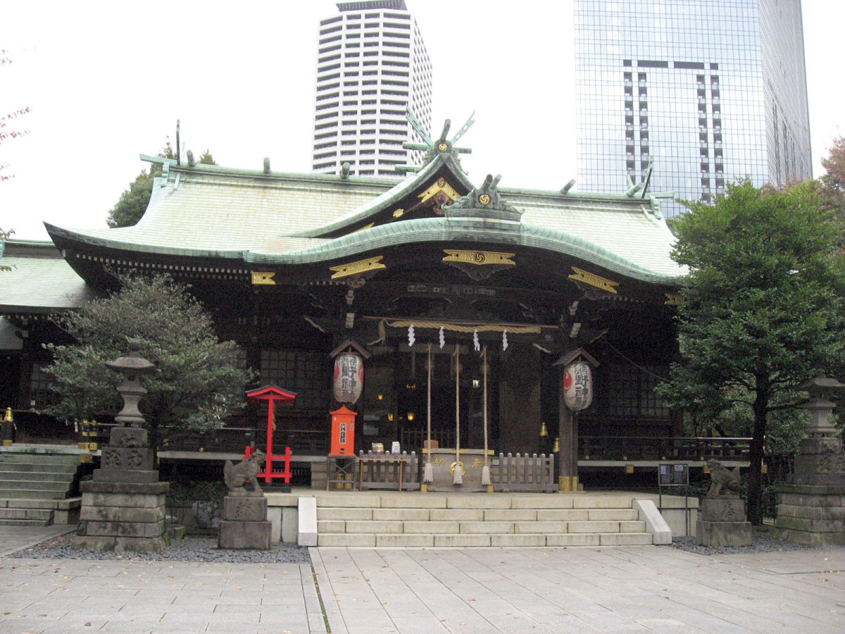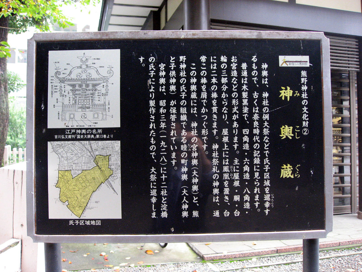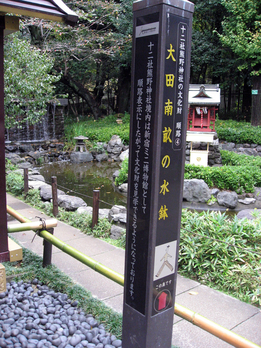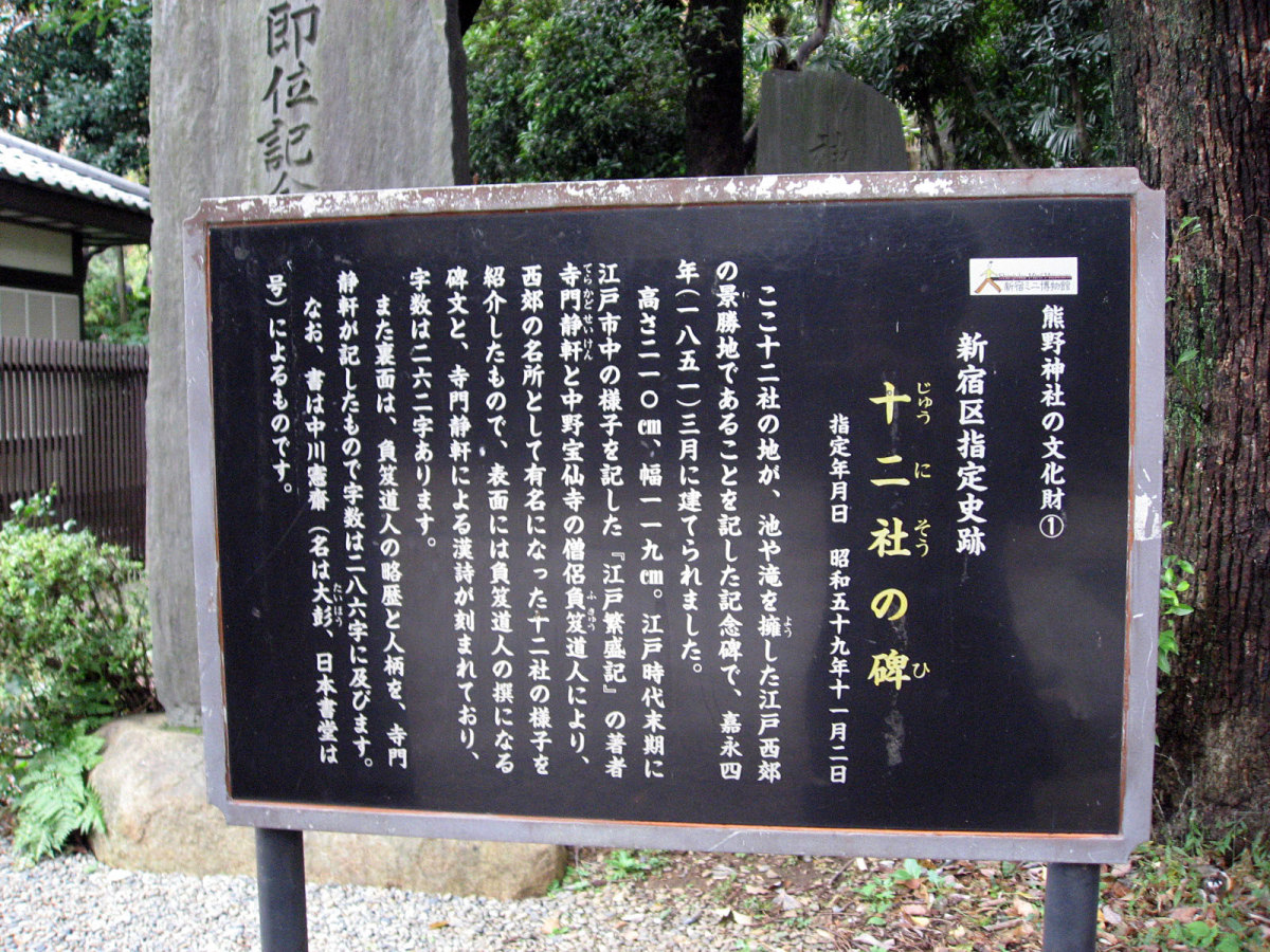 【十二社熊野神社は、室町時代の応永年間(1394〜1428)に中野長者と呼ばれた鈴木九郎が、故郷である紀州の熊野三山より十二所権現をうつし祠ったものと伝えられます(一説に、この地域の開拓にあたった渡辺興兵衛が、天文・永禄年間(1532〜69)の熊野の乱に際し、紀州よりこの地に流れ着き、熊野権現を祠ったともいいます)。鈴木家は、紀州藤代で熊野三山の祠官をつとめる家柄でしたが、源義経に従ったため、奥州平泉より東国各地を敗走し、九郎の代に中野(現在の中野坂上から西新宿一帯)に住むようになりました。九郎は、この地域の開拓にあたるとともに、自身の産土神である熊野三山より若一王子宮を祠りました。その後鈴木家は、家運が上昇し、中野長者と呼ばれる資産家になったため、応永10年(1403)熊野三山の十二所権現すべてを祠ったといいます。江戸時代には、熊野十二所権現社と呼ばれ、幕府による社殿の整備や修復も何回か行われました。また、享保年間(1716〜1735)には八代将軍吉宗が鷹狩を機会に参拝するようになり、滝や池を擁した周辺の風致は江戸西郊の景勝地として賑わい、文人墨客も多数訪れました。明治維新後は、現在の櫛御気野大神・伊邪奈美大神を祭神とし、熊野神社と改称し現在にいたっています。氏子町の範囲は、西新宿ならびに新宿駅周辺及び歌舞伎町を含む地域で、新宿の総鎮守となっています。】