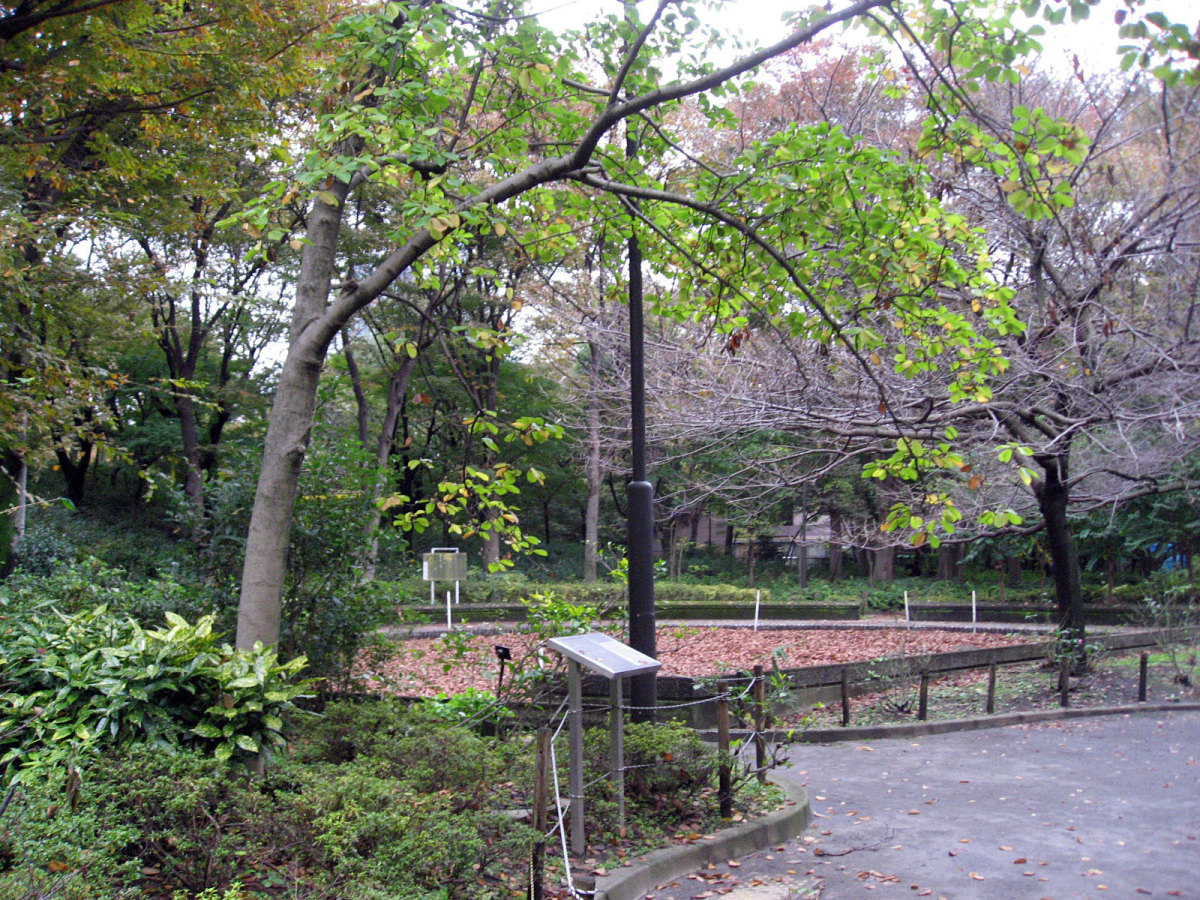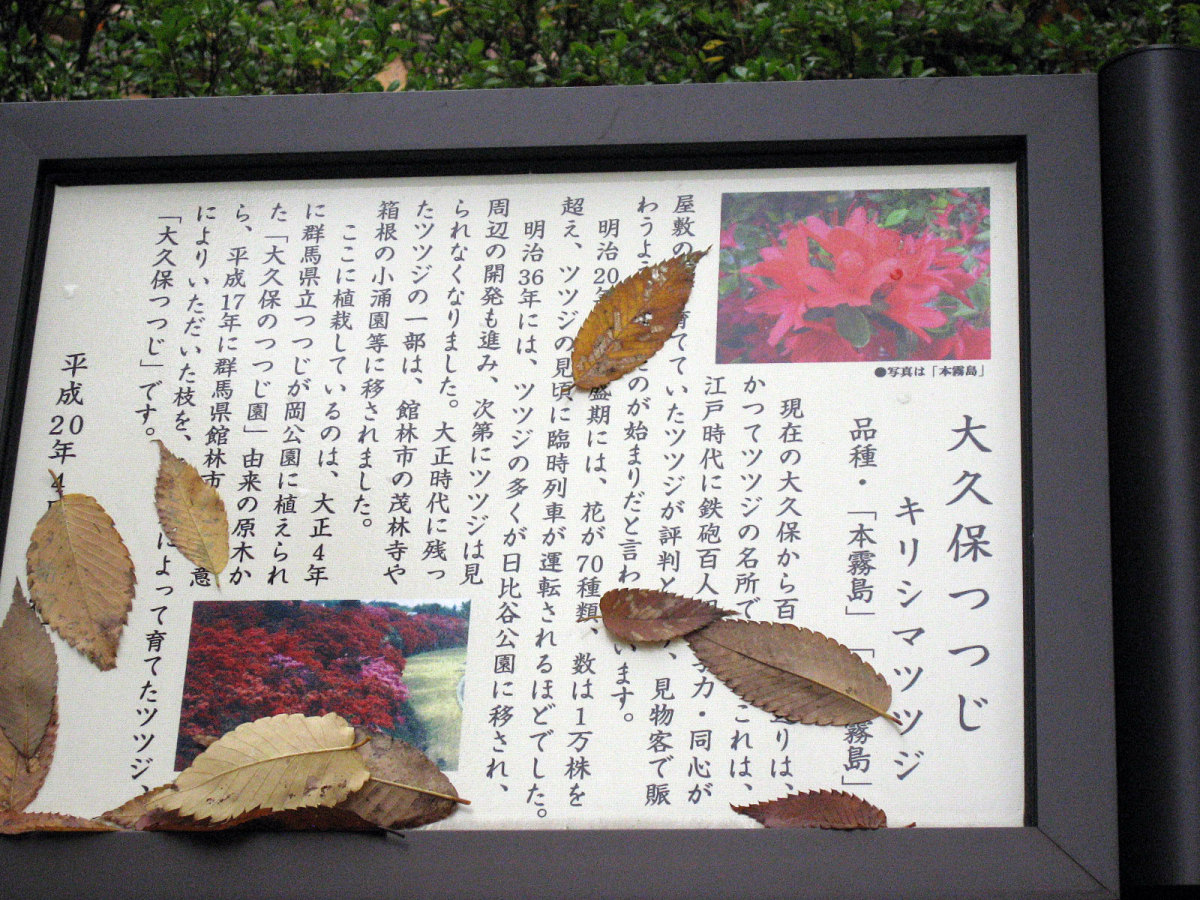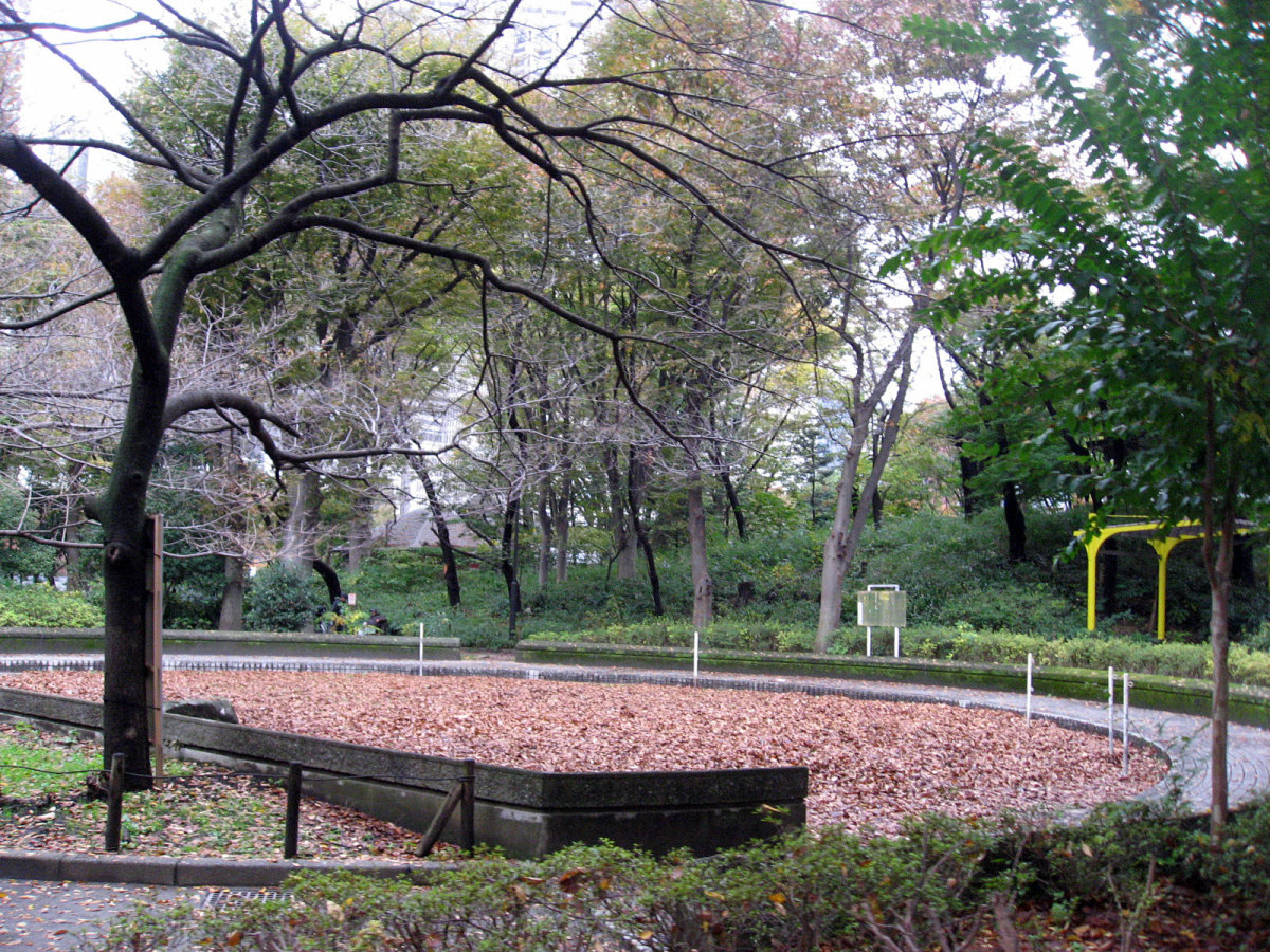 【十二社には、記録や古老の話からいくつかの滝があったことが伝えられています。このうち十二社の大滝は、『江戸名所図会』『江戸砂子』などに熊野の滝・萩の滝と記された滝で、高さ三丈・幅一丈と伝えられます。この滝は寛文7年(1667)に神田上水の水量を補うため玉川上水から神田上水に向け作られた神田上水助水堀が、熊野神社の東端から落ちるところにできたものです。池とともに景勝地として知られたもので、明治時代の落語家三遊亭円朝は自作の『怪談乳房榎』の中で、この滝を登場させています。滝の多くは、明治以後、淀橋浄水場の工事などにより埋め立てられました。】