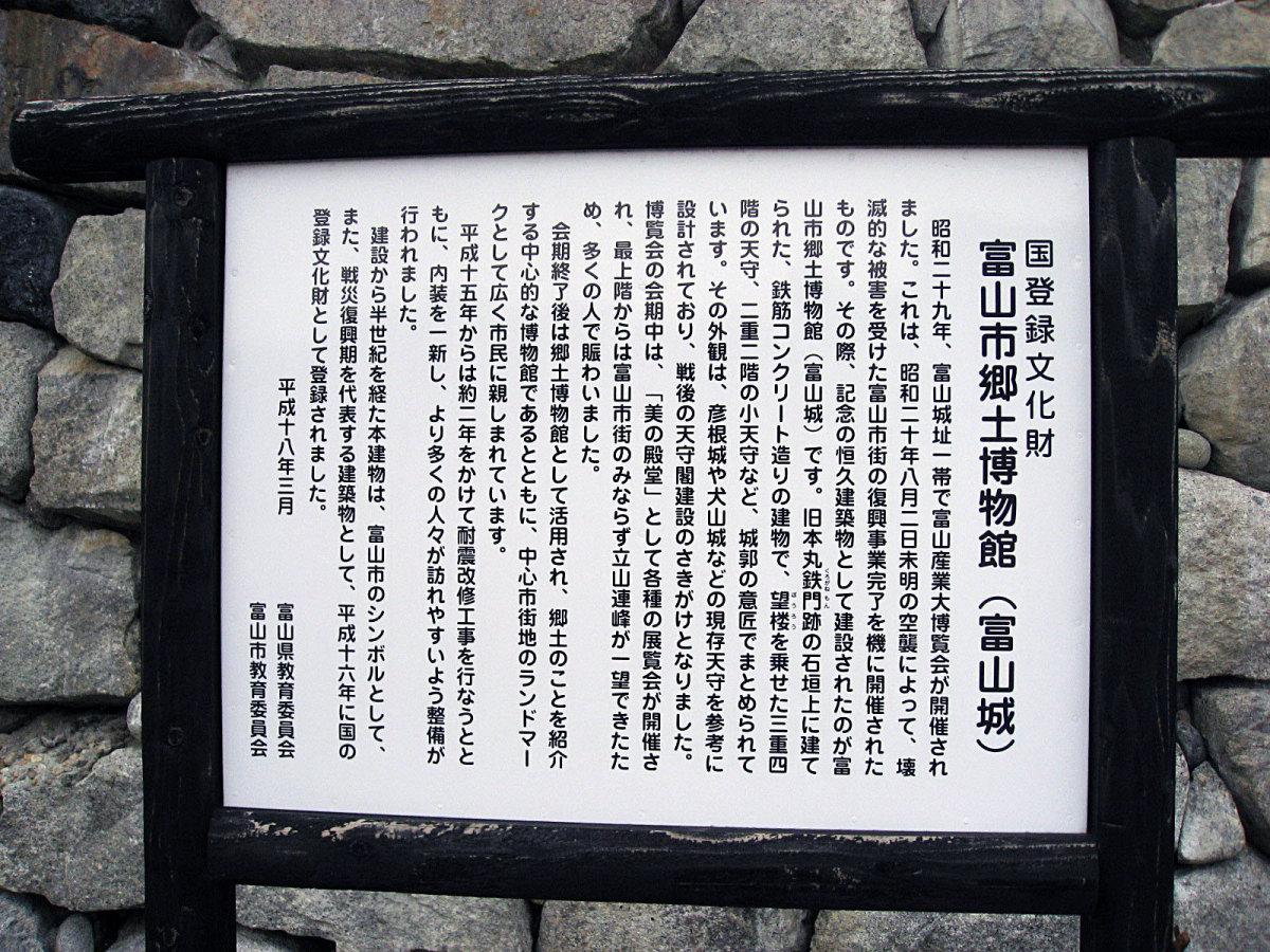 【天正10年(1582年)織田信長の家臣佐々成政が富山城主となり、大規模な改修を加えた。その際に3つの鯱を持つ5層の天守が建てられた[要出典]。また、神通川の流れを城の防御に利用し、水に浮いたように見えるために「浮城」の異名をとった。当時の神通川は富山附近で東に大きく蛇行しており、その南岸に富山城は築かれた。神通川改修後の旧河道は松川と呼ばれ、今も富山城址の北側を流れる。本能寺の変の後、豊臣秀吉と袂を別けた佐々成政は、天正13年(1585年)8月、秀吉自ら率いる10万の大軍に富山城を攻囲されて降伏し(富山の役)、富山城は破却された。やがて越中一国が前田家に与えられると、前田利長が大改修を行い隠居したが、慶長14年(1609年)に建物の主要部をことごとく焼失したため、高岡城を築いて移り、富山城には津田刑部義忠が城代として入った。】