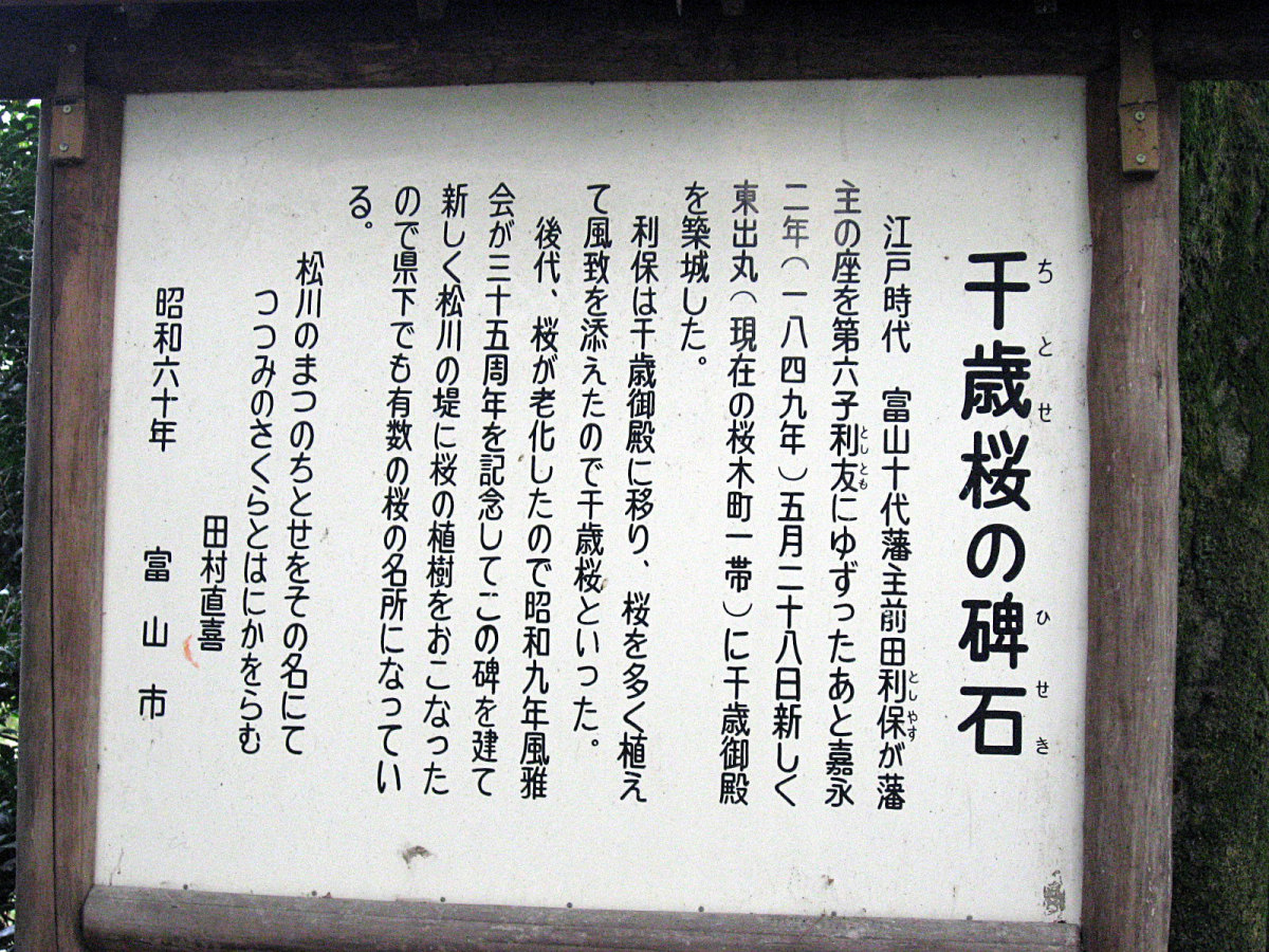 【かつて、神通川は富山市の中心部を蛇行して流れており、たびたび大雨で氾濫し、被害が甚大であった。明治時代、神通川の改修で神通川の本流が富山市の西部を直線的に流れることになり、改修前までの流域を周辺の松並木にちなんで「松川」と呼んだのが松川の始まりである。現在は、松に代わって桜が植えられている。周辺には桜橋通り・桜町・新桜町・桜木町のように「桜」のついた町名が多い。】