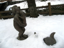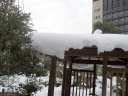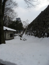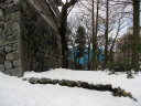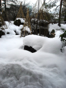 白い世界・・常緑樹の深い緑が・・と,石のグレイが映えています・・覆い尽くす雪ですが・・。