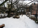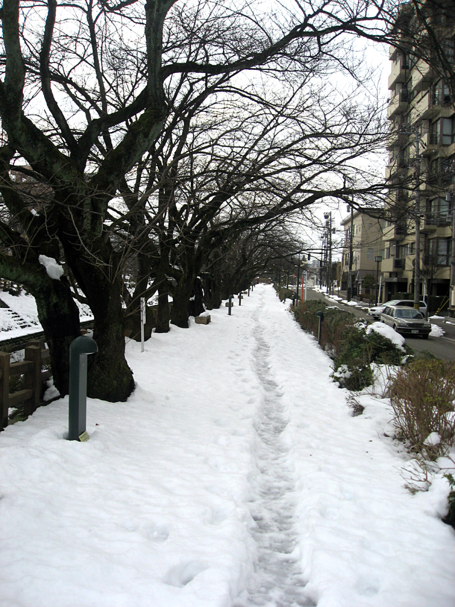 誰かの歩いた後をたどって,雪の歩道をゆきました。
