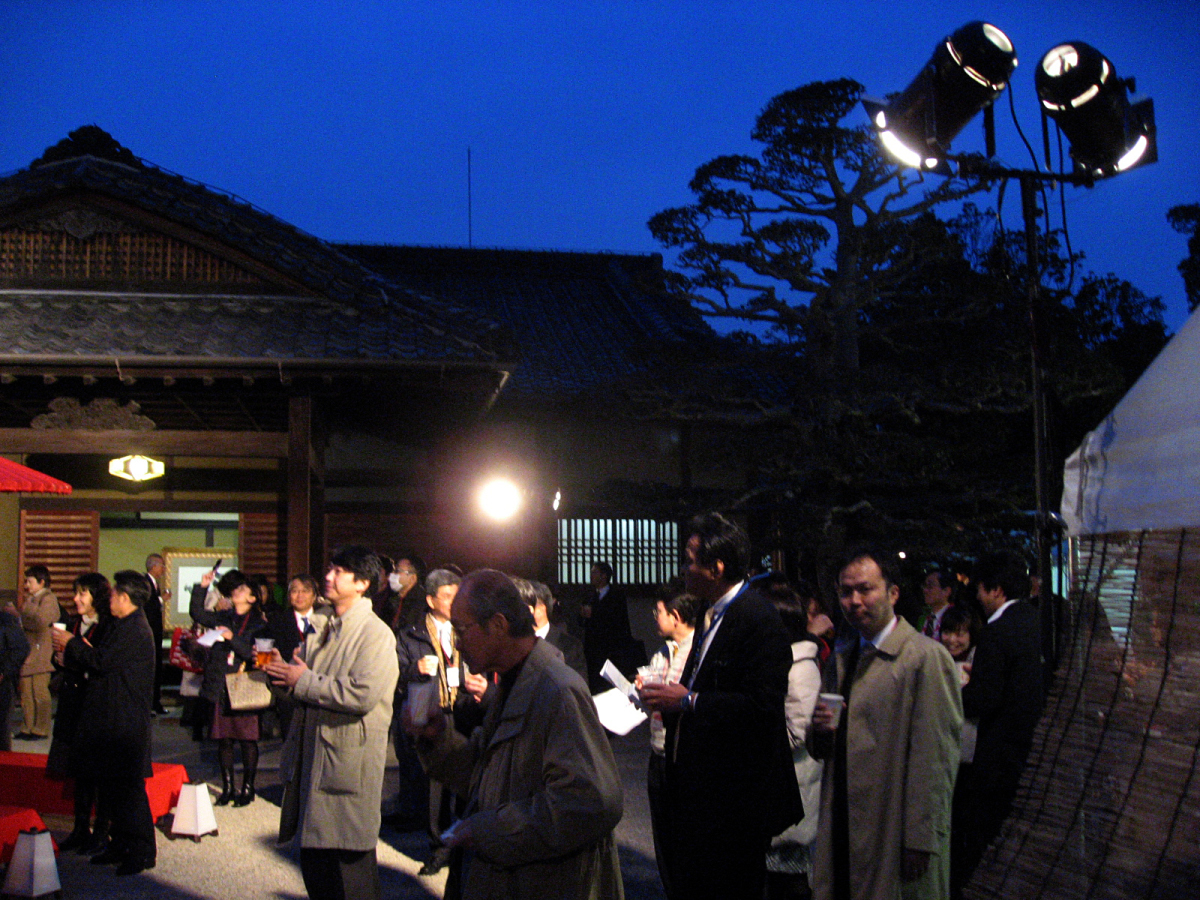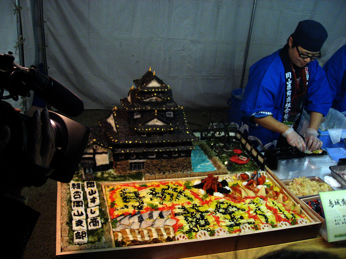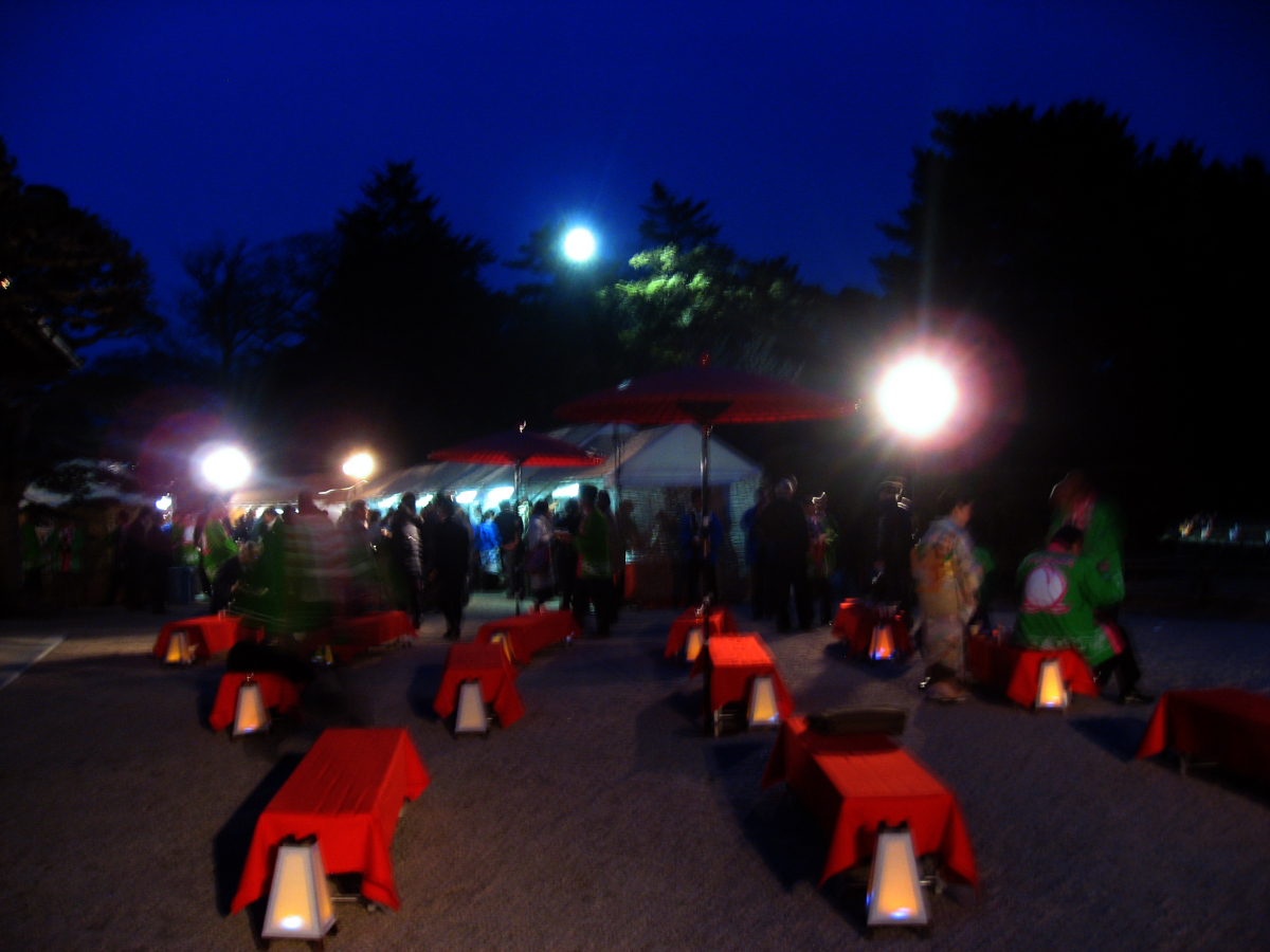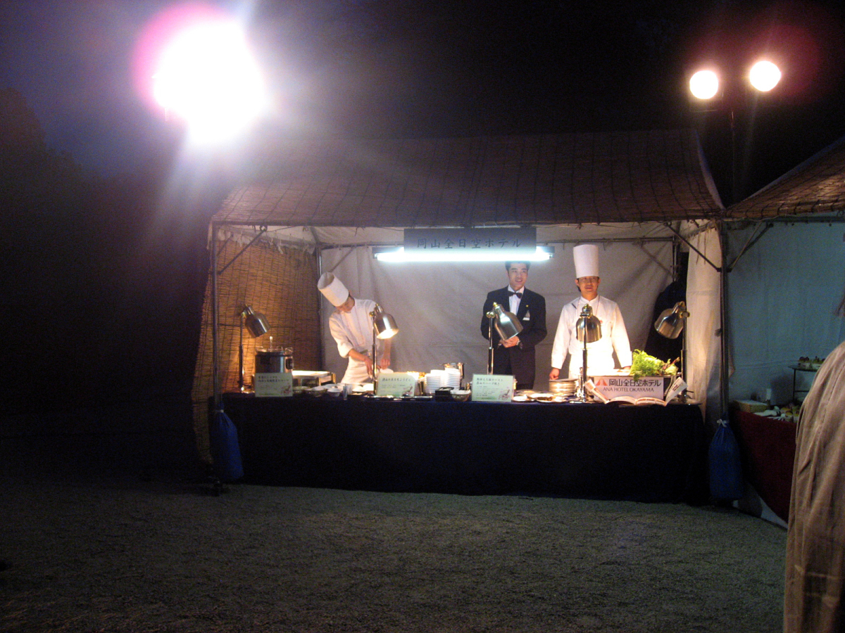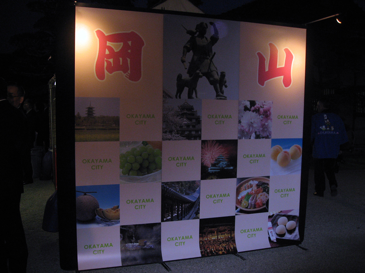 | 2010.2.222. (平成22年2月22日・・・・2ばかりです) 比較的,冬にしては暖かい夜でした。岡山の後楽園の中で・・・「岡山の夕べ」です。 これは昨年4月に岡山市は政令指定都市となって・・・で,コンベンションも充実させたいって思われているようで・・・。 高谷市長も来られていました。 結構な人が集まっています。 お寿司でお城を作ってて・・・・・。 市内有名ホテルが一堂に会していました。 前庭には,緋毛氈の卓が並びます。そして,お琴の生演奏です。 そして,・・・今日は皆で来ました。 夜の後楽園ってまた普段と別の風情??? なかなか,すごいストーリです・・・そして動画! ストーリーもしっかりしており,なかなか見ごたえがありました・・・!!!