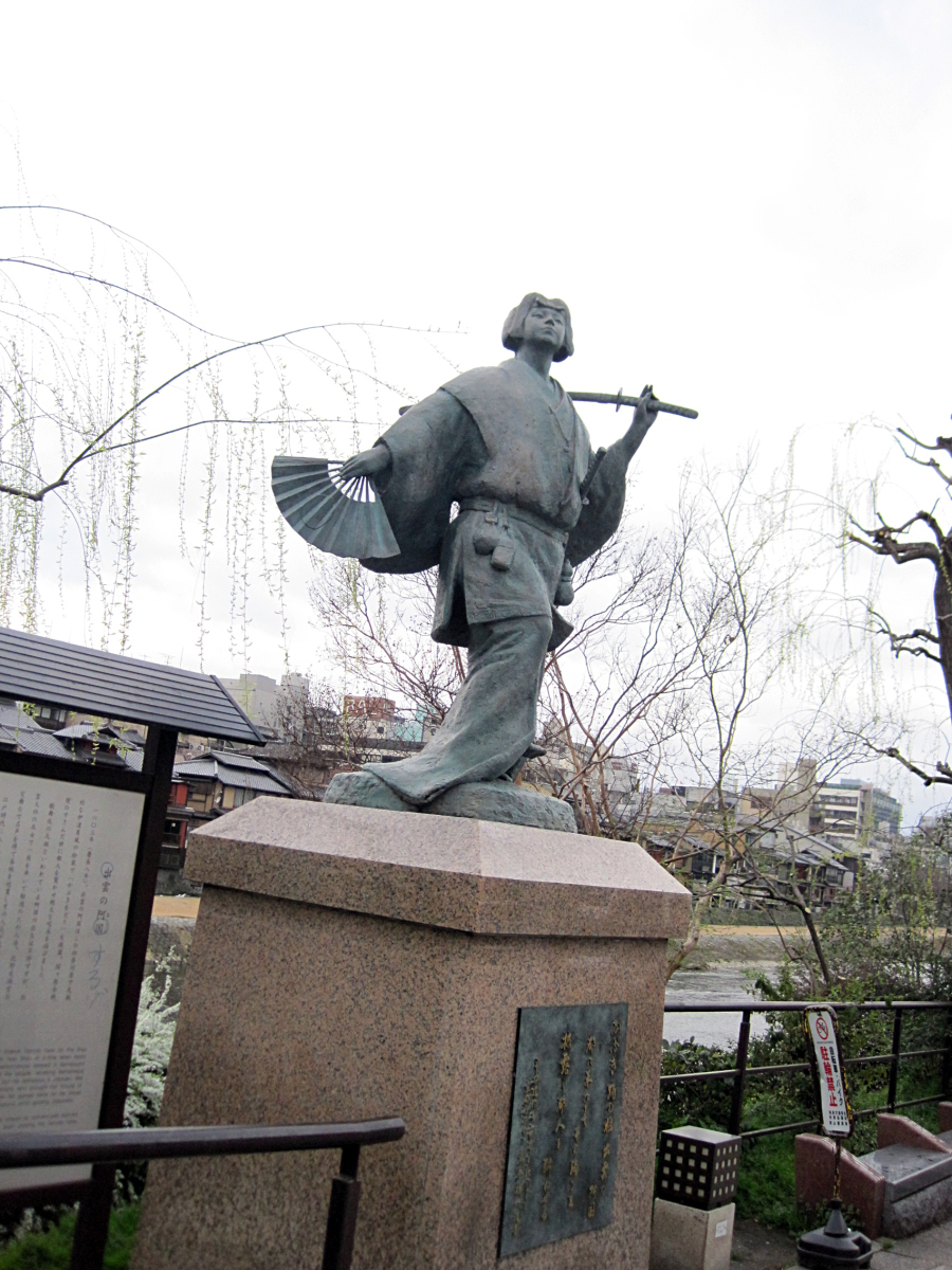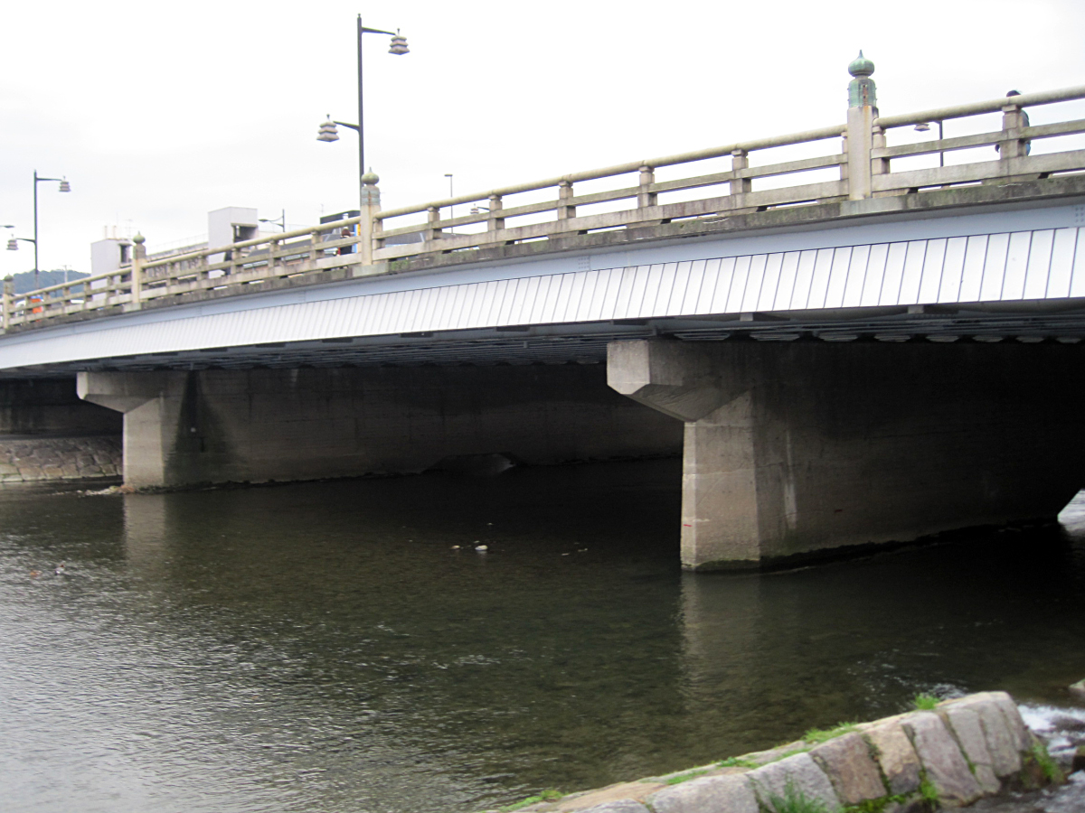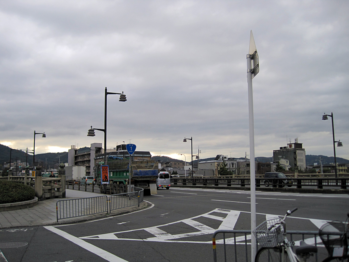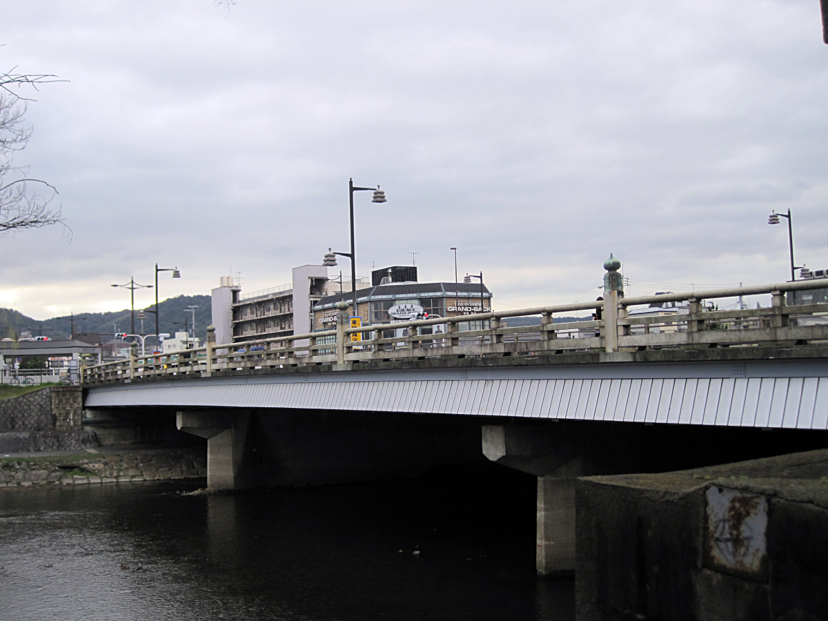さて,少し上ルと・・・「京の五条の橋の上 大の男の弁慶が 長い長刀振りかざし 牛若めがけて、切リかかる」五条大橋です。