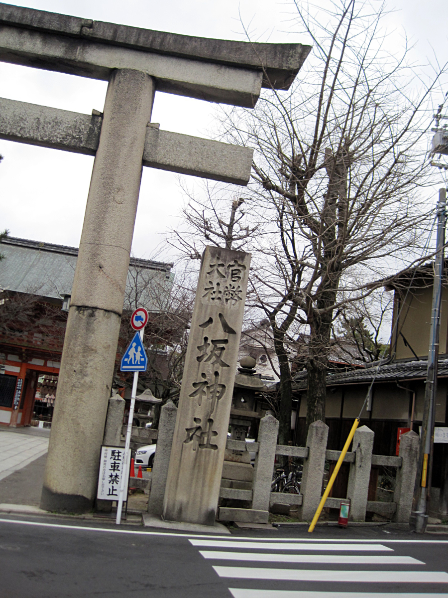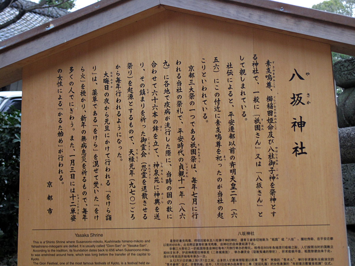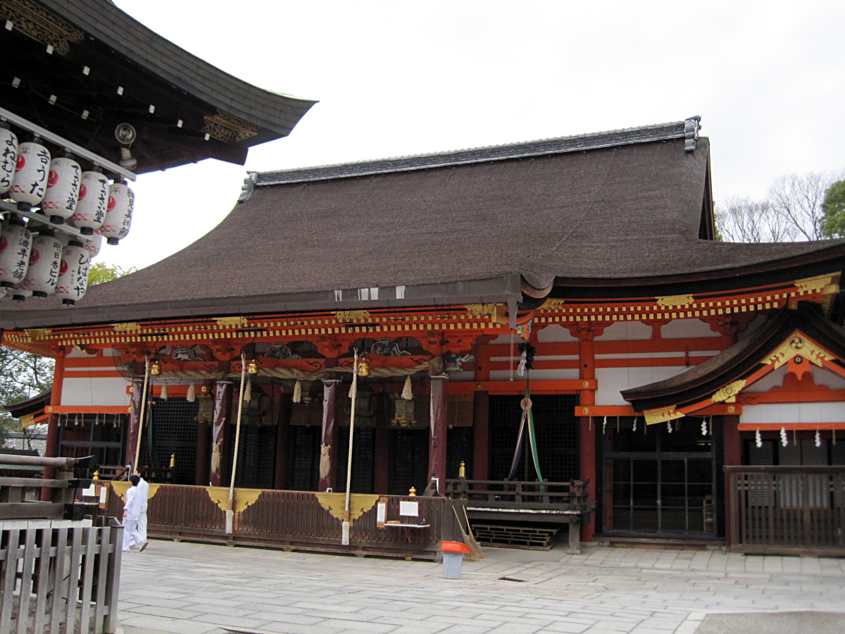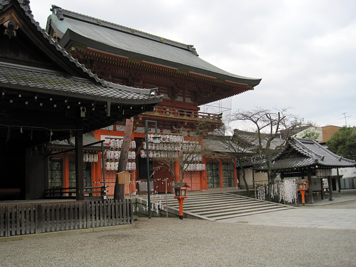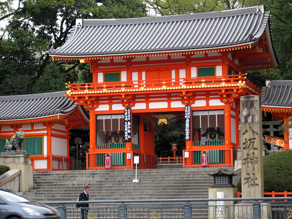 【八坂神社(やさかじんじゃ)は、京都府京都市東山区祇園町にある神社。かつての社名から祇園さんの愛称で呼ばれる。7月の祇園祭(祇園会)で知られ、ほかに特殊神事として白朮(をけら)祭がある。旧社格は官幣大社。中世には二十二社の下八社のひとつとされた。慶応4年(1868年)の神仏分離令(廃仏毀釈運動)により、元々「祇園神社」「祇園社」「祇園感神院」と呼ばれていたのが、「八坂神社」と改められた。八坂神社を総本社とし、素戔嗚尊(スサノオ)を祭神とする神社が、日本全国に約2300社あるとされる。】