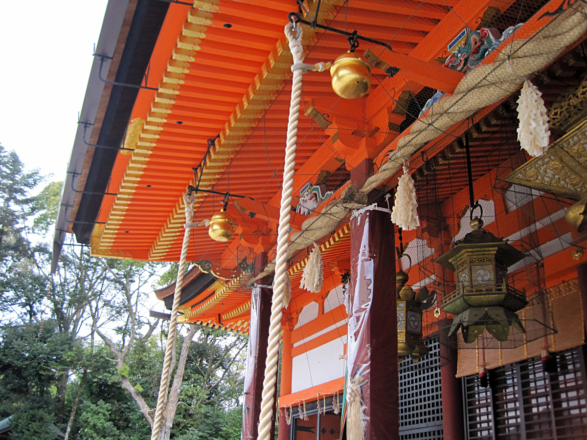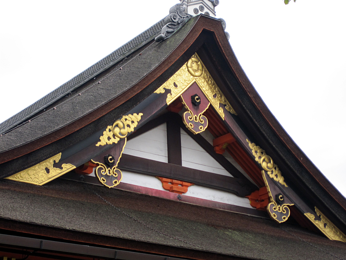 【国の重要文化財に指定されている本殿は、かつて別棟であった二つの建造物-本殿と拝殿-とを一つの屋根で覆ったもので、他に類例のない建築様式であることから、「祇園造」とよばれている。本殿の建築についての文献上の初見は、