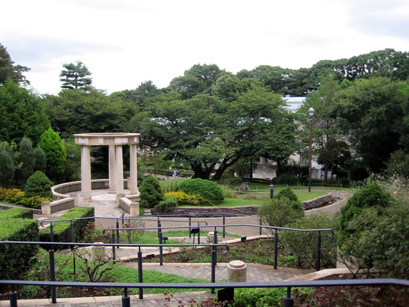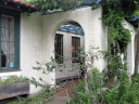 【イギリス館の南側、噴水広場を挟んで立っているスパニッシュスタイルの洋館が、山手111番館です。ワシン坂通りに面した広い芝生を前庭とし、ローズガーデンを見下ろす建物は、大正15(1926)年にアメリカ人ラフィン氏の住宅として現在地に設計されました。設計者は、べーリック・ホールを設計した J.H.モーガンです。玄関前の3連アーチが同じ意匠ですが、こちらは天井がなくパーゴラになっているため、異なる印象を与えています。大正9(1920)年に来日したモーガンは、横浜を中心に数多くの作品を残していますが、山手111番館は彼の代表作の一つと言えるでしょう。赤い瓦屋根に白壁の建物は地階がコンクリート、地上が木造2階建ての寄棟作りです。創建当時は、地階部分にガレージや使用人部屋、1階に吹き抜けのホール、厨房、食堂と居室、2階は海を見晴らす寝室と回廊、スリーピングポーチを配していました。横浜市は、平成8(1996)年に敷地を取得し、建物の寄贈を受けて保存、改修工事をおこない平成11(1999)年から一般公開しています。館内は昭和初期の洋館を体験できるよう家具などを配し、設計者モーガンに関する展示等もおこなっています。現在、ローズガーデンから入る地階部分は、喫茶スペースとして利用されています。】ちょっと長い引用になりましたが・・・。