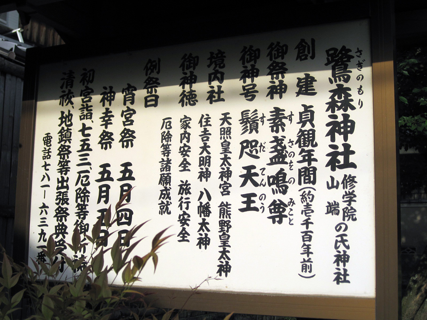 【祭神:素盞嗚尊 神号は鬚咫天王(しゅだ),由緒: 修学寺の天王とも称した。本来の祭神は牛頭天王である。神使の鷺がこの森に群集していたのが名前の謂われとされている。 赤山禅院の側に鎮座していたが、修学院離宮の建設にともない、現社地に遷座した。 赤山禅院との関連がないはずがなく、赤山禅院の鎮守ではなかったか、と推測できる。園城寺の新羅善神堂からの勧請と見て、五十猛命を祭神とする区分に入れた。】だそうですね!