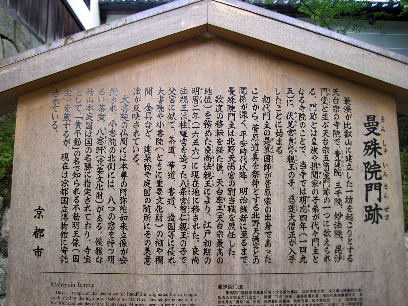 年(1656 年)のことである。寺伝では延暦年間(782-806)、伝教大師最澄が比叡山上に営んだ一坊がその起源とされる。円仁、安恵らを経て、10世紀後半の僧である是算の時、比叡山三塔のうちの西塔北谷に移り、東尾坊(とうびぼう)と称したという。最澄、円仁、安恵…というのは天台宗の法脈を表わすもので、曼殊院の歴史は実質的には是算の時代から始まるといえる。是算の事績についてはあまり明らかでないが、花山法皇(968-1008)の弟子であったという。】って由緒の様です。