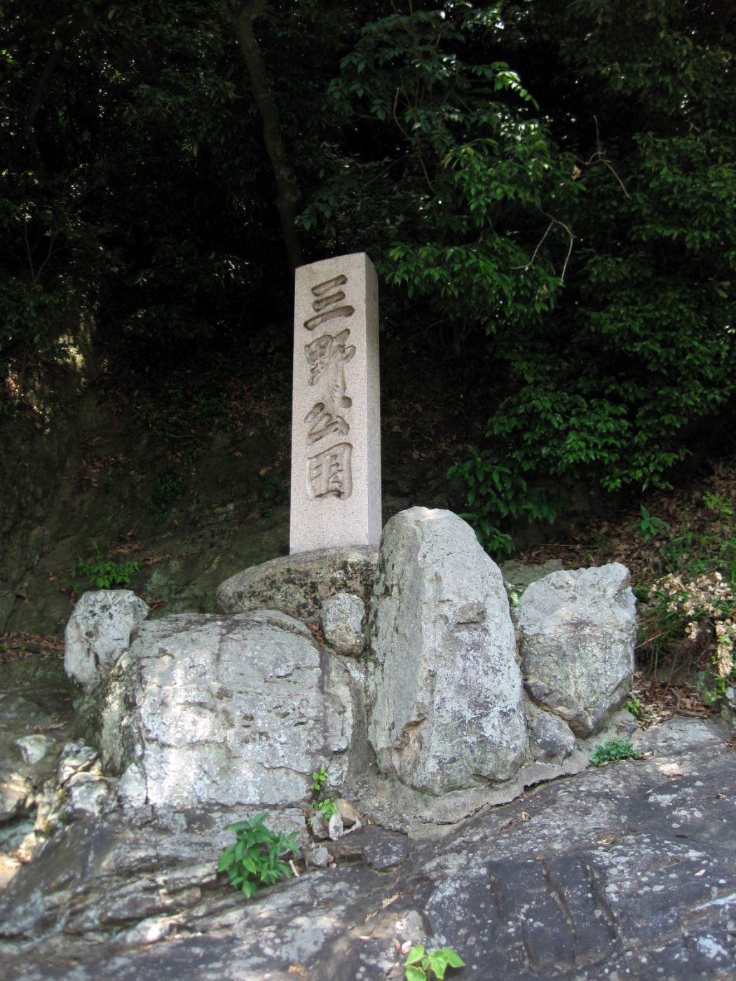 【この公園は、昭和6年、地元で生まれた小合金光氏が岡山市議会議員であった時、三野公園設立に尽力し、眺望の良い東側の旭川に臨む妙(明)見山の広さ21,770平方mに開設された公園です。頂上からは旭川は、まさに眼下にあって、岡山の市街地はもちろんのこと、遠く児島半島をのぞむことができます。特に春の桜は美しく、戦前には桜の名所として多くの人々に親しまれて、岡山県下十勝地に指定されました。頂上に小合金光氏の顕彰の碑があります。三野公園の後側山頂には天神社があります。妙見山には戦国時代、牧石郷船山城主・須々木豊前守の出城妙見山城(城主・須々木四郎兵衛は豊前守の子)がありました。旭川西岸の鑵子(かんす)の釣(つる)の渡しに臨んでいるため、鑵子の釣城とか、釣城と呼ばれていたと伝えられています。】という情報です。