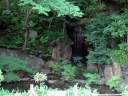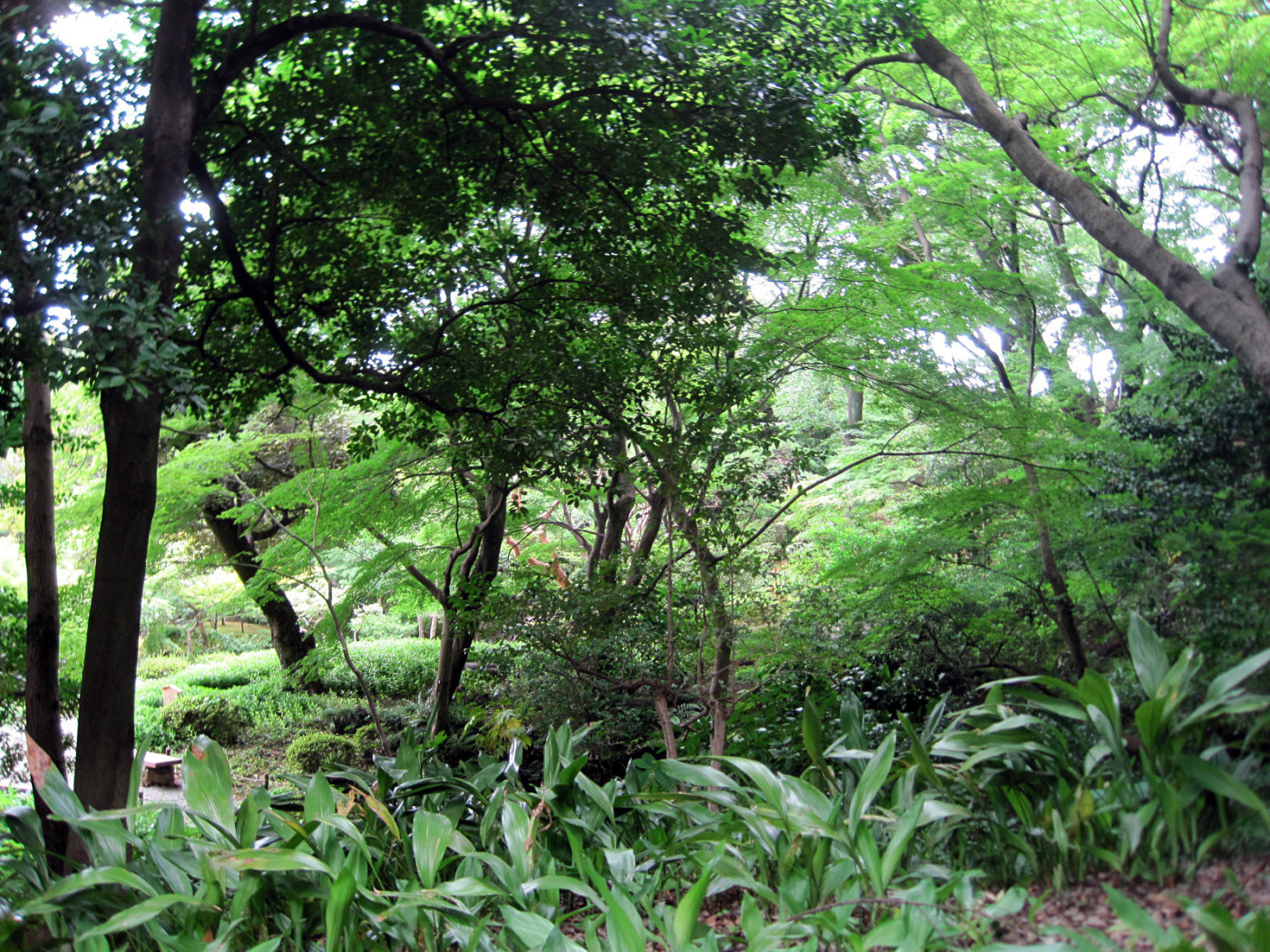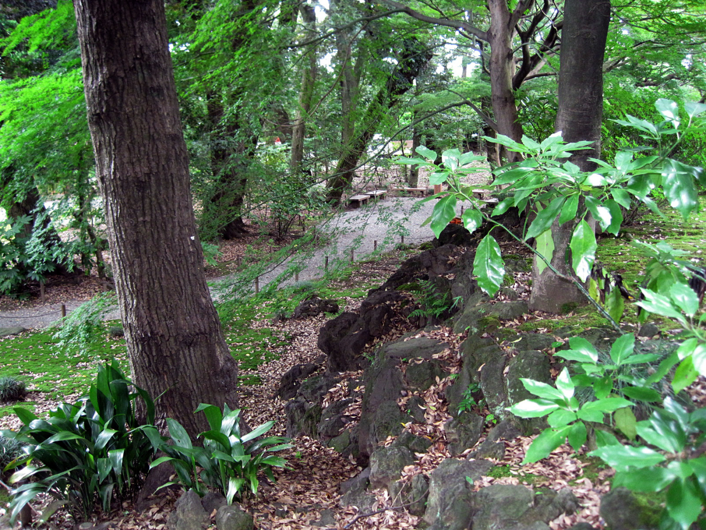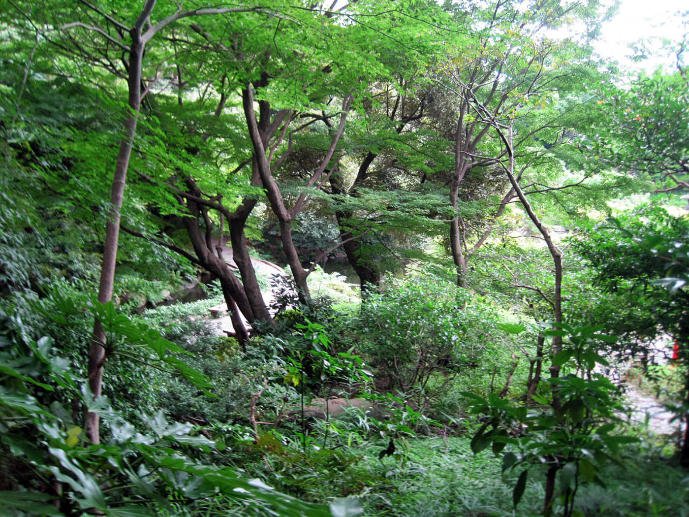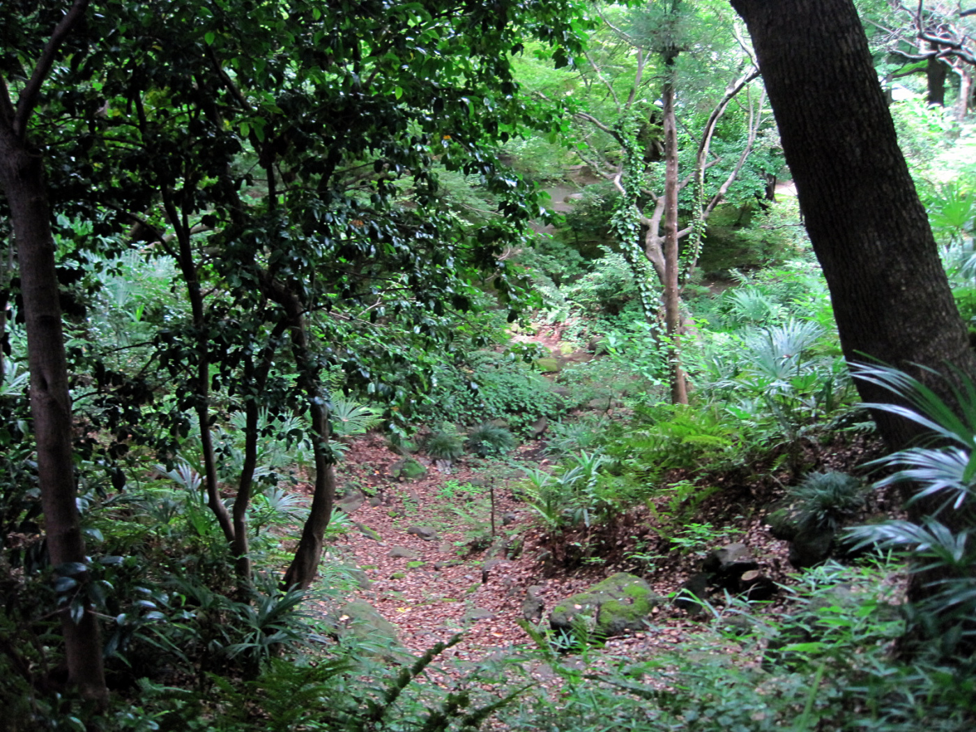 ちなみに日本庭園部分は【心字池を中心に、大滝、枯山水、茶室等を配する本格的な回遊式庭園である。台地斜面上の大滝付近の植え込みが深山の趣を醸し出しており、庭園の構成に深みを与えている。】ということで,元々の地形を利用しています。