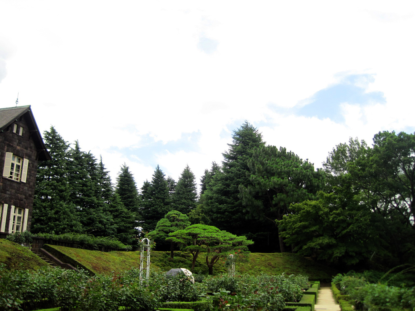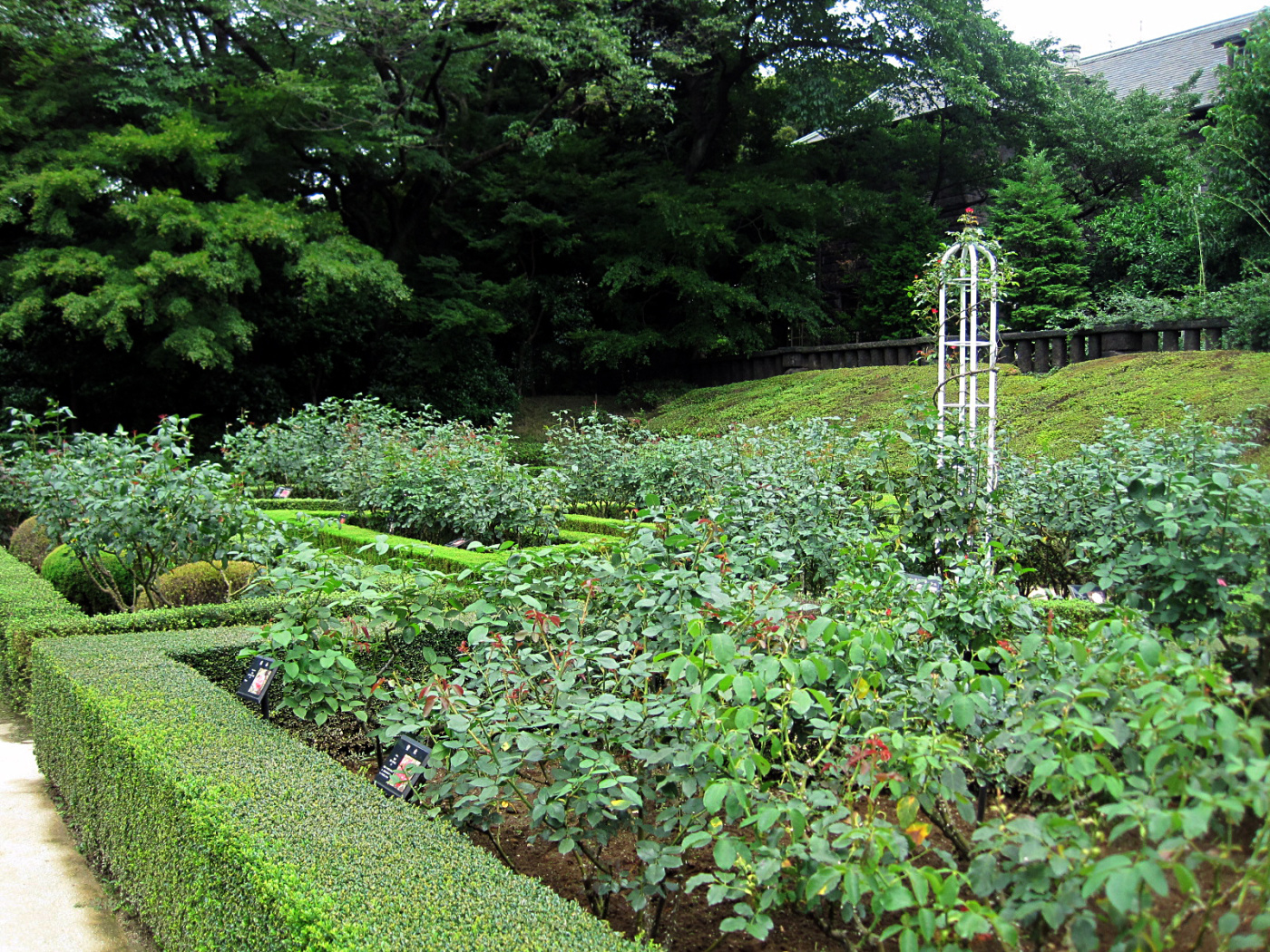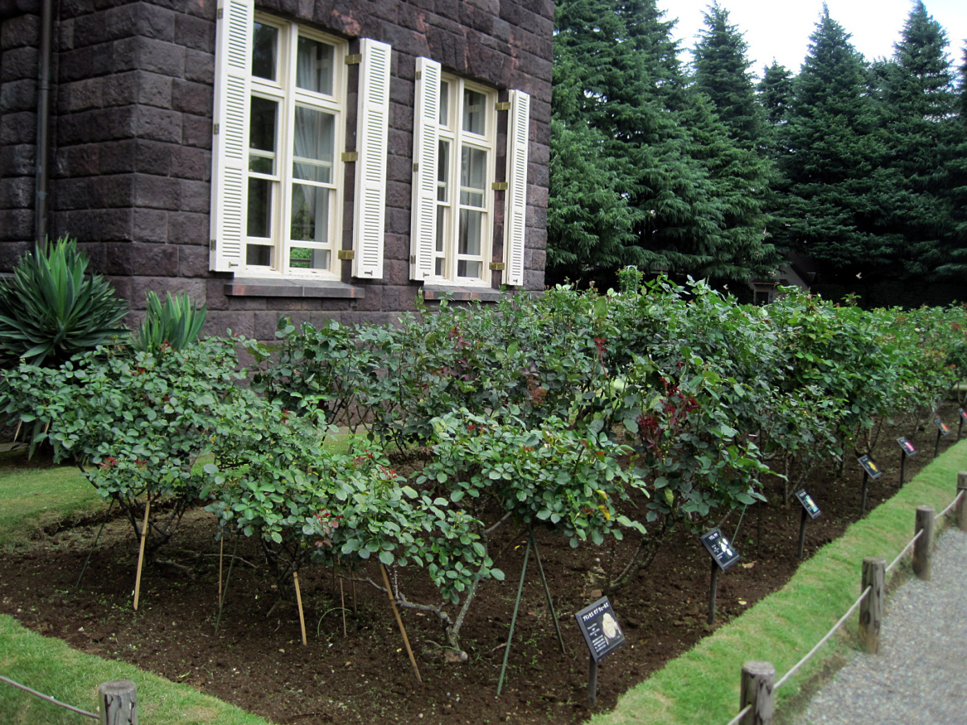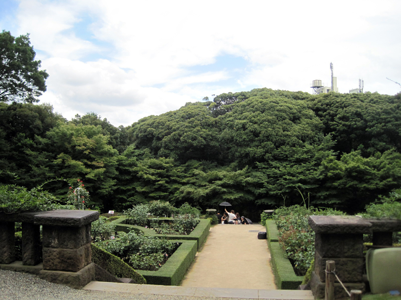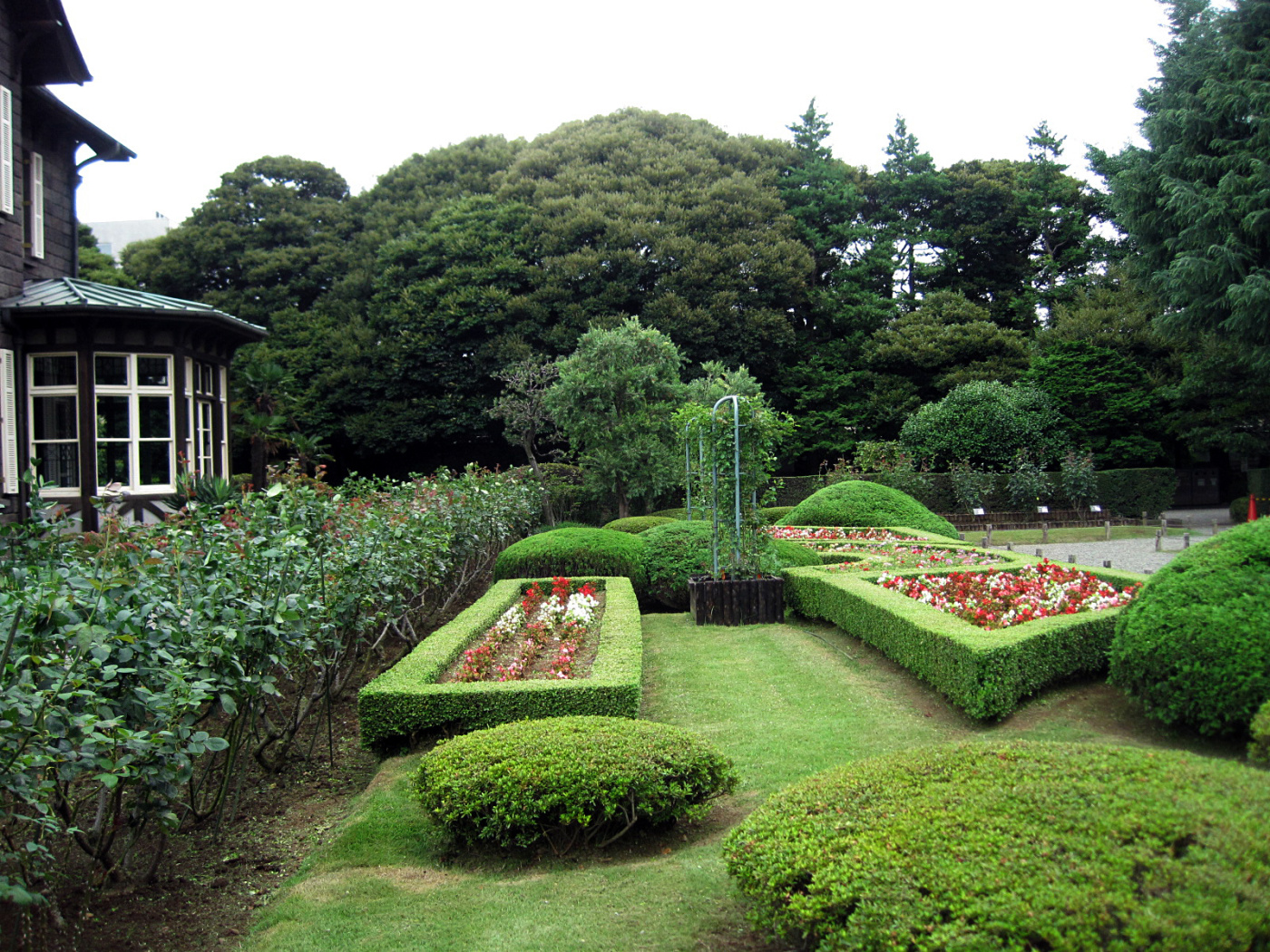 さて欧風庭園ですが【洋館南側の洋風庭園は、テラスが階段状に連なるイタリア式庭園と、平面的で幾何学的に構成されるフランス式庭園の技法があわせて用いられている。バラのテラス庭園は、一段目の花壇は正しく左右対称形であるが二段目から中央の階段を挟んで左右に方形の植え込みとなっている花壇東側の方形北東部が斜面突出部によって欠けている。これはコンドルが敷地下部の日本庭園との調和をはかるため意図的にバラ園の対象形を崩したものと推測されている。現在のバラ園には、プリンセスマサコ等の品種が植えられている。】だそうです。