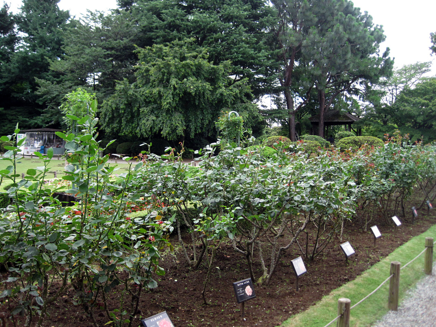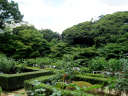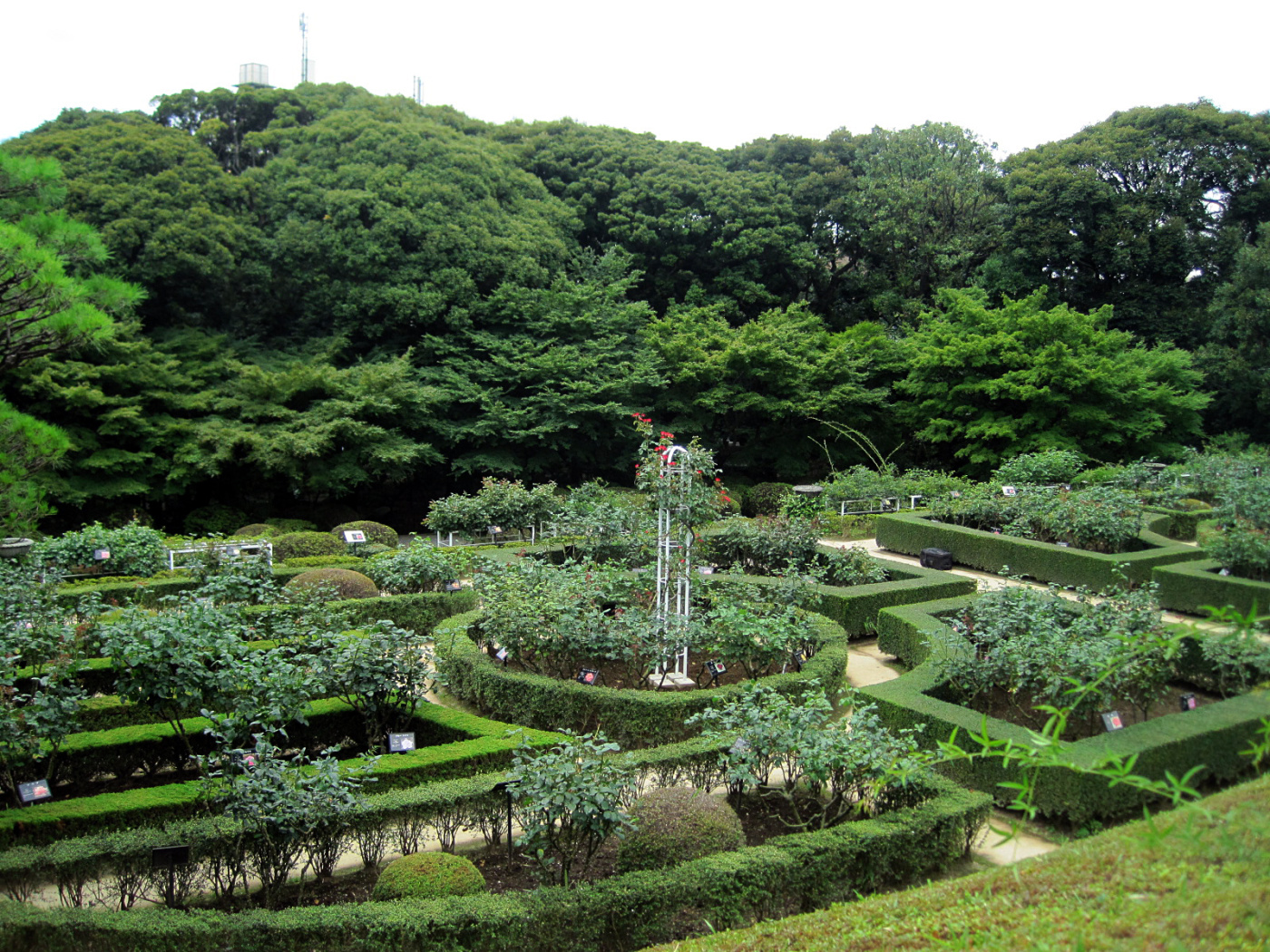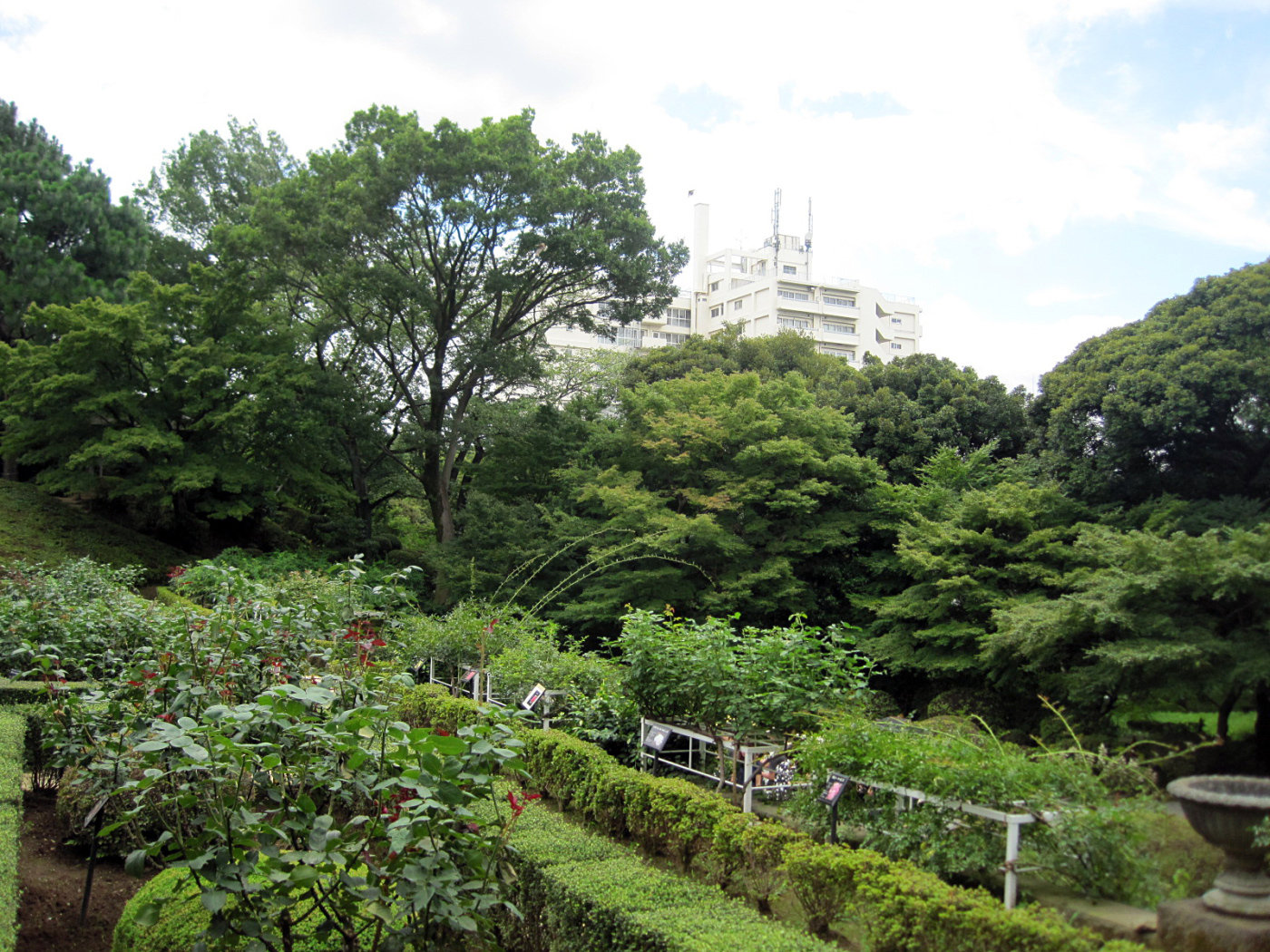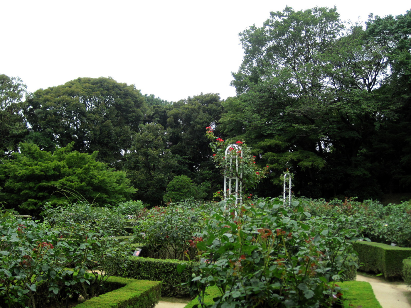 さて欧風庭園ですが【洋館南側の洋風庭園は、テラスが階段状に連なるイタリア式庭園と、平面的で幾何学的に構成されるフランス式庭園の技法があわせて用いられている。バラのテラス庭園は、一段目の花壇は正しく左右対称形であるが二段目から中央の階段を挟んで左右に方形の植え込みとなっている花壇東側の方形北東部が斜面突出部によって欠けている。これはコンドルが敷地下部の日本庭園との調和をはかるため意図的にバラ園の対象形を崩したものと推測されている。現在のバラ園には、プリンセスマサコ等の品種が植えられている。】だそうです。