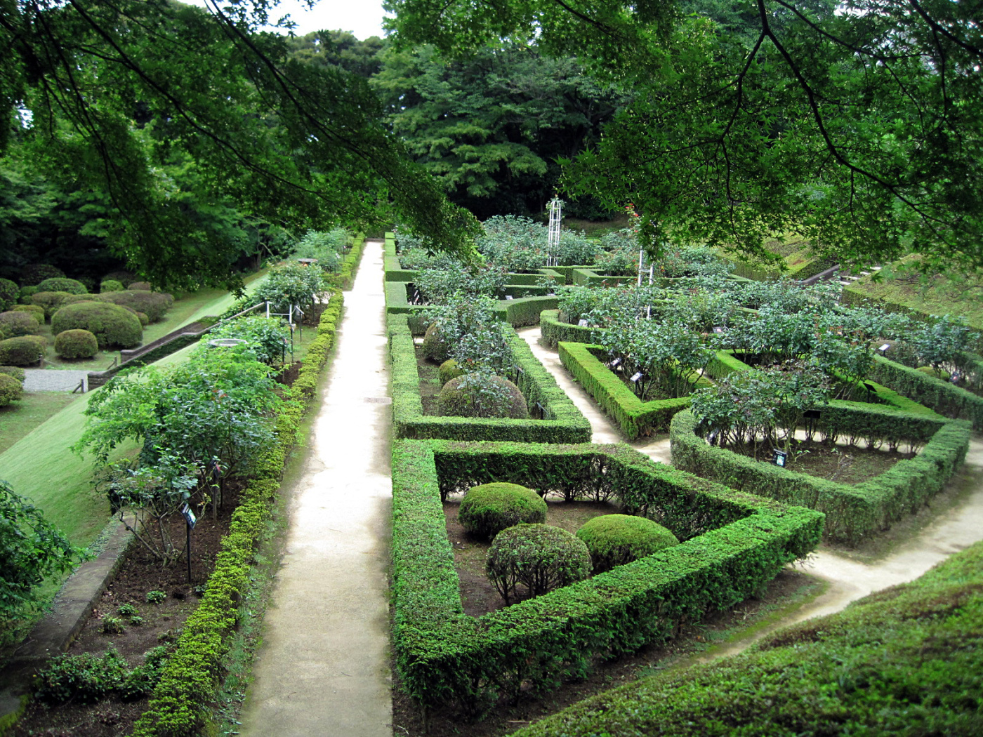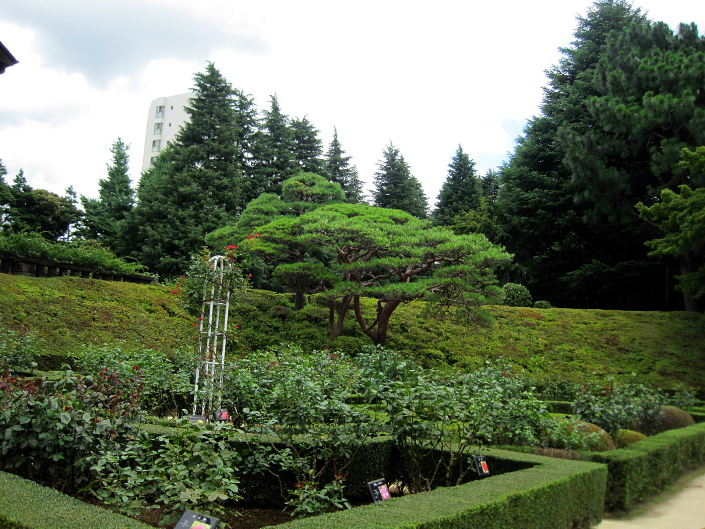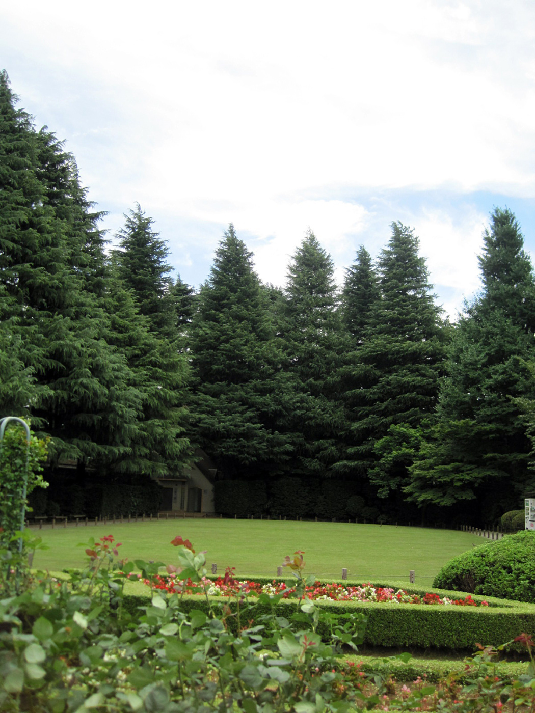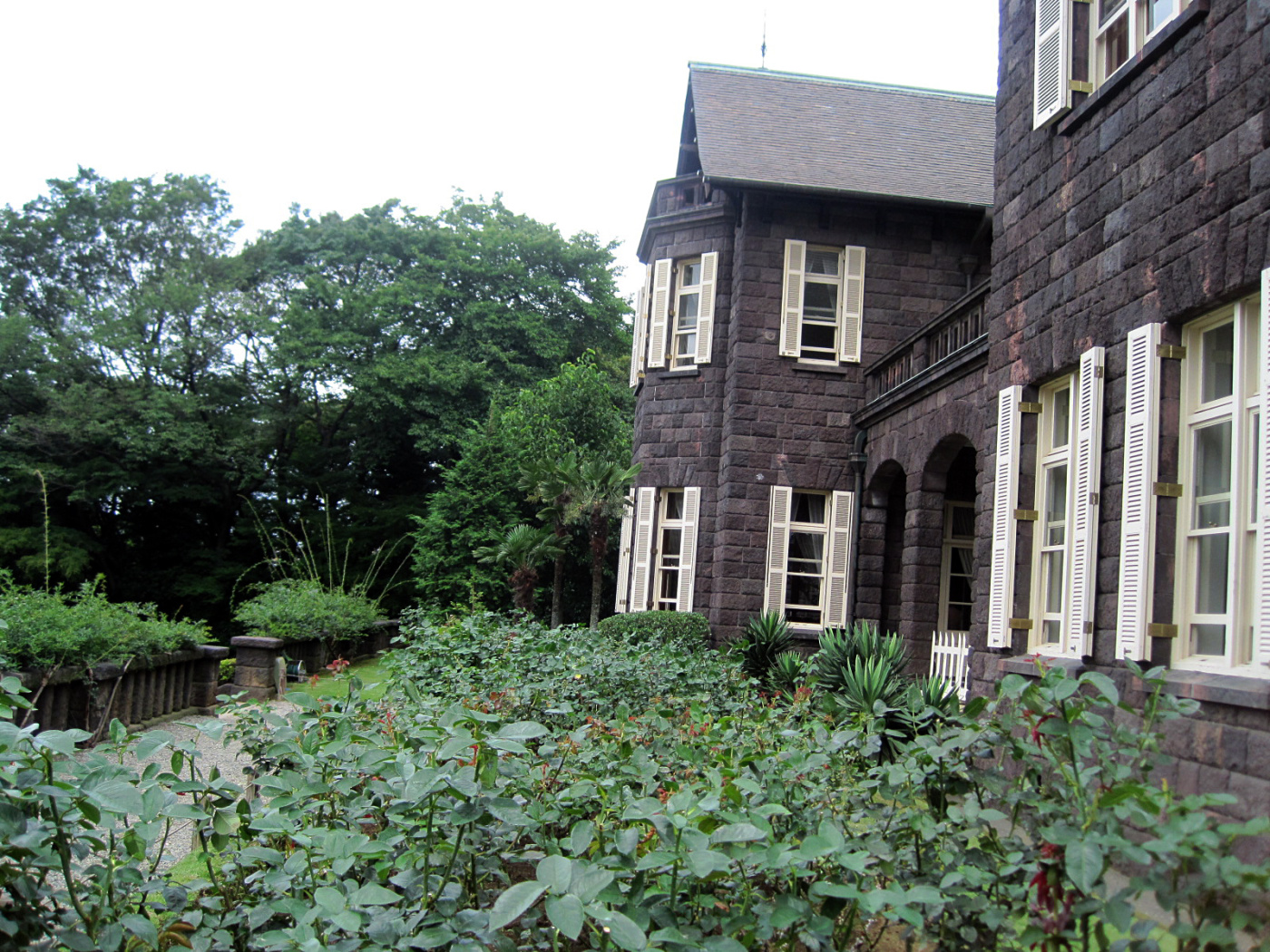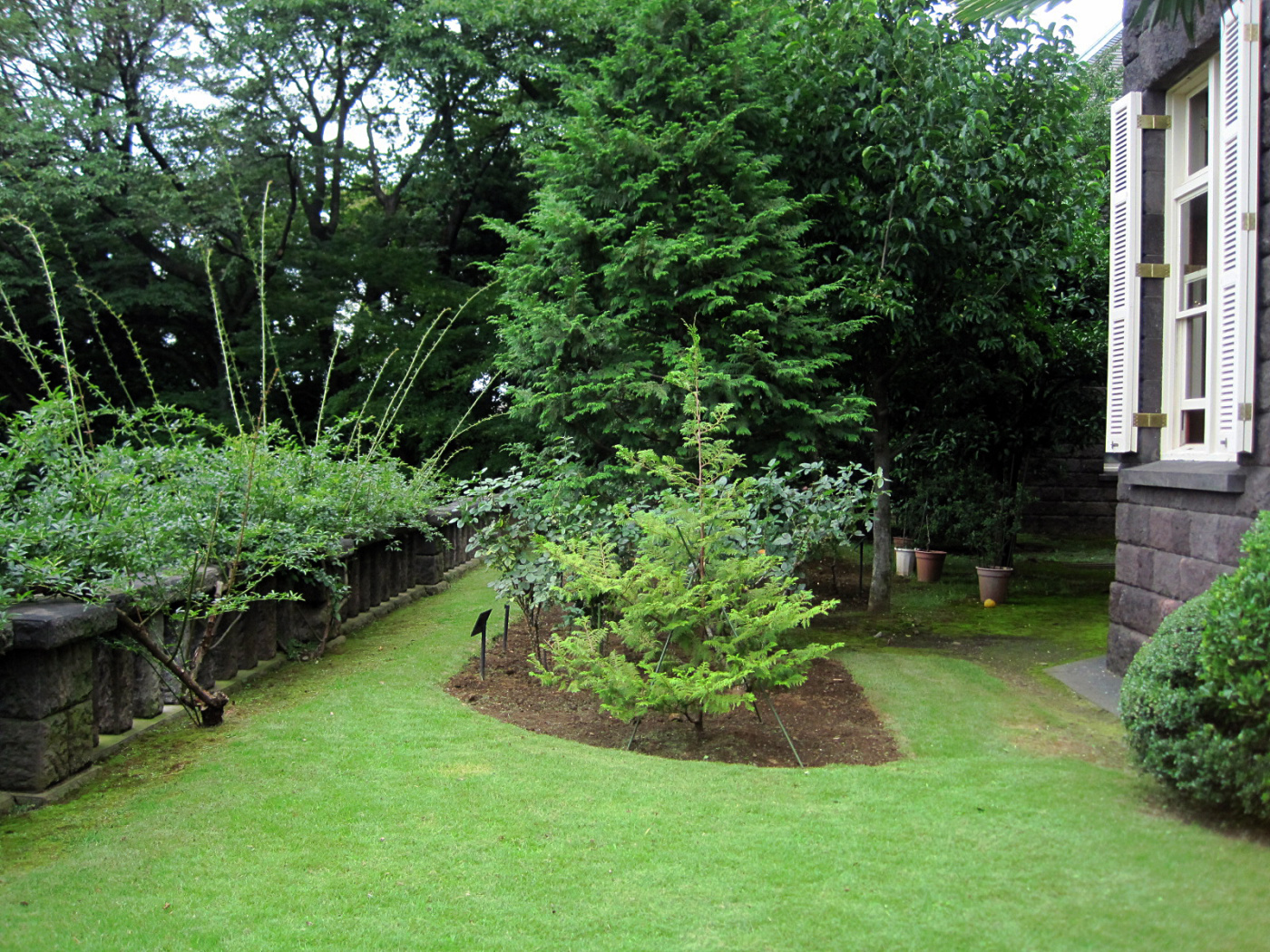 さて欧風庭園ですが【洋館南側の洋風庭園は、テラスが階段状に連なるイタリア式庭園と、平面的で幾何学的に構成されるフランス式庭園の技法があわせて用いられている。バラのテラス庭園は、一段目の花壇は正しく左右対称形であるが二段目から中央の階段を挟んで左右に方形の植え込みとなっている花壇東側の方形北東部が斜面突出部によって欠けている。これはコンドルが敷地下部の日本庭園との調和をはかるため意図的にバラ園の対象形を崩したものと推測されている。現在のバラ園には、プリンセスマサコ等の品種が植えられている。】だそうです。