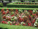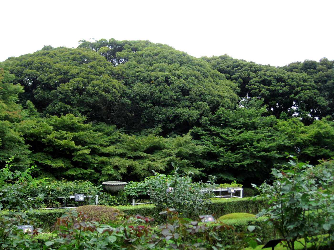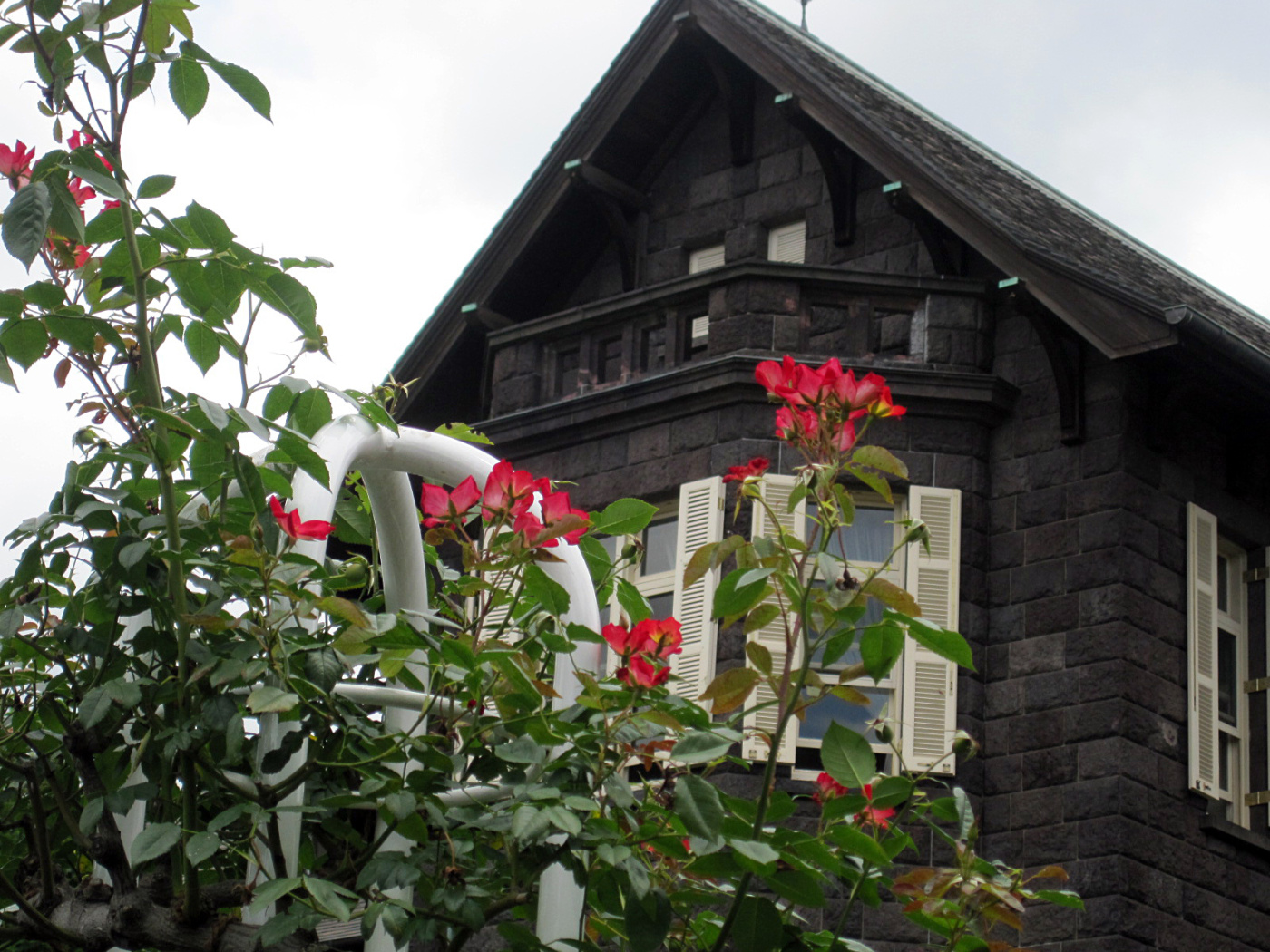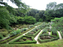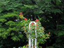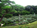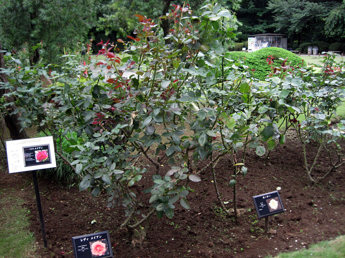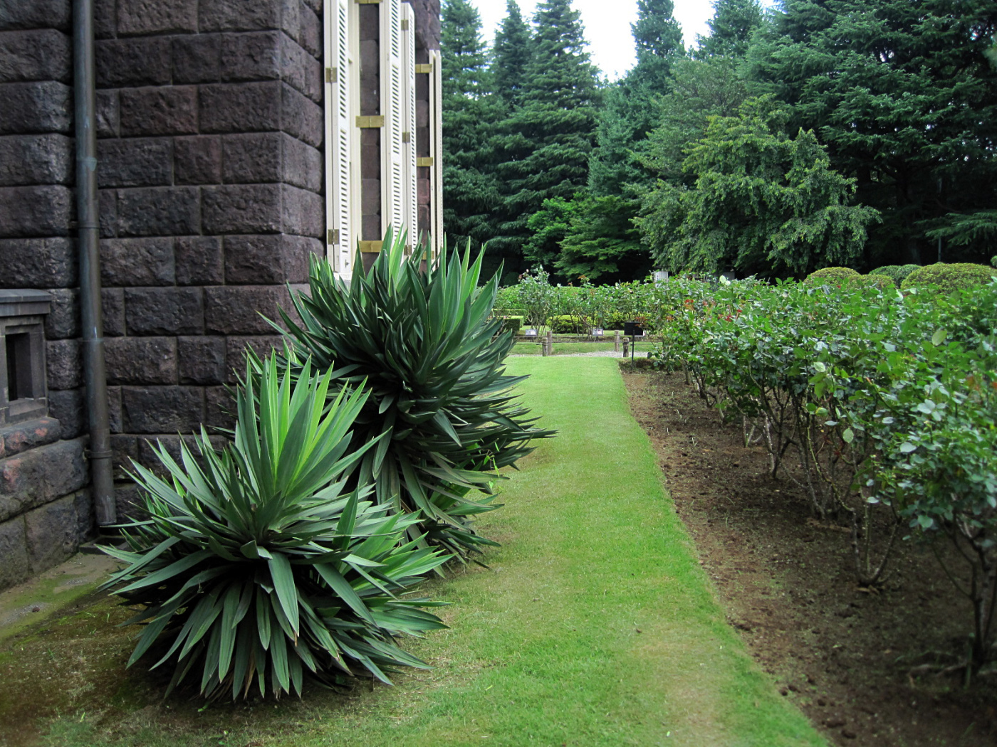 さて欧風庭園ですが【洋館南側の洋風庭園は、テラスが階段状に連なるイタリア式庭園と、平面的で幾何学的に構成されるフランス式庭園の技法があわせて用いられている。バラのテラス庭園は、一段目の花壇は正しく左右対称形であるが二段目から中央の階段を挟んで左右に方形の植え込みとなっている花壇東側の方形北東部が斜面突出部によって欠けている。これはコンドルが敷地下部の日本庭園との調和をはかるため意図的にバラ園の対象形を崩したものと推測されている。現在のバラ園には、プリンセスマサコ等の品種が植えられている。】だそうです。