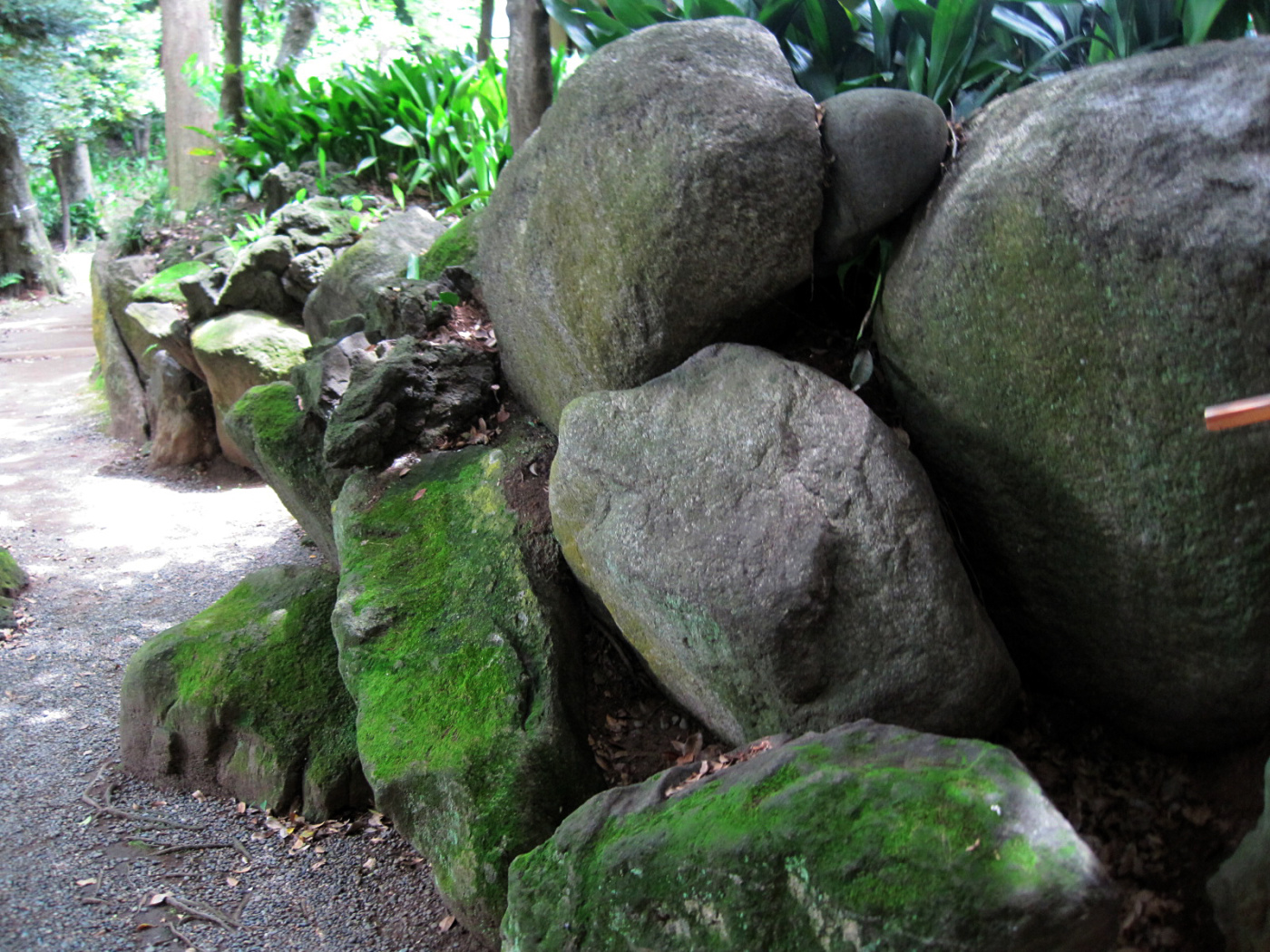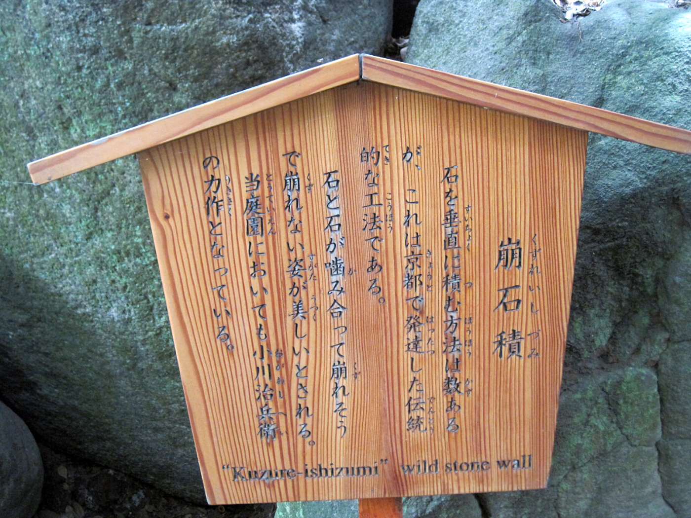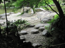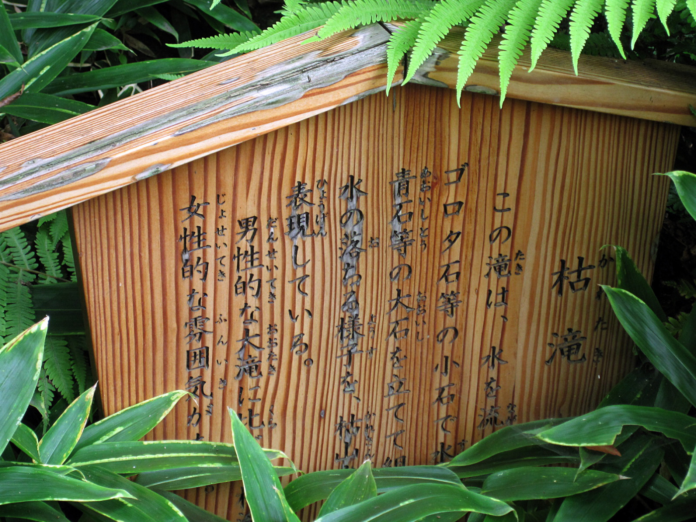 枯滝とは【枯山水に配置した滝。鏡石を水に見立て、垂直に落ちる滝を象徴したり、2段・3段に石を組んだものなど様々である。】と建築用語辞典です。