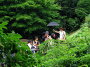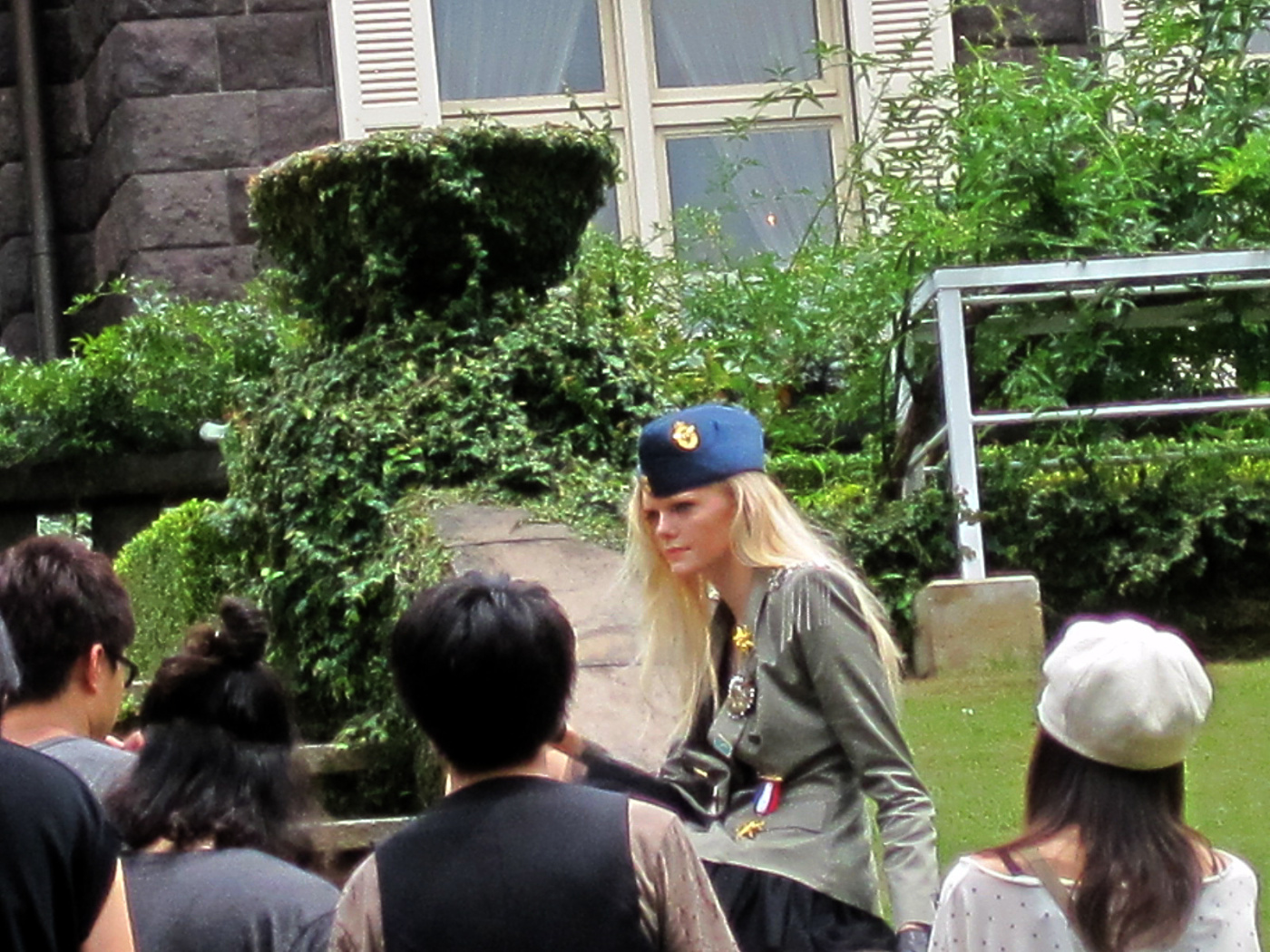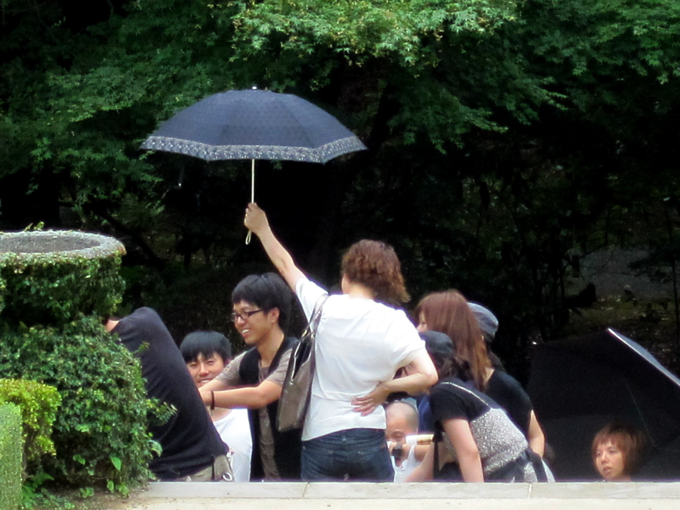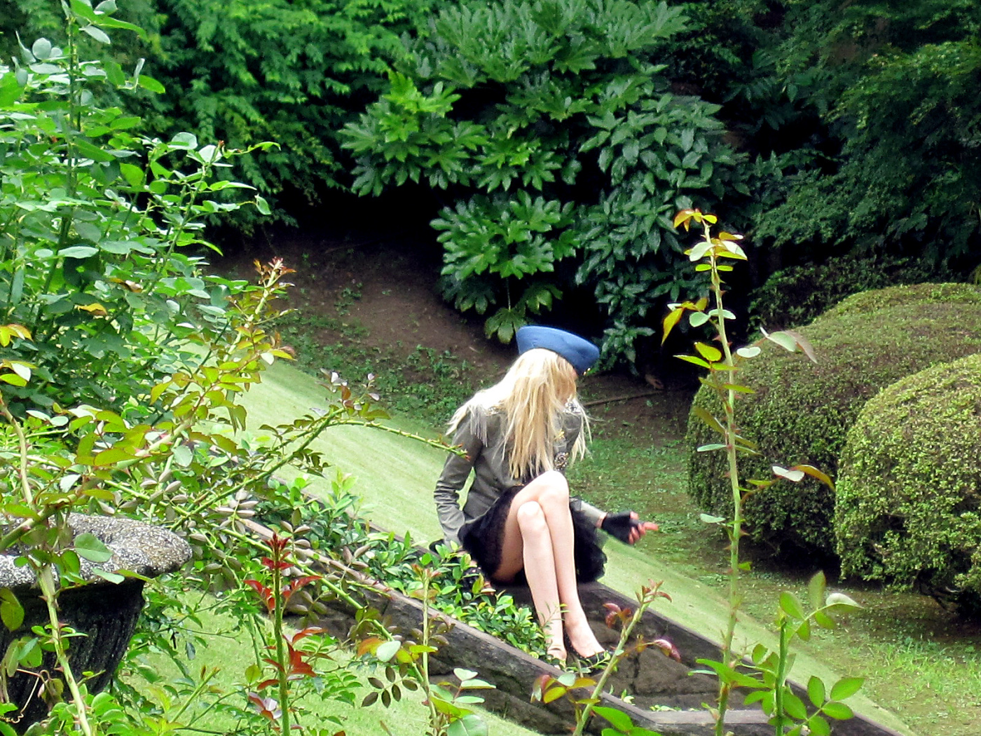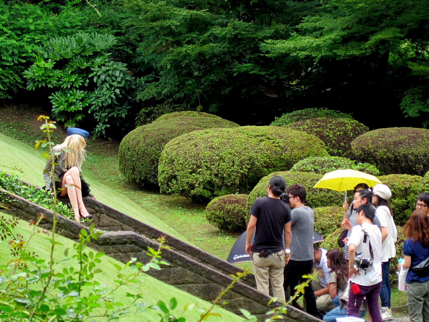 | 去年,同じ会に来て六義園を訪れた時には,ギャル系モデルさんが浴衣で撮影会をしていました。今年は欧風庭園もあるせいか外人モデルさんの撮影です・・・一人の撮影のために,これだけの人数・・・カメラマングループ,ヘアやメイクのスタッフたち,きっと雑誌系のスタッフさんとか,モデルさんのマネージメントとか・・・・大変ですね。 |
