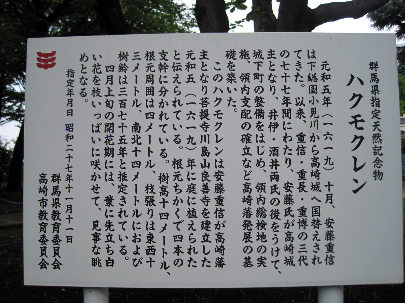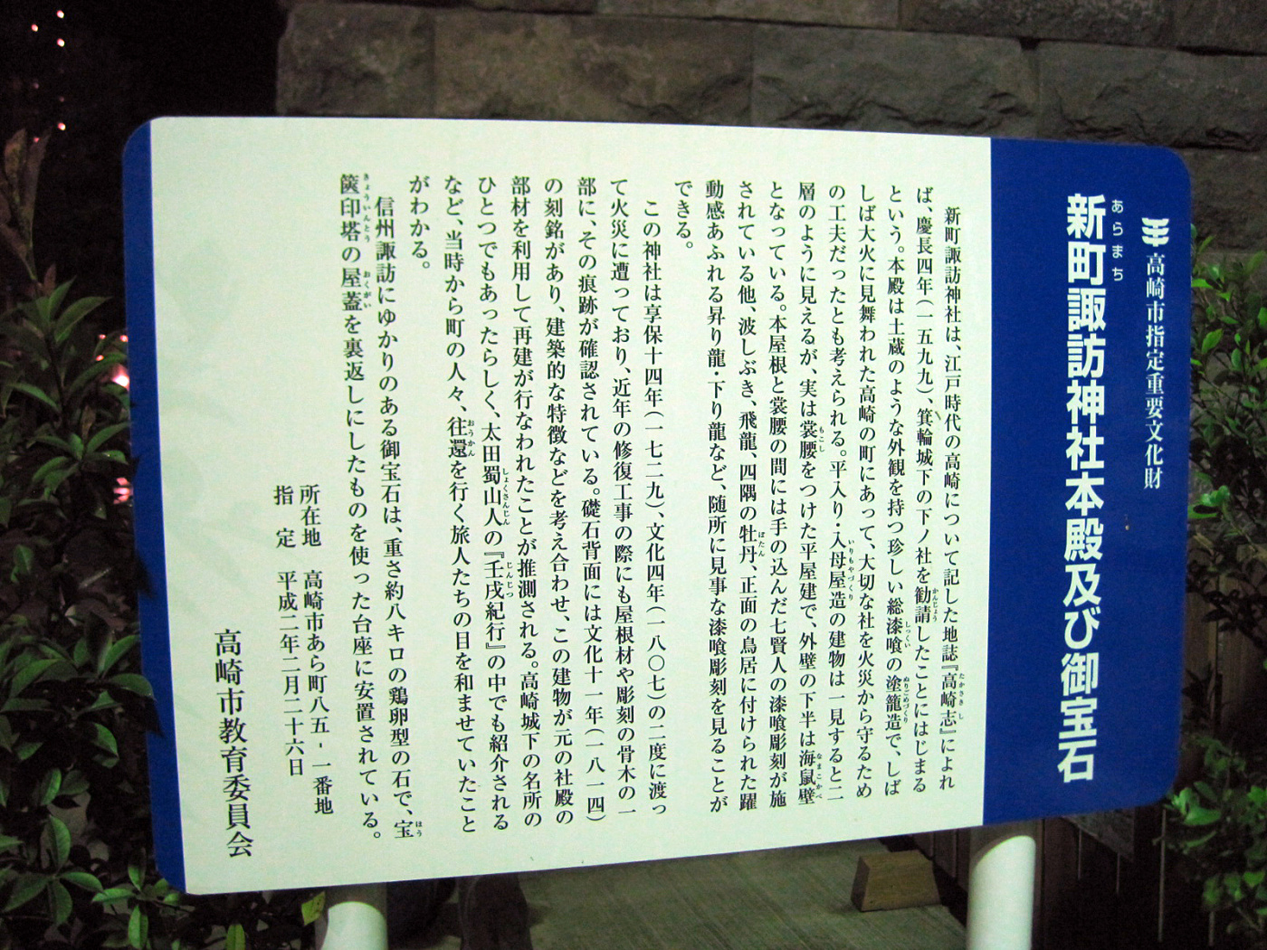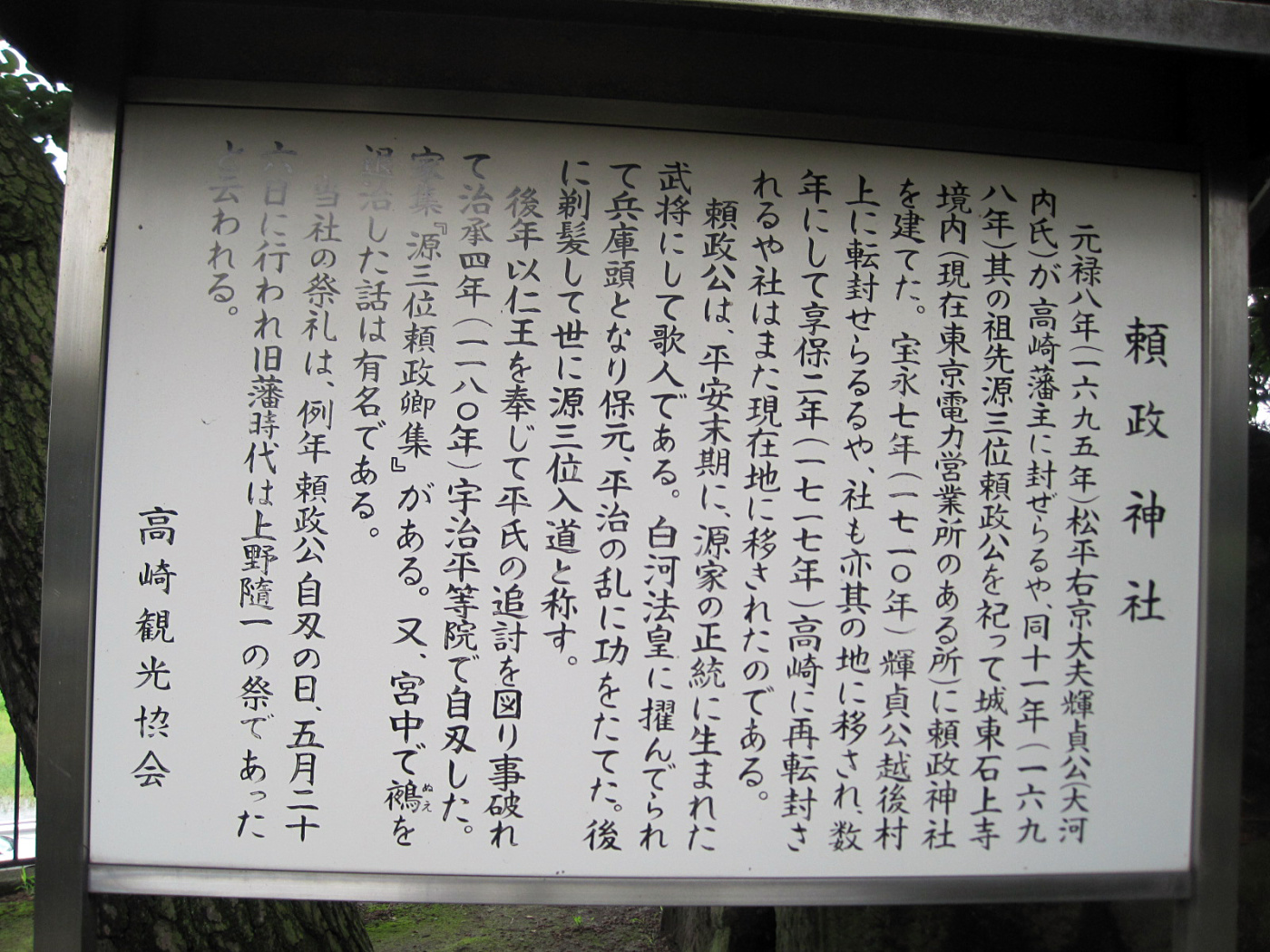 【高崎公園の南隣にある頼政神社は、高崎城主大河内輝貞が享保3(1718)年に建てたもので、社宝のうち稲妻の鎧(いなづまのよろい)、白銀造太刀(しろがねづくりのたち)、諸大名連歌帖、丁丑筆話が県および市の重要文化財に指定されています。丁丑筆話は、最後の高崎藩主大河内輝声と中国人の筆談の記録で明治10(1877)年のものです。】といった情報もありました。