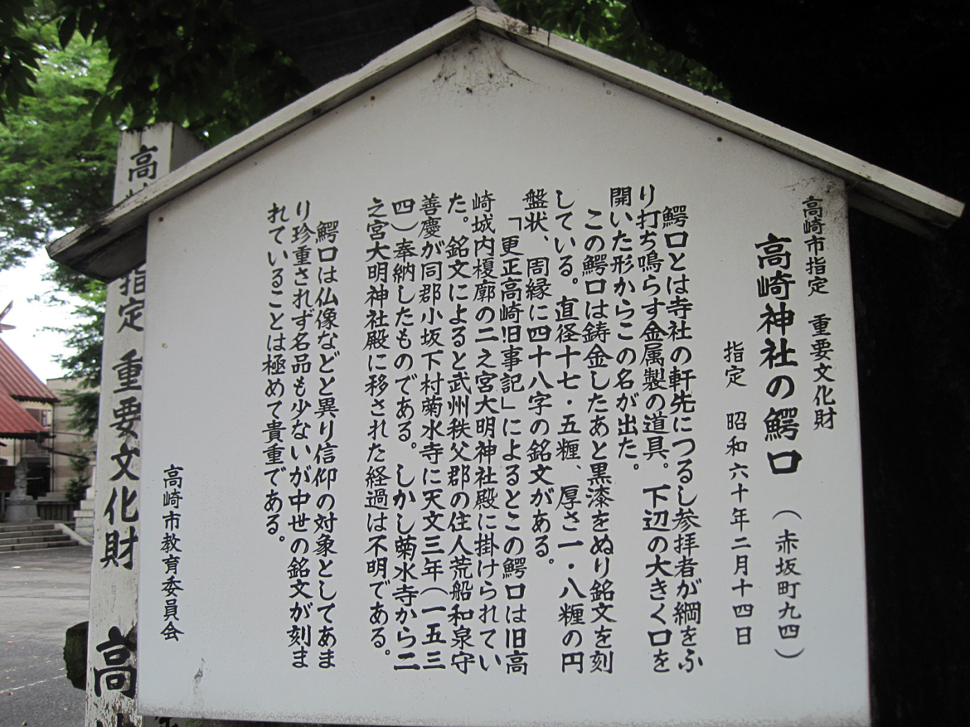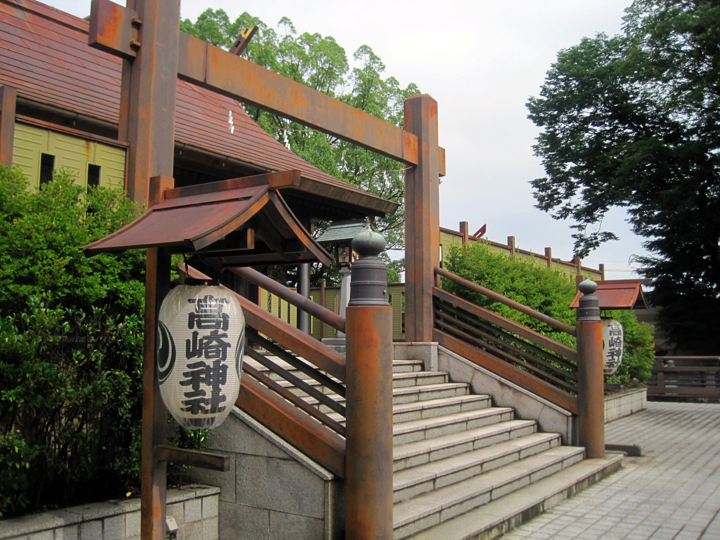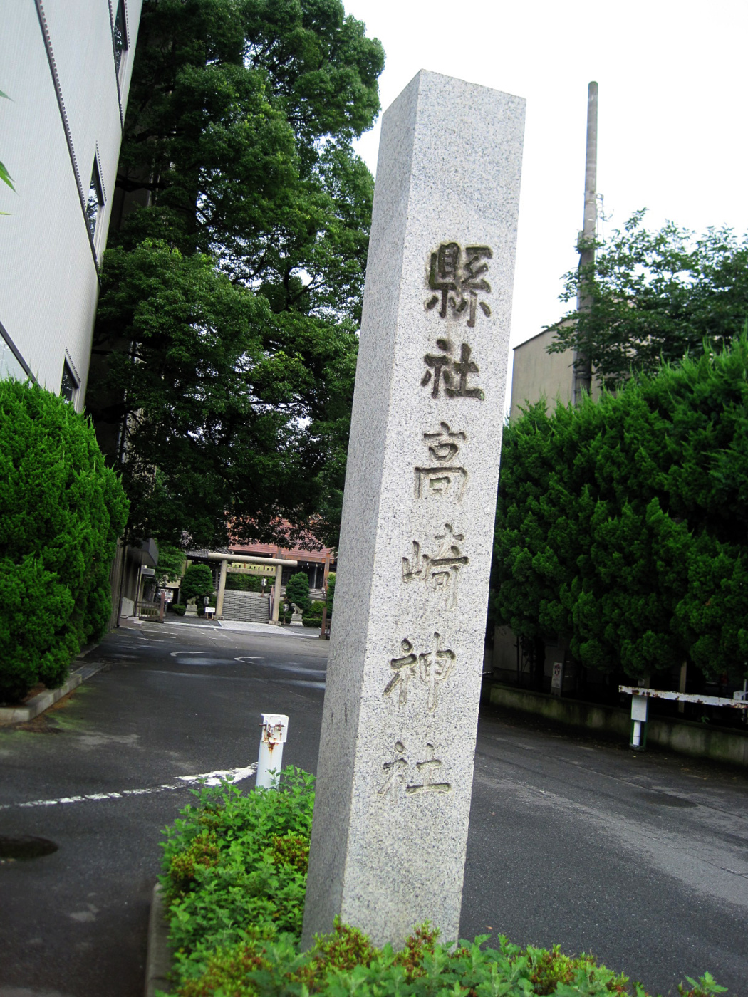 【社伝によると、後嵯峨天皇の寛元元年(1243 年)、上野国和田城主であった和田小太郎正信が、相模国三浦郡の熊野権現を城中に勧請し、「熊野神社」と号したのが創建とされる。その後、慶長3年(1598年)に井伊直政が上野国中12万石を拝領して高崎城を築城する際、この熊野神社を現在地に遷座し、高崎総鎮守とした。明治3年(1870年)に村社に列し、同18年(1885年)に郷社に昇格、同40年(1907年)以降、境内末社12社と高崎市内の36社を漸次合祀して行き「高崎神社」と改称、大正14年(1925年)に県社となった。】という由緒です。