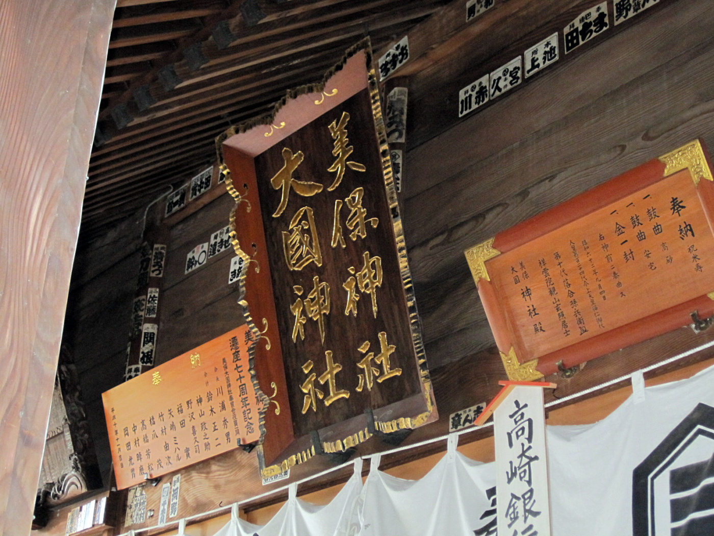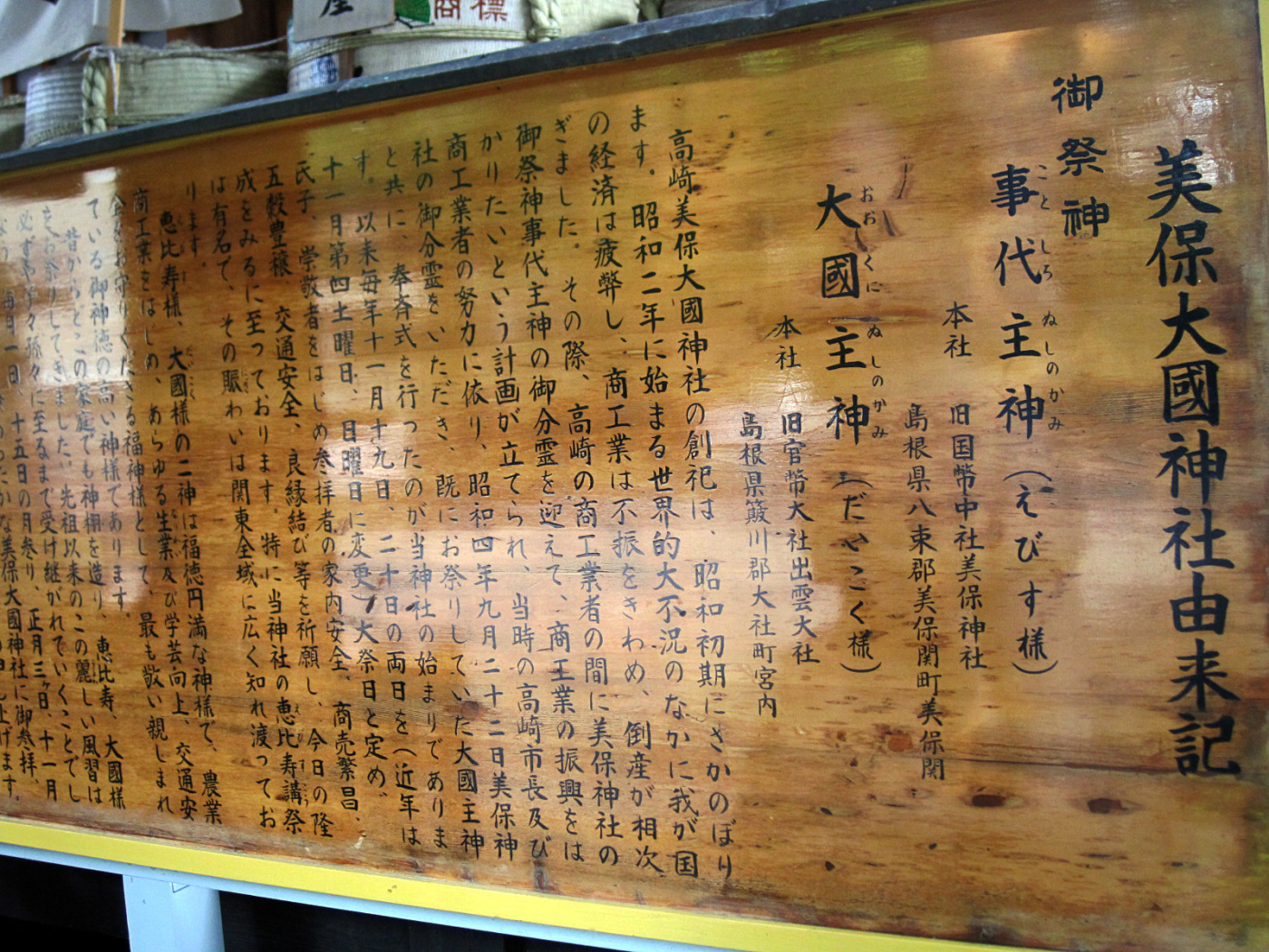 【事代主神と大国主神を祀る。昭和4 年(1929 年)、折からの世界的大不況のなかで苦しんでいた高崎市内の商工業者が、事代主神を迎えて商工業の振興を図りたいと、同年9月22日に島根県の美保神社から分霊を勧請し、大国主神と共に祀ったのを始めとする。例年11月の第4土曜日と翌日曜日を美保大國神社の例祭日とする。】です。
