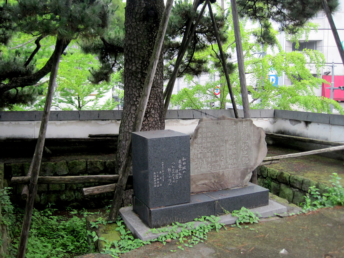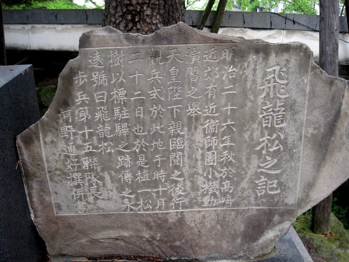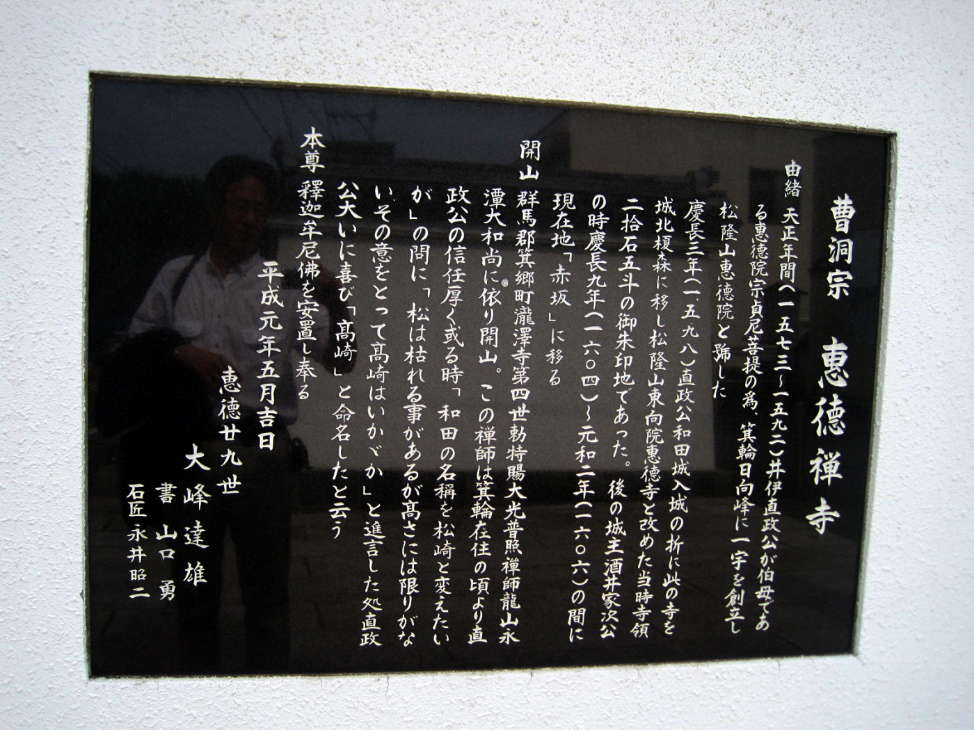 【高崎神社のすぐ隣に曹洞宗 恵徳禅寺がある。由緒によれば、[この寺は井伊直政の伯母である恵徳院宗貞尼菩提のため、箕輪日向峰に一宇を創立松隆山恵徳院と号した。慶長三年(1598)井伊直政公が高崎城入城の折、この寺を城北榎森に移し、松隆山東向院恵徳寺と改めた当時、寺領20石五斗の御朱印地であった。 ――中略――この寺の禅師は井伊直政公の信任厚く「和田の名称を松崎に変えたいが」の問いに、禅師は「松は枯れることがあるが高さには限りがないその意をとって高崎はいかが」と進言したところ、直政公大いに喜び「高崎」と命名した]という。高崎の地名の由来が碑文となっている。】というサイトがありました。成るほど・・です。