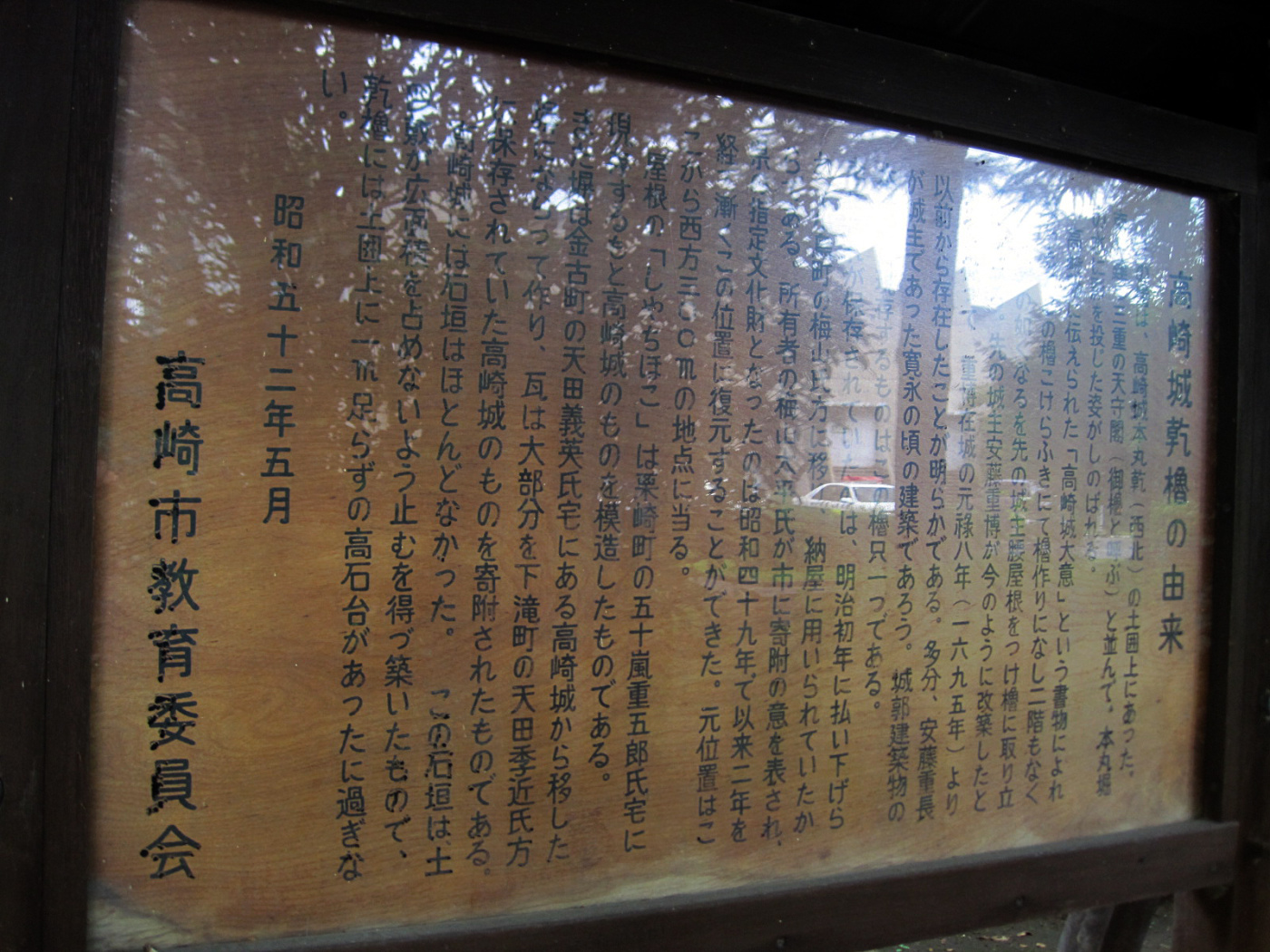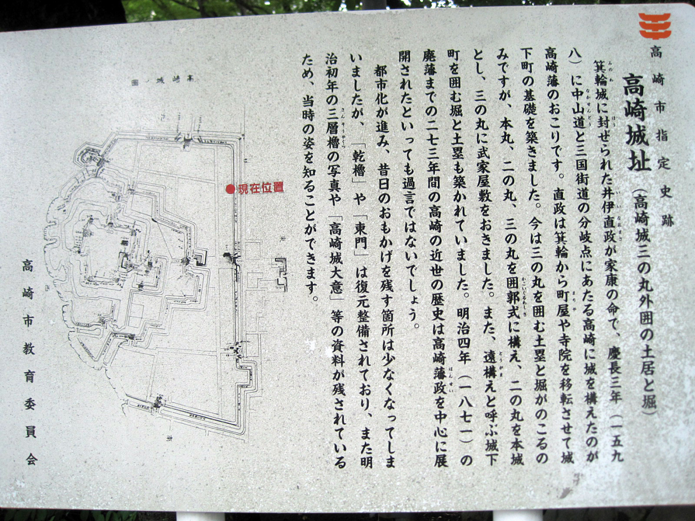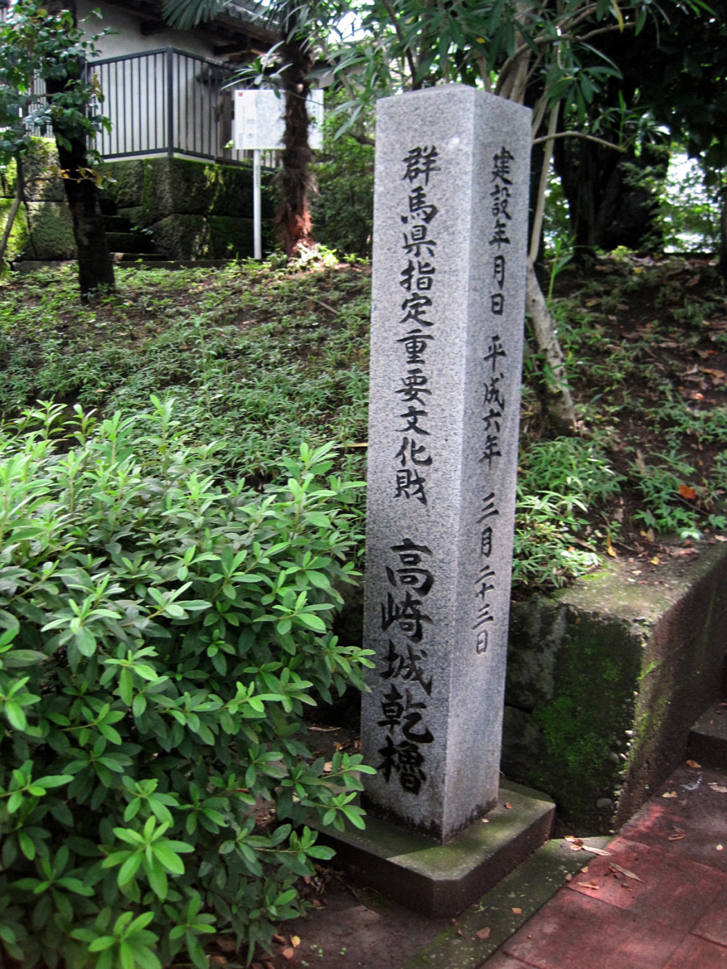 【高崎城は烏川に沿って築城された輪郭梯郭複合式の平城である。本丸には御三階櫓(天守)と乾(いぬい/北西)、艮(うしとら/北東)、巽(たつみ/南東)、坤(ひつじさる/南西)の4基の隅櫓があった。現存するのは乾櫓(県重文指定)のみである。本丸を囲むように、西の丸、梅の木郭、榎郭、西曲輪、瓦小屋があり、二の丸、三の丸が梯郭式で構えられていた。城の周りは土塁で囲まれ、石塁はほとんど造られなかった。かつて城内には本丸門など16の門があり、通用門として使われていた東門(市の重要文化財)だけが移築復元されて現存している。また、三の丸土塁と水堀は現在の町並みにも活きており、当時の面影を今に伝えている。】だそうです。