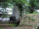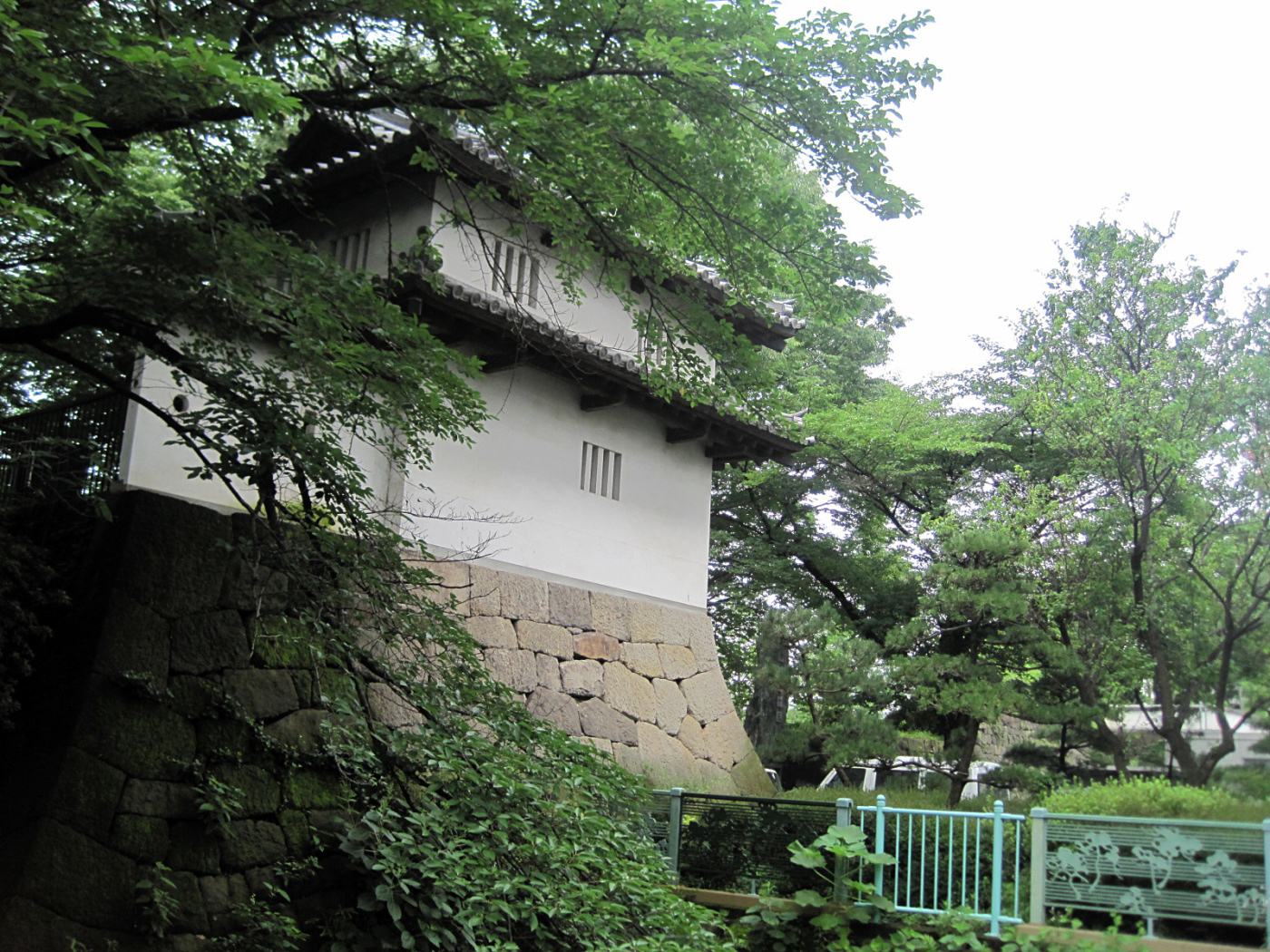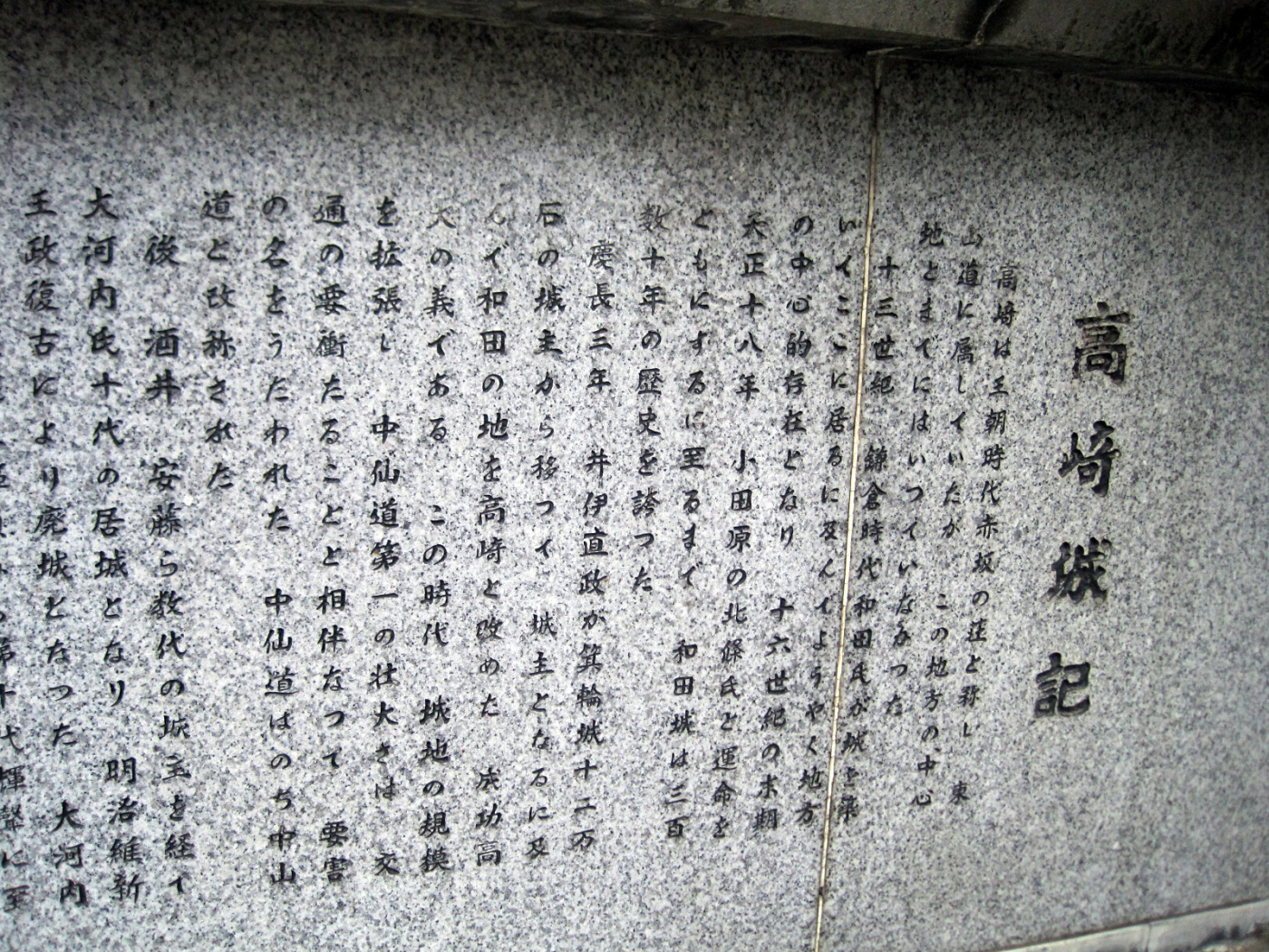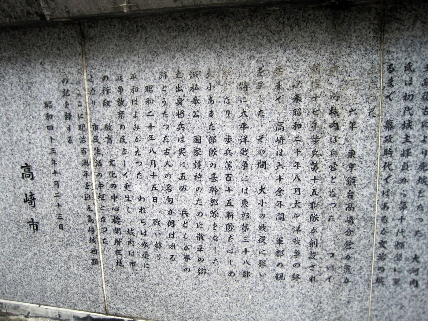 【高崎城は烏川に沿って築城された輪郭梯郭複合式の平城である。本丸には御三階櫓(天守)と乾(いぬい/北西)、艮(うしとら/北東)、巽(たつみ/南東)、坤(ひつじさる/南西)の4基の隅櫓があった。現存するのは乾櫓(県重文指定)のみである。本丸を囲むように、西の丸、梅の木郭、榎郭、西曲輪、瓦小屋があり、二の丸、三の丸が梯郭式で構えられていた。城の周りは土塁で囲まれ、石塁はほとんど造られなかった。かつて城内には本丸門など16の門があり、通用門として使われていた東門(市の重要文化財)だけが移築復元されて現存している。また、三の丸土塁と水堀は現在の町並みにも活きており、当時の面影を今に伝えている。】だそうです。