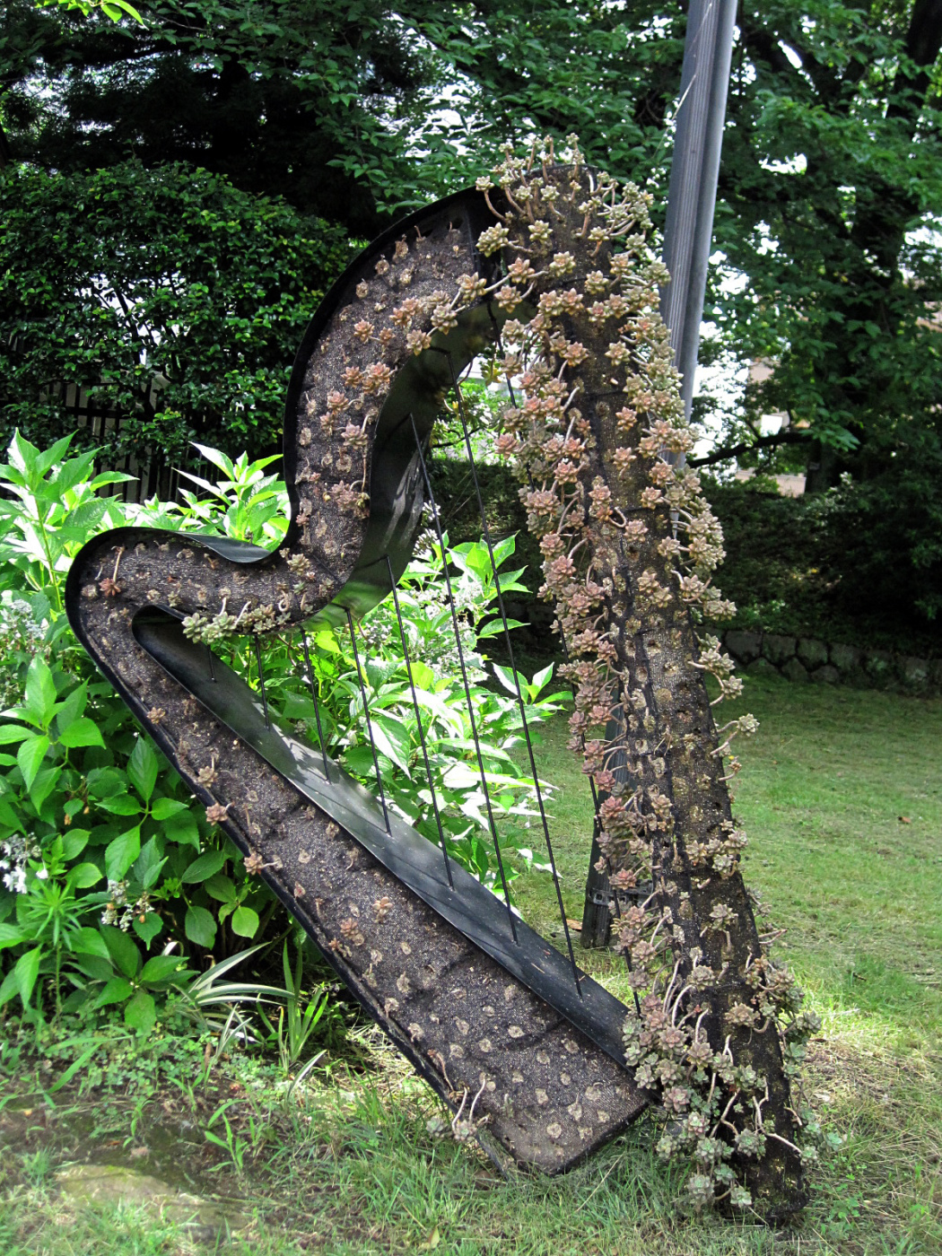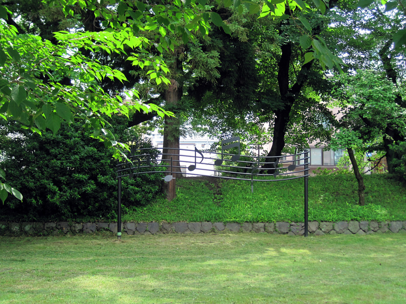 高崎市では、戦後まもなく市民オーケストラが誕生し、現在では群馬交響楽団を擁するなど、音楽・文化の普及と振興に努めている。この広場の周辺には、群馬音楽センターをはじめとする音楽関連施設があるほか、音楽のある街・たかさきを市のスローガンに掲げていることから、古代ハープをモチーフにしたモニュメントを中心に、音符をアレンジした舗装を施すなど、音楽をテーマにしたデザインで施工されている。また、施設のシンボル性を高めるために、モニュメントを高崎駅と市庁舎に対して並行に配置し、変則的な形を印象付けないよう、既存の歩道との一体性を図った。夜間のライトアップに際しても、柱状の照明灯を設けず、ベンチの下部・せせらぎに照明施設を配置し、広場を幻想的なムードに演出している。 整備にあたっては、地元の南銀座商店街まちづくり委員会と広場の整備方針やデザインなどの協議を行った。施設の名称については、周辺部を含めた雰囲気から考えてもらうため、完成から三か月後に一般公募を行い、地域住民で構成された選定委員会で決定された。】が,これです。