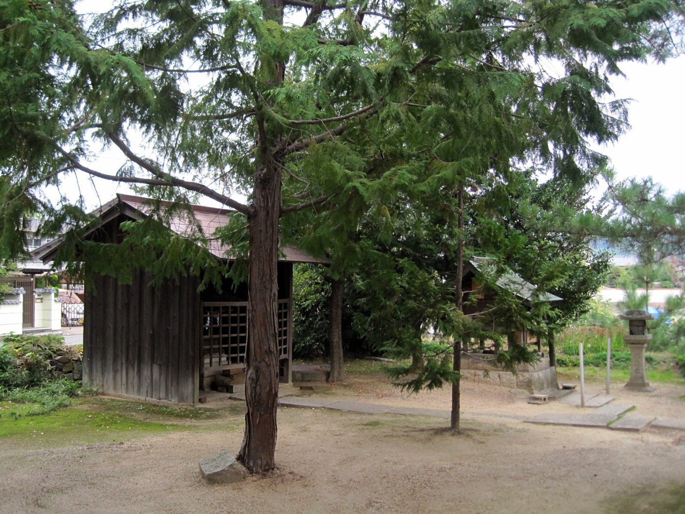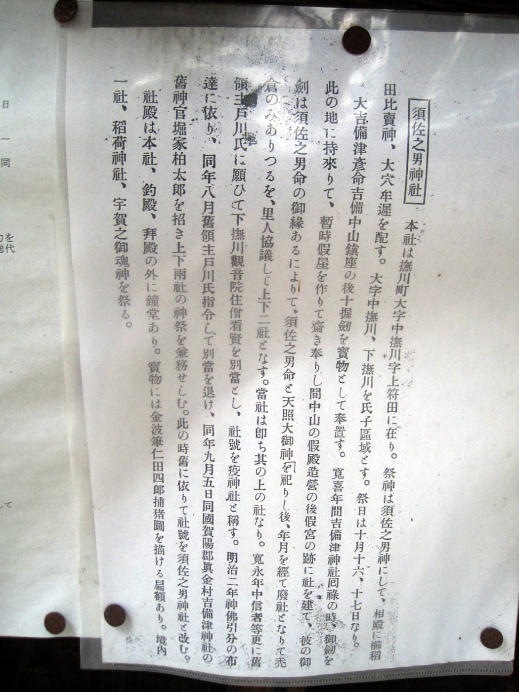 【由緒:往昔、吉備中山に大吉備津彦命鎮座後、十握剣を宝物として彼の社に納めた。寛喜年中(1229〜32)に彼の社が回禄の際、御剣を此の地に遷して奉斎した。御剣は彼の社に奉遷後、御剣の縁に依って須佐之男命・天照大御神を跡地に祭った。後、須佐之男神・櫛稲田姫神・大穴牟遅神を祭って上社とした。寛永年中(1624〜44)社号を疫神社とし明治2年現在の社名とした。 社殿は寛永6年(1629)、元禄3年(1690)9月、天保6年(1835)8月に夫々再興している。昭和31年8月、本殿炎上。同54年6月に本殿を改築した。】という情報もありました。