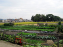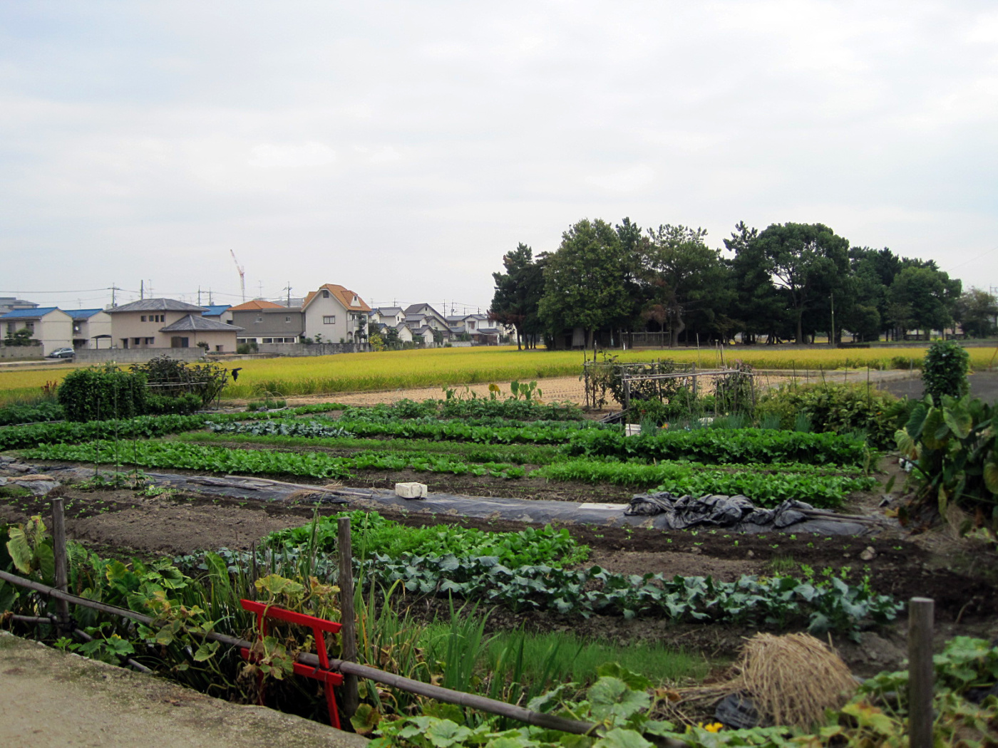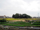 田圃の向こうのこんもりとした鎮守の森が八幡神社です。