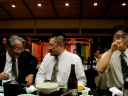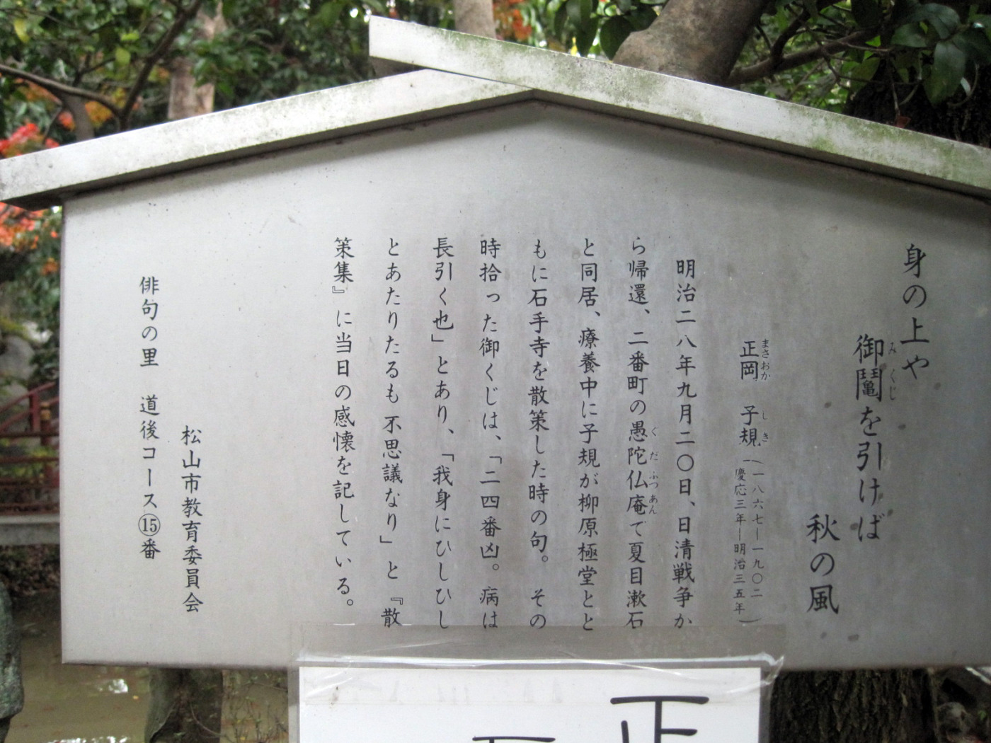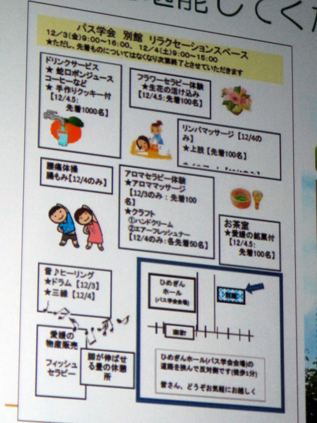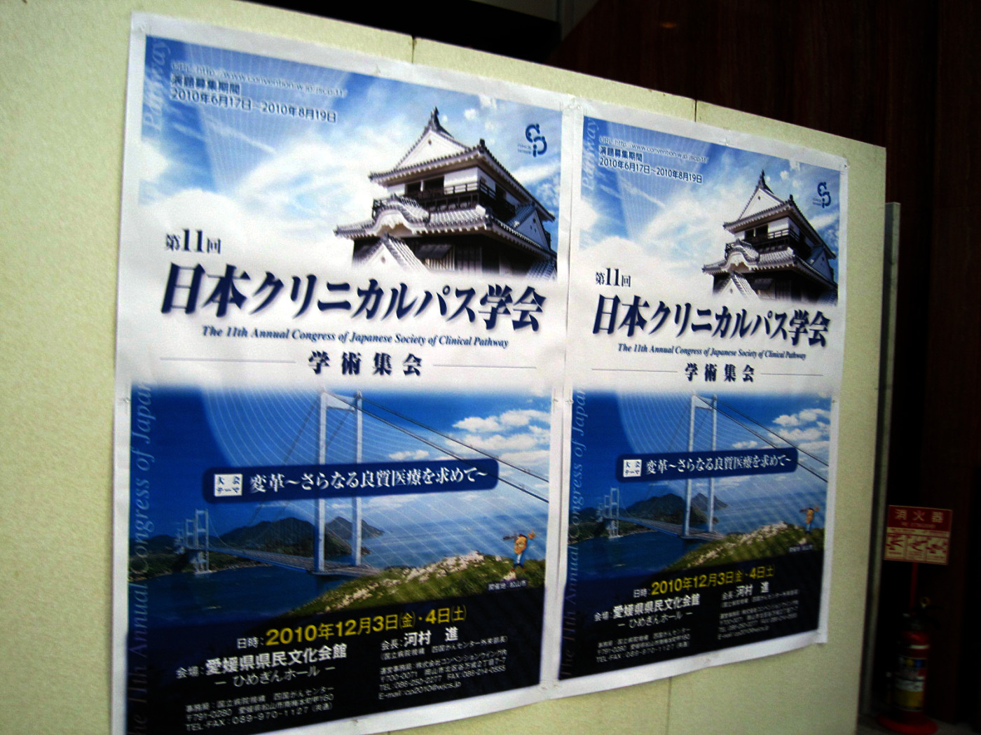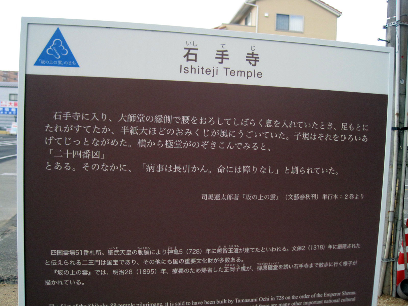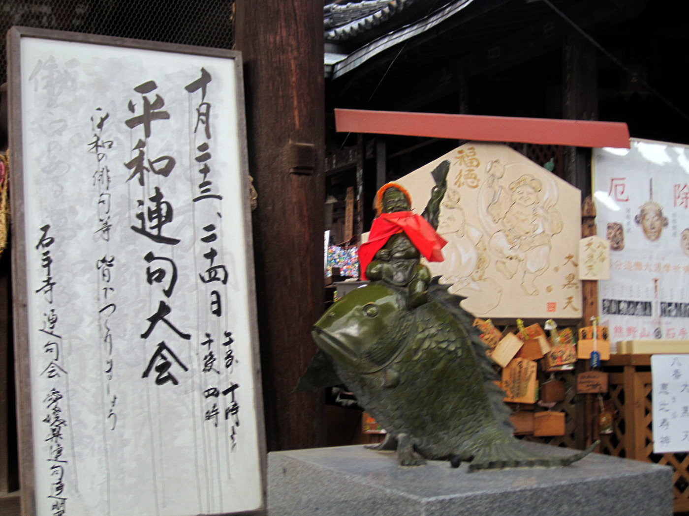 | 2010.12.3-4. 四国がんセンター 形成外科部長 河村進先生が会長で第11回日本クリニカルパス学会! っていうか,河村先生! 附属高校〜大学〜研修の間の同級生だし!! で,大槻は,懇親会でのピアノマンとして,かつ,自作曲披露役として招聘してもらえました。 前日の12/02に松山入り・・・他のメンバーとリハーサルと打ち合わせでした。 MONKさんってジャズライブハウスでした。(写真は,参加しなかったクリパス学会のバンドの様子) 会長招宴も道後大和屋さんで,堪能させて頂きました。感謝! 感謝! 会長挨拶で同級生が話しているってすごいですね!感動! 感動! 御馳走をたっぷりと頂戴しました。 熊本済生会病院院長の副島先生もフリーティストで,Jazz コンボで演奏御一緒しました。御挨拶もされます。 中川先生とも話していましたが,宴が始まって5分くらいで皆がビール瓶片手に歩きだすって,なんと和気藹々な学会なのでしょう! 能舞台があったり,素晴らしいお宿でした。 また,宿泊させていただいた「道後やや」さんは新しいホテルですが,綺麗な・・・そうか,温泉宿の今! って感じで,感動しました。 さて,2日は雨でしたが,学会開始の朝は,晴れ間が覗きました! そして最初は会長講演です。 河村先生の会長講演を楽しく拝聴しました。 会場はひめぎんホールを中心に,4か所位だった様で,すごく大きな学会です。 さて,懇親会が,大槻には本番(それとその後の二次会ですね) saxの松田先生は,地元でもライブなどされてらっしゃるそうです。 同級生,河村会長と! 会長招宴の後・・・大和屋さんから宿舎へ! 道後温泉(本館)は,「千と千尋」の湯屋のモデルだそうです。 そしていくつかの温泉内の湯がありました。 【椿の湯(つばきのゆ)道後温泉本館の姉妹湯として昭和28年に新設され、昭和59年に改築されました。昔、聖徳太子がこの地に咲き誇る椿の美しさを褒め称えたという言い伝えから名付けられた「椿の湯」は、鉄筋のモダンな建物で、壁面には窓から湯と椿が流れ落ちる「からくり絵」が描かれています。】です。 さて,会長講演を聞かせてもらった後は,大槻は・・・それでも松山観光もさせてもらいました。 丁度銀杏が・・・そして松山の街には銀杏並木が一杯でした。 ただ・・・・丁度,荷物を12/03の宿舎に預けに行く間,暴風雨! もう,折畳傘の骨は曲がるし,ズボンはびしょぬれだし,大変でした。 松山駅近くの宿(12/04は6:14発に乗車予定だったので)に荷物を預けて・・・坊っちゃん列車も見ました。 市内電車で・・・道後公園/湯築城址まで行きました。 ぐるりと回って,再現武家屋敷の辺りに行きましょう! 資料館では,湯築:河野氏のヴィデオも見せて頂きました。 そして,道後公園/湯築城址から,更に東へ/奥へ・・・石手寺を目指しましょう! 石手寺に来たのですが,ちょっと横道から境内にはいってしまいました。 そして,鐘楼の辺りへ・・・。 さて,云わば正門から入る・・みたいにしましょう! 第51番札所! 門前には市もありました。 大きな草鞋もありました。 【訶梨帝母天堂:訶梨帝母尊(鬼子母神)を祀る堂。鎌倉末期。妊婦は堂周りの石を持ち帰り、無事に出産すると石を2つにして返すという風習がある。重要文化財。】 本尊真言:おん ころころ せんだりまとうぎ そわか ご詠歌:西方を よそとは見まじ 安養の 寺に詣りて 受くる十楽】 だそうです。 道後温泉の方へ戻る(懇親会前のリハーサルの時間になってきています)途中には,こんな様子も。 区々には,俳句の碑なども(俳句道ってなっていました)・・・。 そして,道後温泉に向けてですが・・・。熟田津の道だそうです。 お湯の石があります。 その廻りには,句碑が沢山。 その帰りのイルミネーションです。 ちなみに往路は高速バス:マドンナエキスプレスでした。 動画です(大学と瀬戸大橋) |