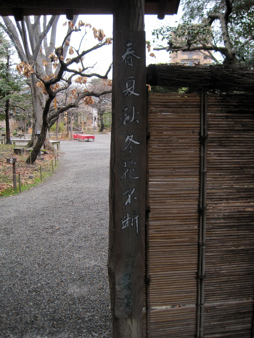 【江戸の町人文化が花開いた文化・文政期(1804〜1830年)に造られた庭園。庭を造ったのは、それまで骨とう商を営んでいた佐原鞠塢。交遊のあった江戸の文人墨客の協力を得て、旗本、多賀氏の元屋敷跡である向島の地に、花の咲く草花鑑賞を中心とした「民営の花園」を造り、開園しました。】ということだそうです。