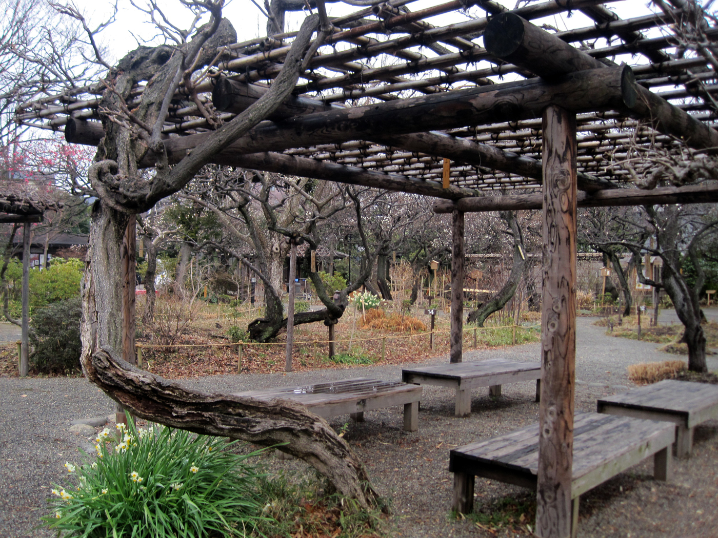 【開園当初は、360本のウメが主体で、当時有名だった亀戸の清香庵字臥竜梅の梅屋敷に対して「新梅屋敷」と呼ばれたほどです。その後、ミヤギノハギ、筑波のススキなど詩経や万葉集などの中国、日本の古典に詠まれている有名な植物を集め、四季を通じて花が咲くようにしました。「百花園」の名称は、一説では、「梅は百花に魁けて咲く」または「四季百花の乱れ咲く園」という意味でつけられたものです。】そうですか,やはり梅ですか!