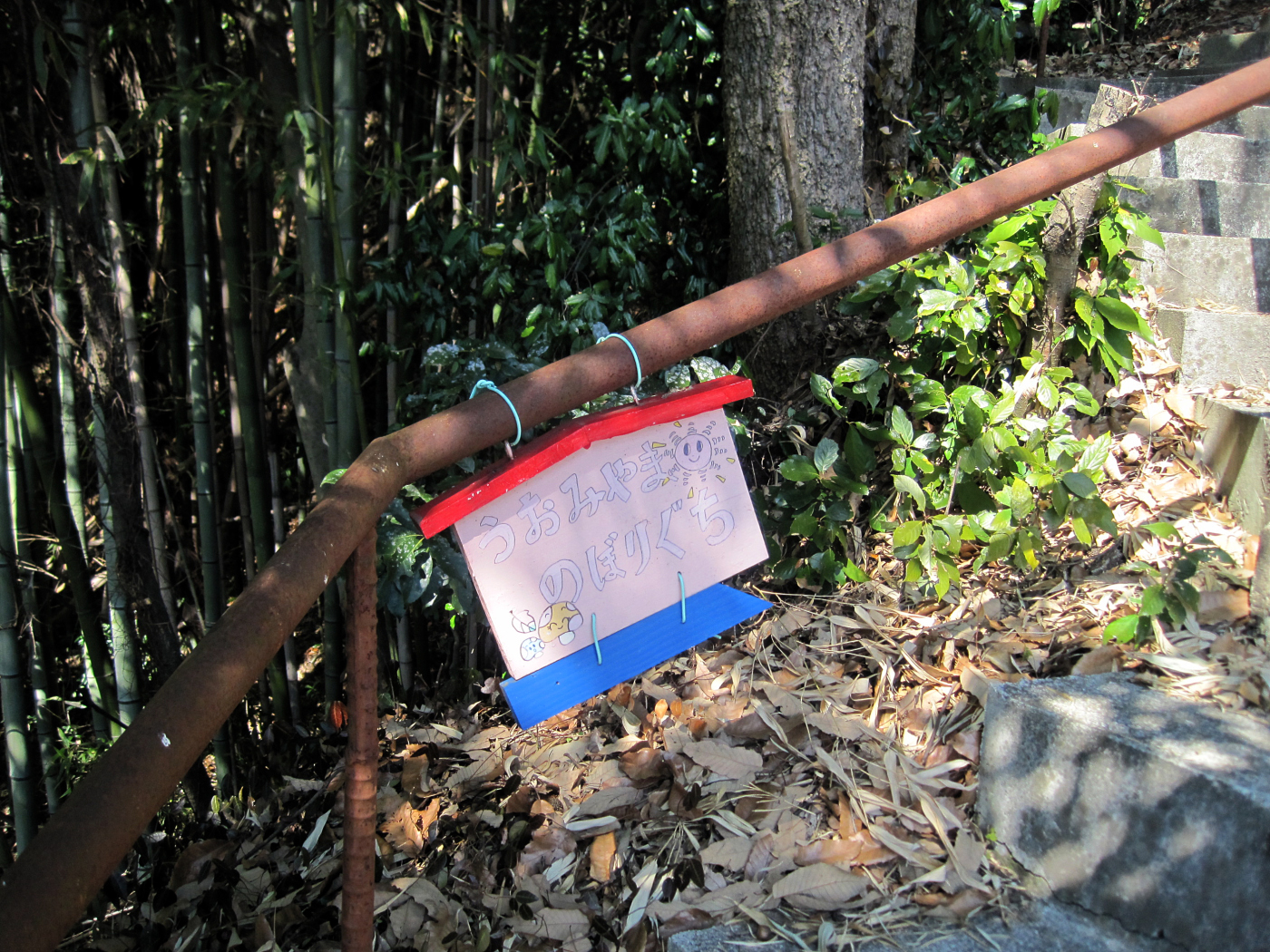地図では,裏山は「矢坂山」132mとなっていますが,子ども会か小学校の児童さんが書いた案内板には「うおみやま のぼりぐち」って書いてありました。