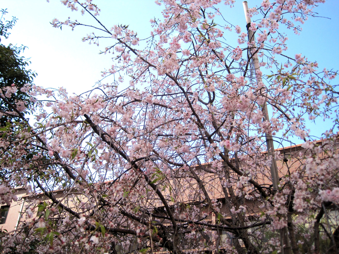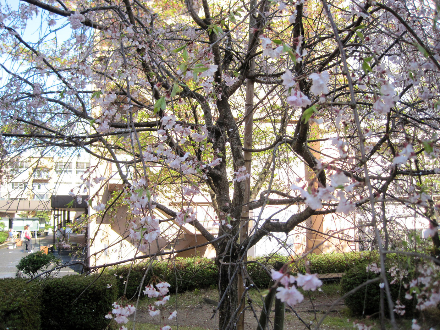 中庭の桜は多くは葉桜になっていましたが・・・しだれ桜は,まだ,しっかりと咲いていました。