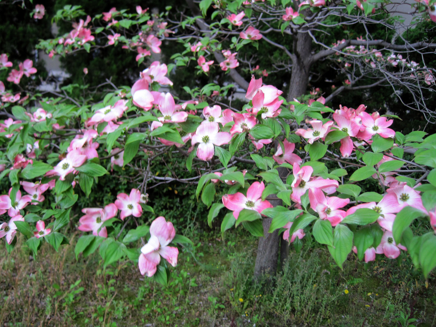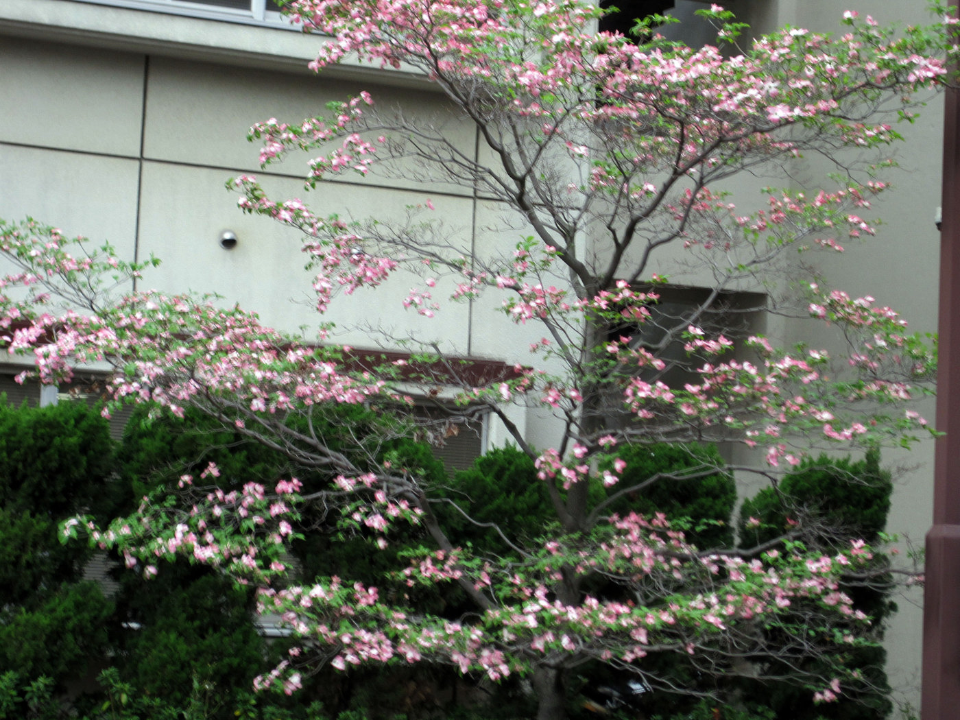 一昨日,メディカルテクノの講演で伺った時の八重桜は,だいぶ,葉が増えてきていました。そして,また別のハナミズキも・・・。