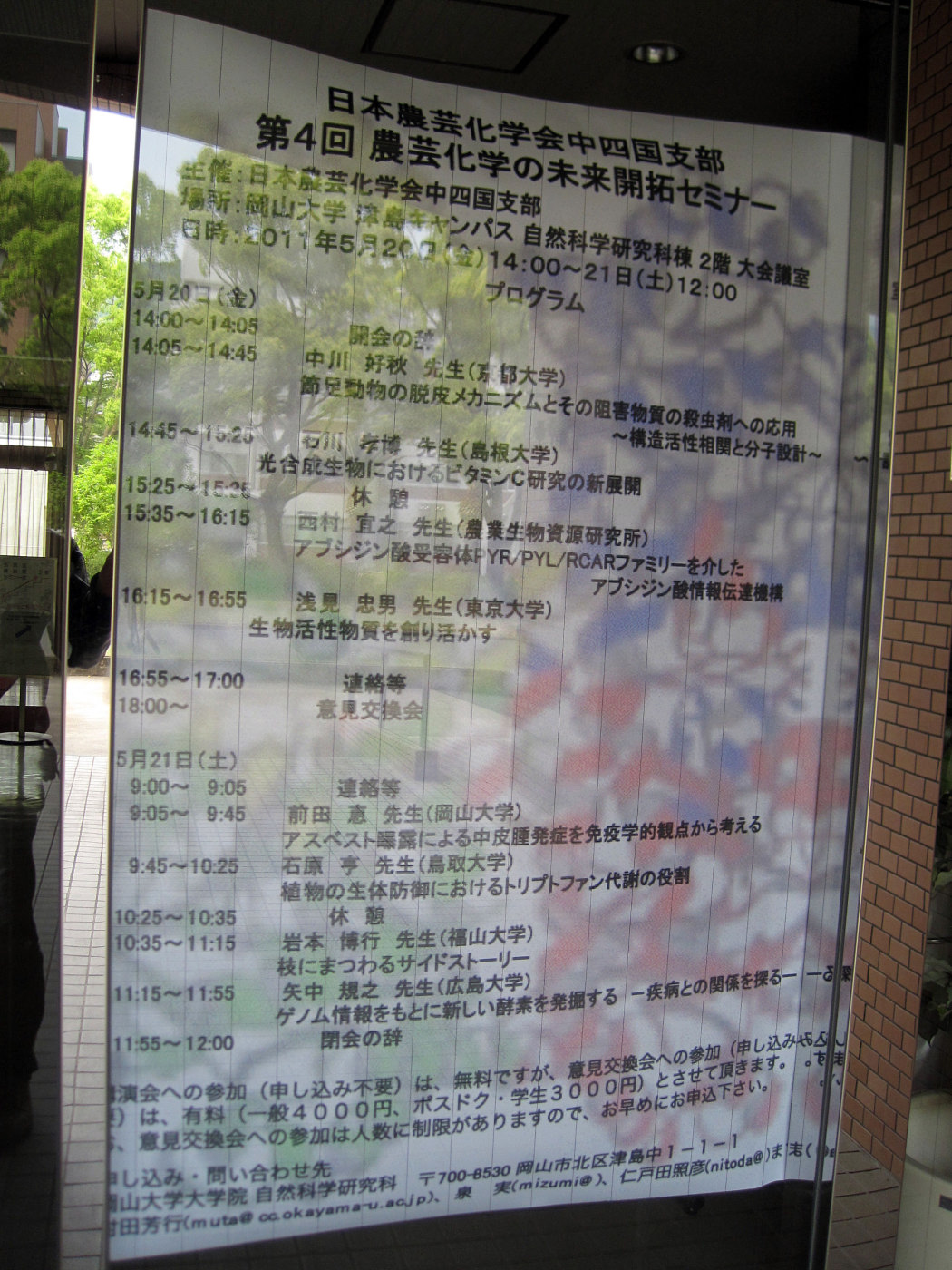 3月までうちの教室で頑張ってくれていた前田先生が,日本農芸化学会中四国支部 第4回農芸化学の未来開拓セミナーでうちの教室での仕事を紹介してくれました。