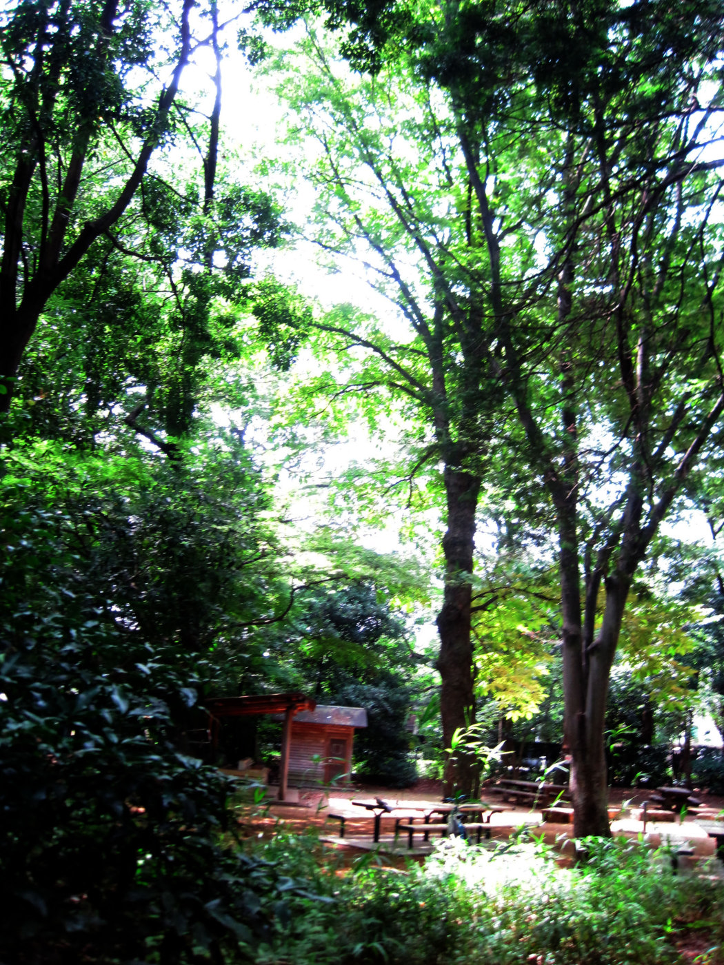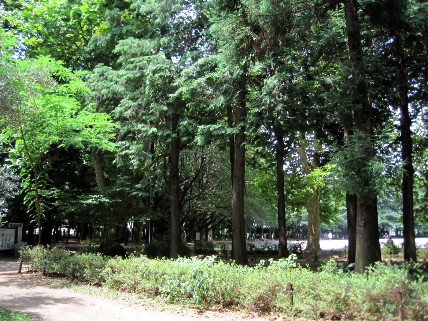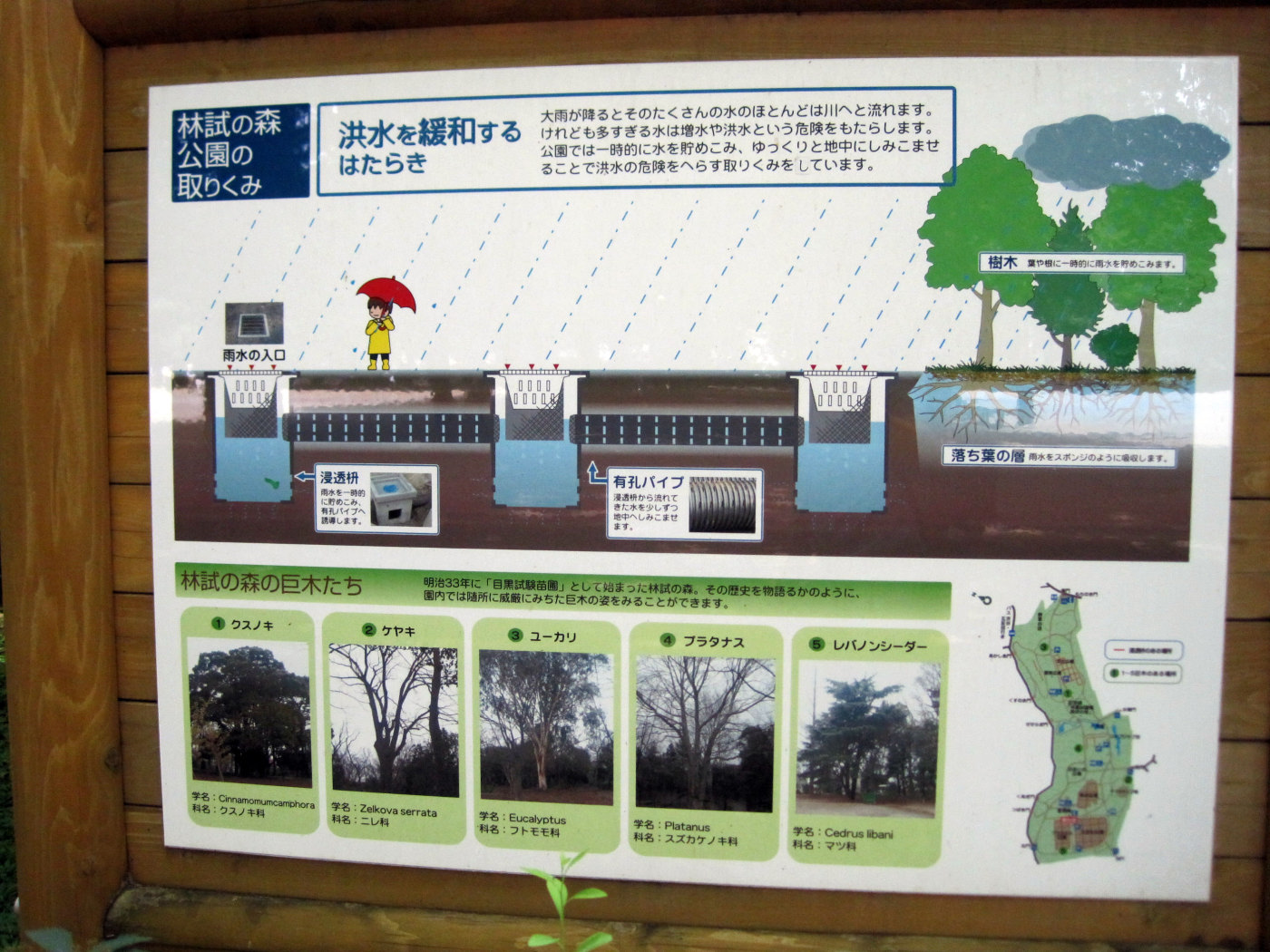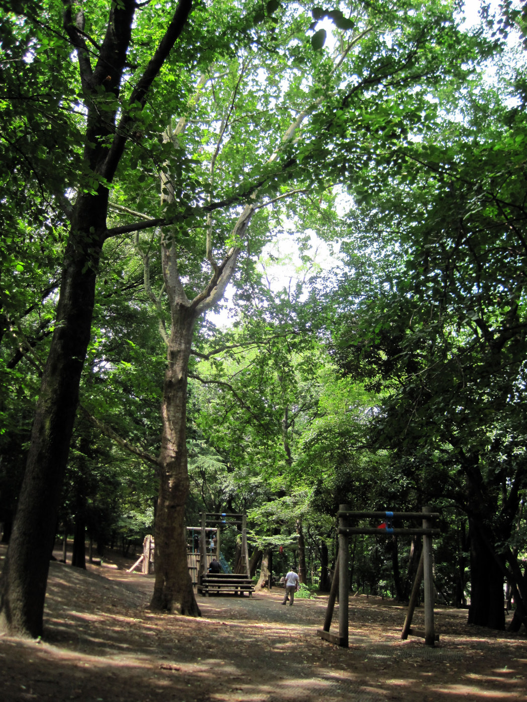 【園内:林業試験場当時の樹木がそのまま残されており、都内でも屈指のケヤキ、クスノキ、プラタナス、ポプラ、スズカケノキなどの巨木がある。その他、カイノキ、ベニカエデ、ヒマラヤゴヨウ等の外国産樹木やアベマキ、ハナガガシ、ニオイドロ等の珍しい木などもあり解説のプレートもつけられている。園内で最も太い木は幹周が3.82メートルのケヤキ。最も高い木は高さ35.5メートルのポプラ。大木の揃った森の他、芝生広場、デイキャンプ施設、夏期に子供が入れるじゃぶじゃぶ池、西側には野球やサッカーの練習(要申込で試合は不可)にも使用できるグラウンドも整備されている。】ということです。