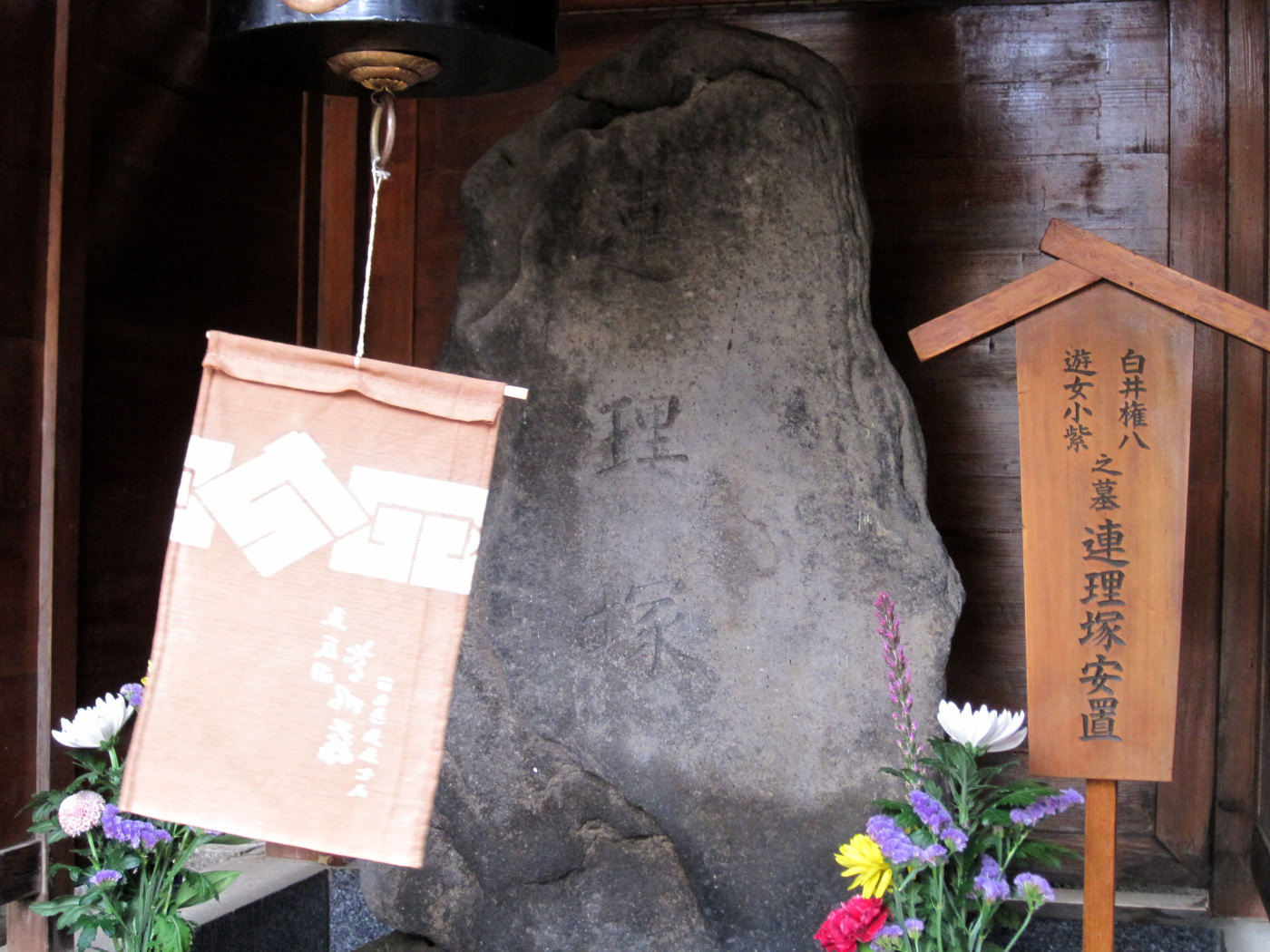 そして,「連理塚」:【皆様ご存知の白井権八、小紫の墓所で、 目黒にあった虚無僧寺が廃寺になりそこにあった墓を明治19年に、 檀徒の要請により移転したもので、 位牌等があったが、