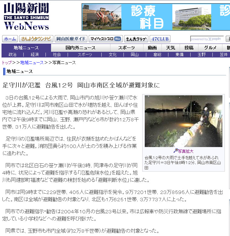 その後,倉敷市と岡山市の境界の辺りを通過・・・岡山市南区では,足守川が氾濫,また旭川も上流のダムの放流もあってか,氾濫危険水域にまで至り,岡山市では避難勧告も出た様です。うちの教室の先生も近くの小学校に避難したとか。
