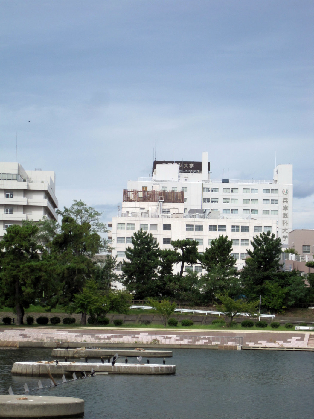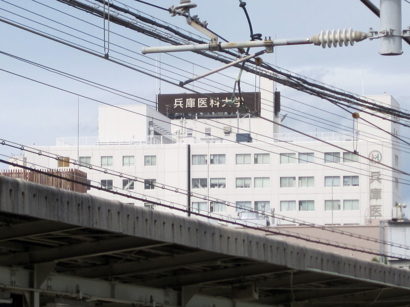 兵庫医大の建物と看板がよく見えます。