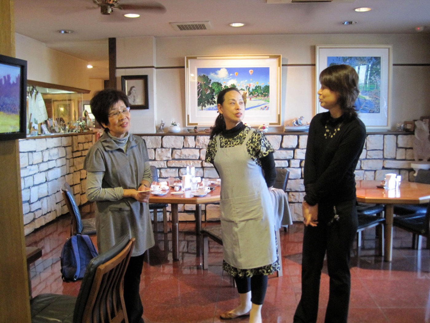 黒い衣装が児島さん,まんなかのエプロン姿は,お店のオーナーさん(本学OXO学▽▲▽教授と小学校の同級生だとか)