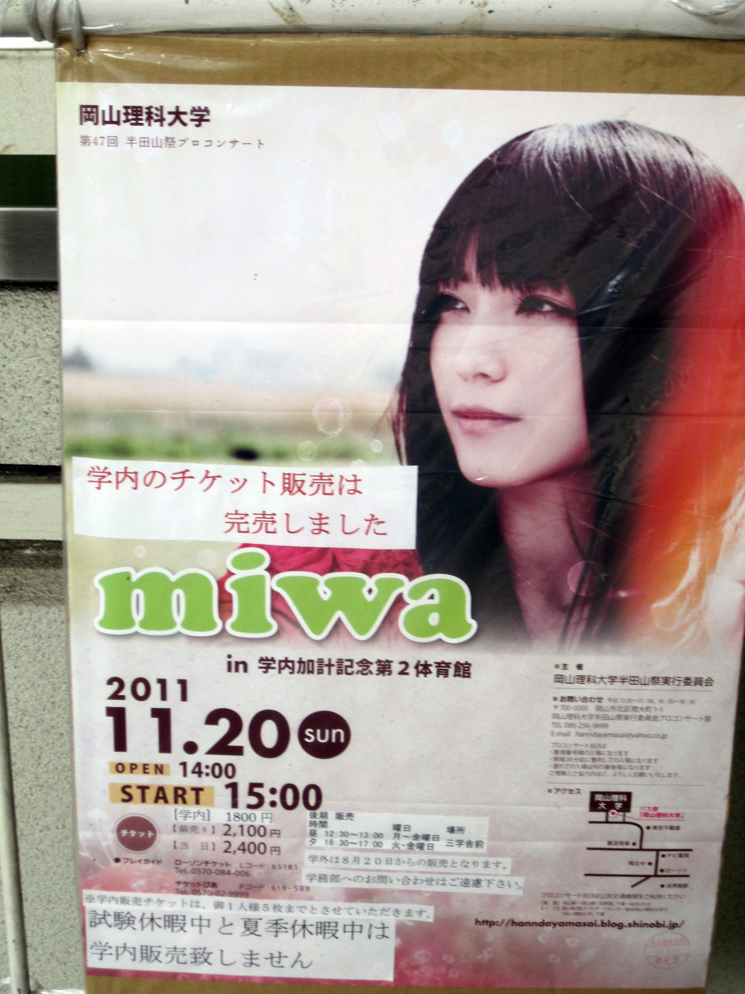 へぇ,大学祭のプロコンサートは「miwa」さんなんですね。